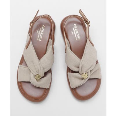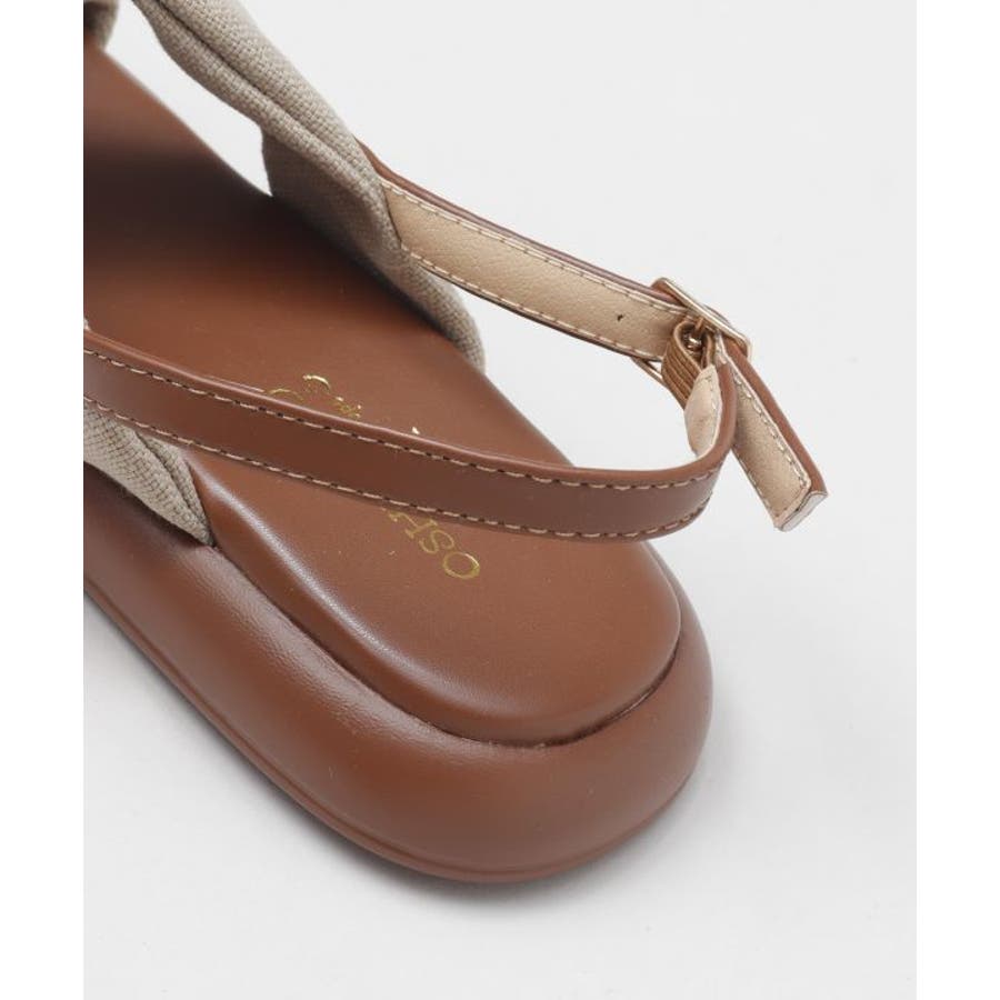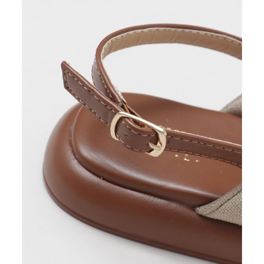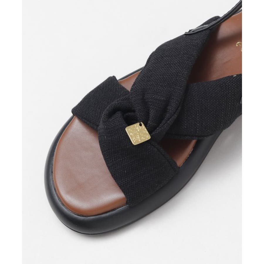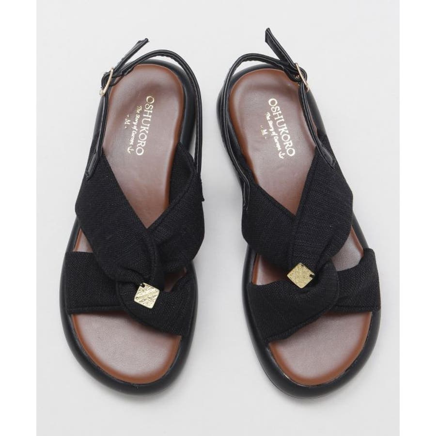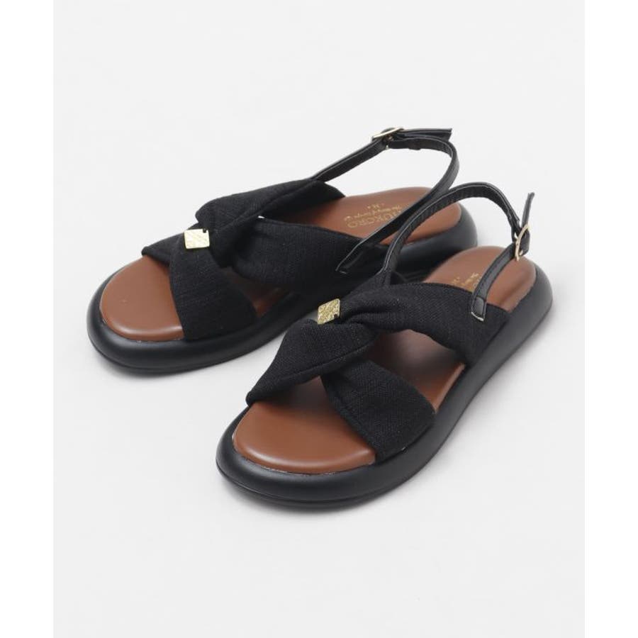 シンプルなカラーの生地を使用した、リボンの真ん中にメタルチップがついたデザインのサンダル。甲の布地はふかふかで広めなことで抜群の安定感。ソールには軽量素材を使用しており、疲れにくいのもポイント。