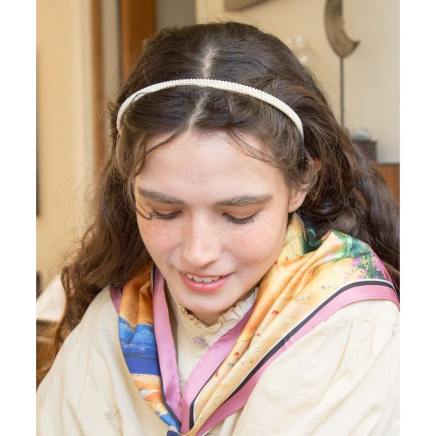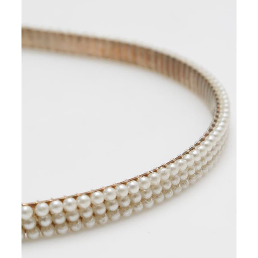 小粒パールを連ねたカチューシャ。上品な光沢が控えめながら存在感を放ち、シンプルなコーデにも華やぎを添えます。日常使いからお呼ばれまで幅広く活躍。