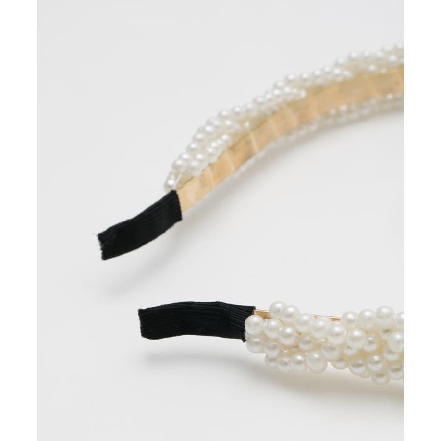 存在感のある幅広デザインが印象的なパールカチューシャ。編み目に大小のパールがリズミカルに並び、ヘアスタイルをモードに格上げ。特別な日にも映える主役級アイテム。