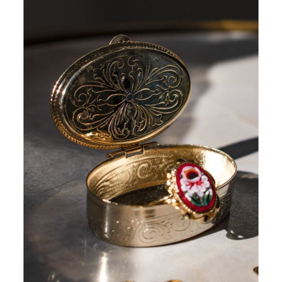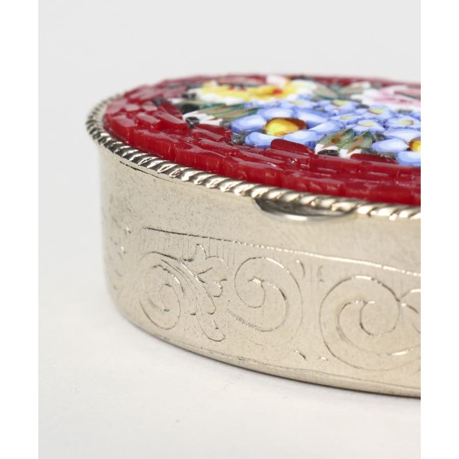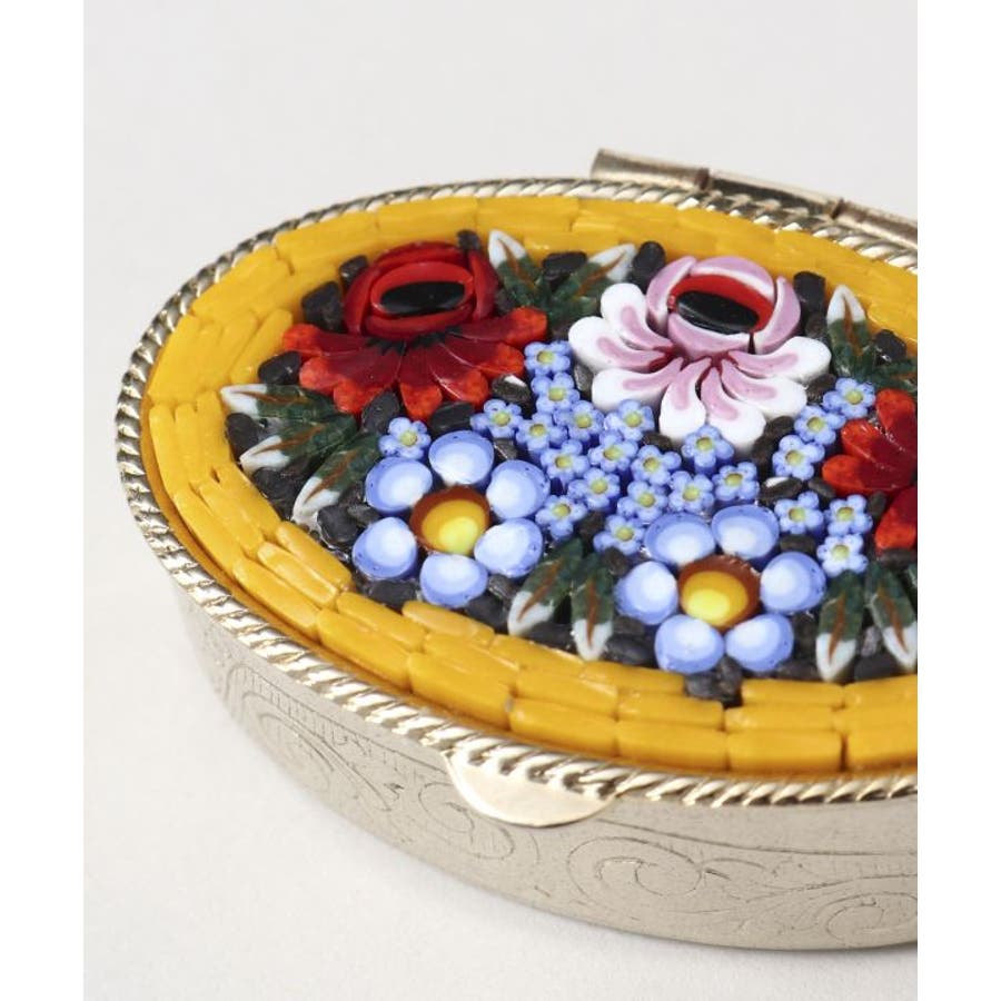 息を呑むほどに美しい、イタリア・ベネチアの伝統技法「ガラスモザイク」を贅沢にあしらったオーバル型のピルケース。1mmほどのガラスをフレームにはめ込んで、お花などの模様を表現しています。昔ながらの職人の繊細な技が光ります。毎日使うものだから、とっておきのひとつ