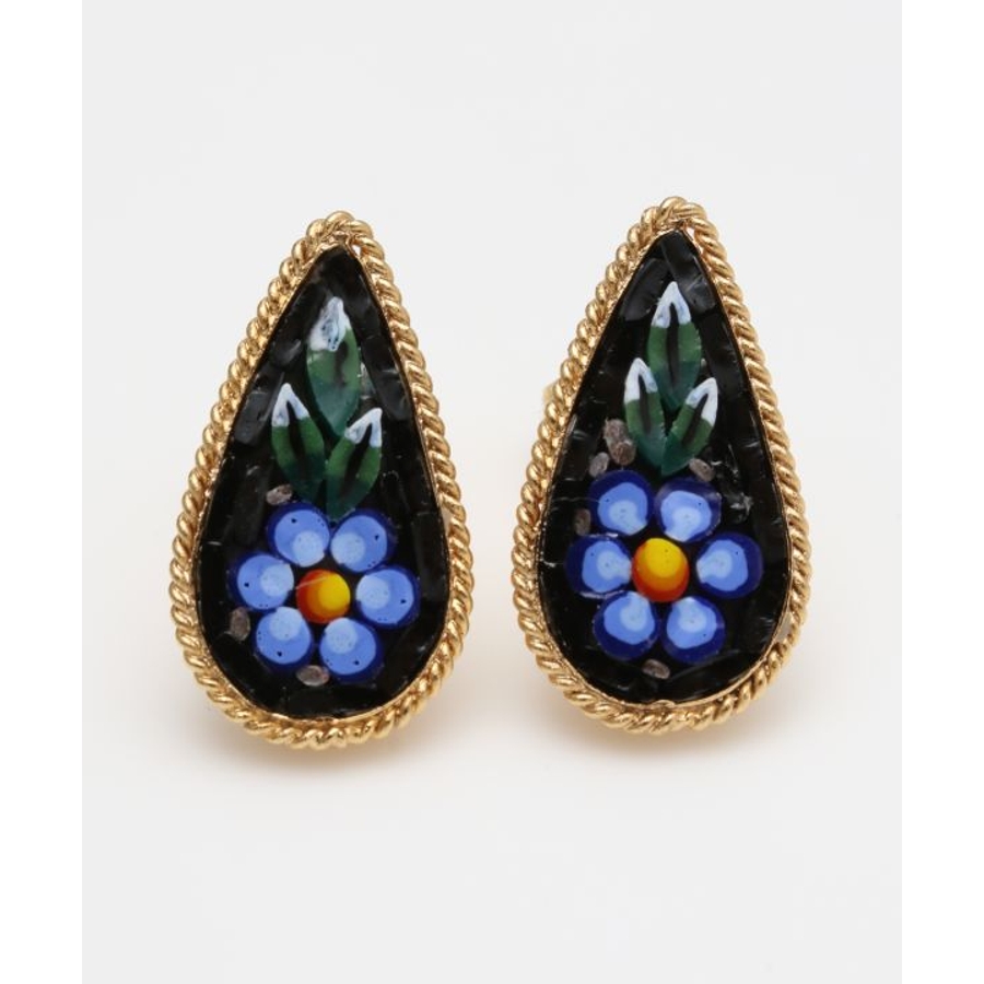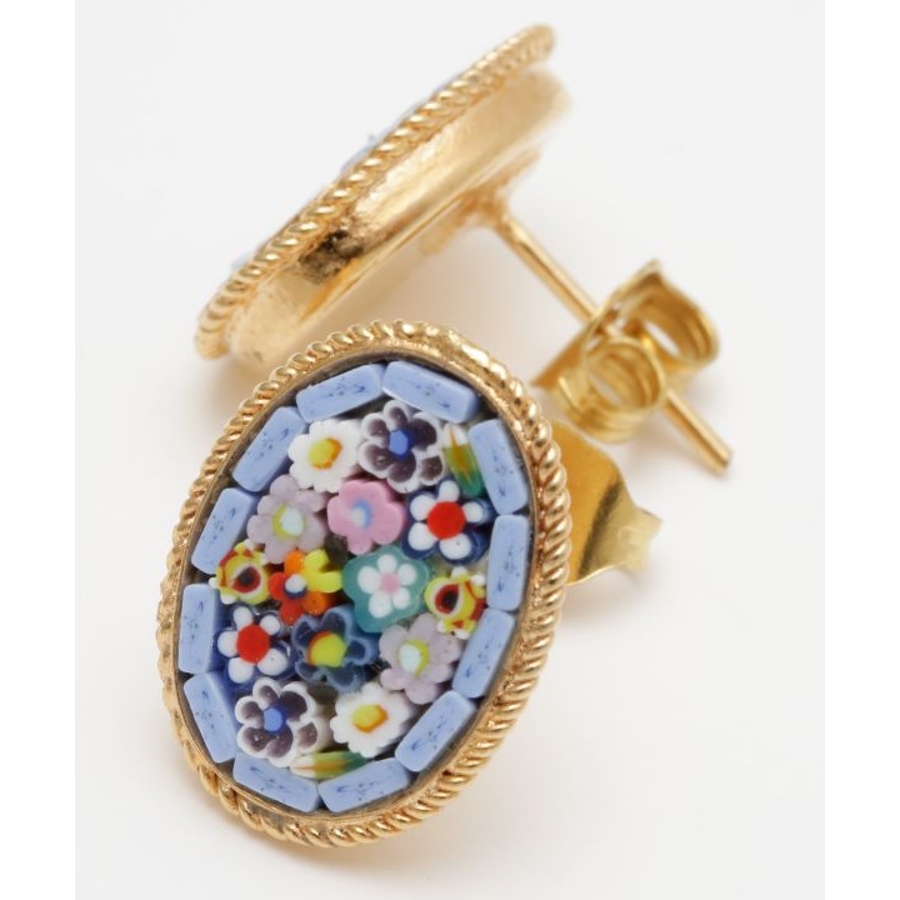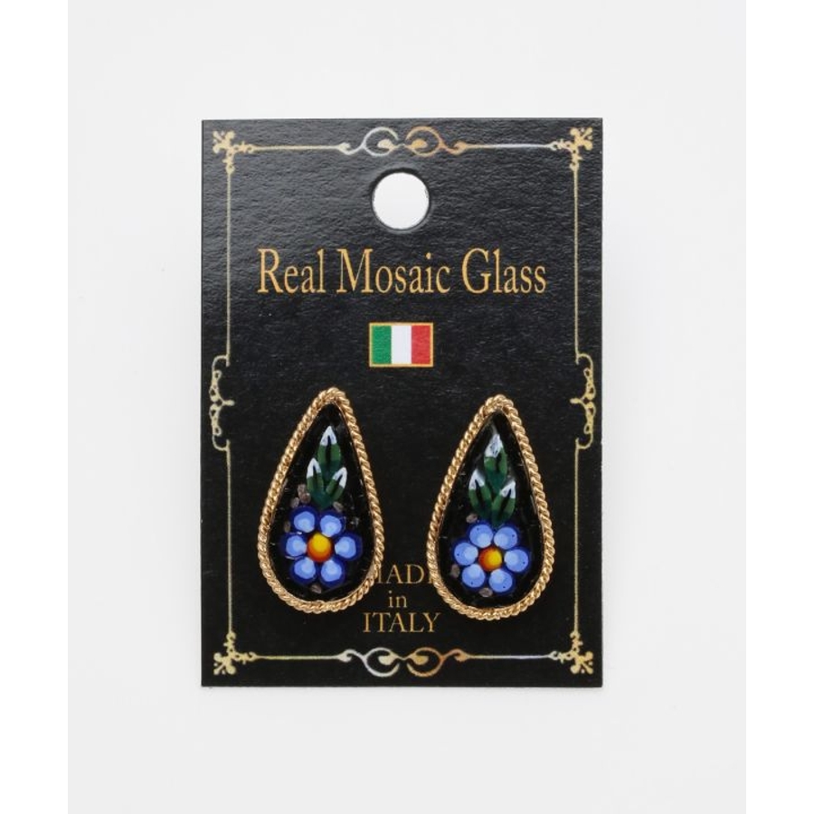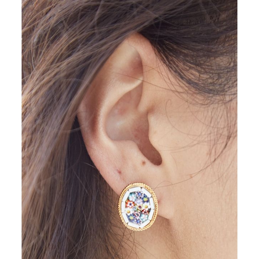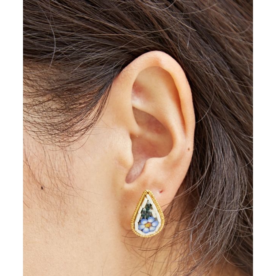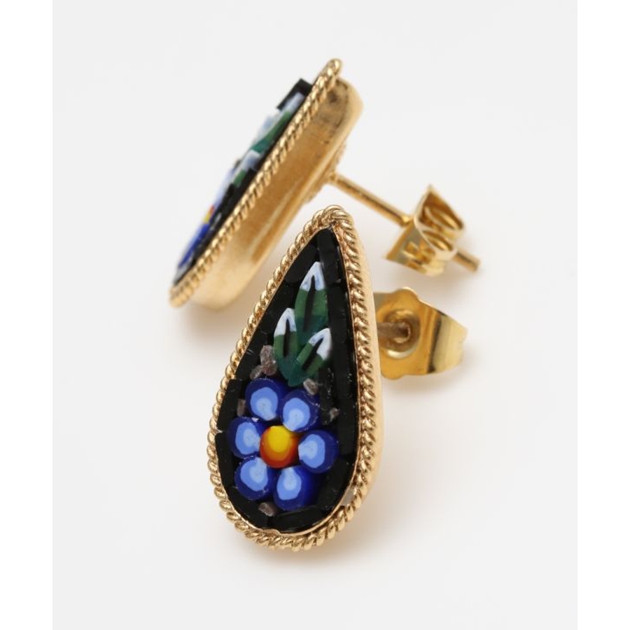 イタリア・フィレンツェの伝統技法「ガラスモザイク」で作られた、ポストタイプのピアス。1mmほどのベネチアンガラス(ムラーノガラス)をフレームにはめ込んで、お花などの模様を表現しています。昔ながらの職人の繊細な技が光ります。身に着けてちょっと嬉しくなるアイテムです。