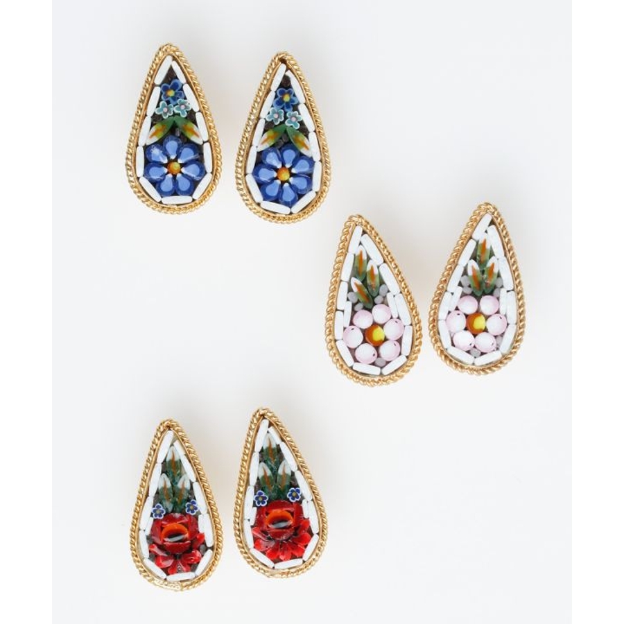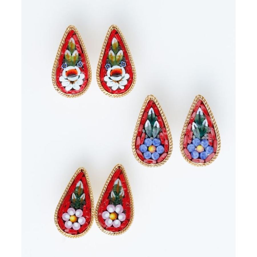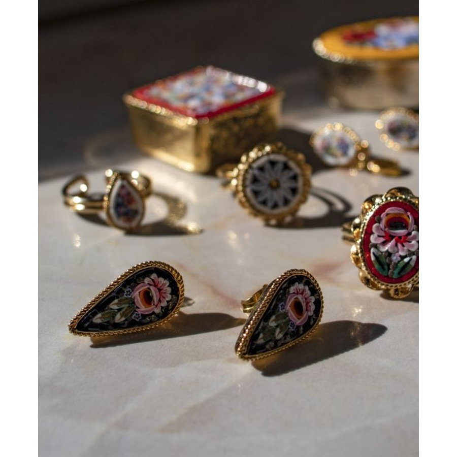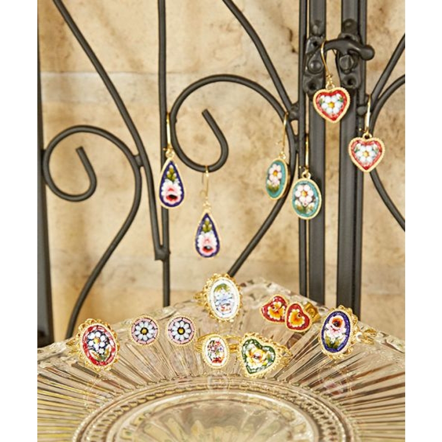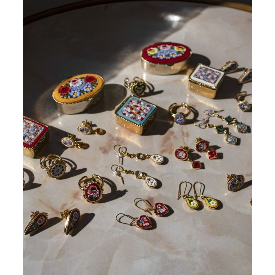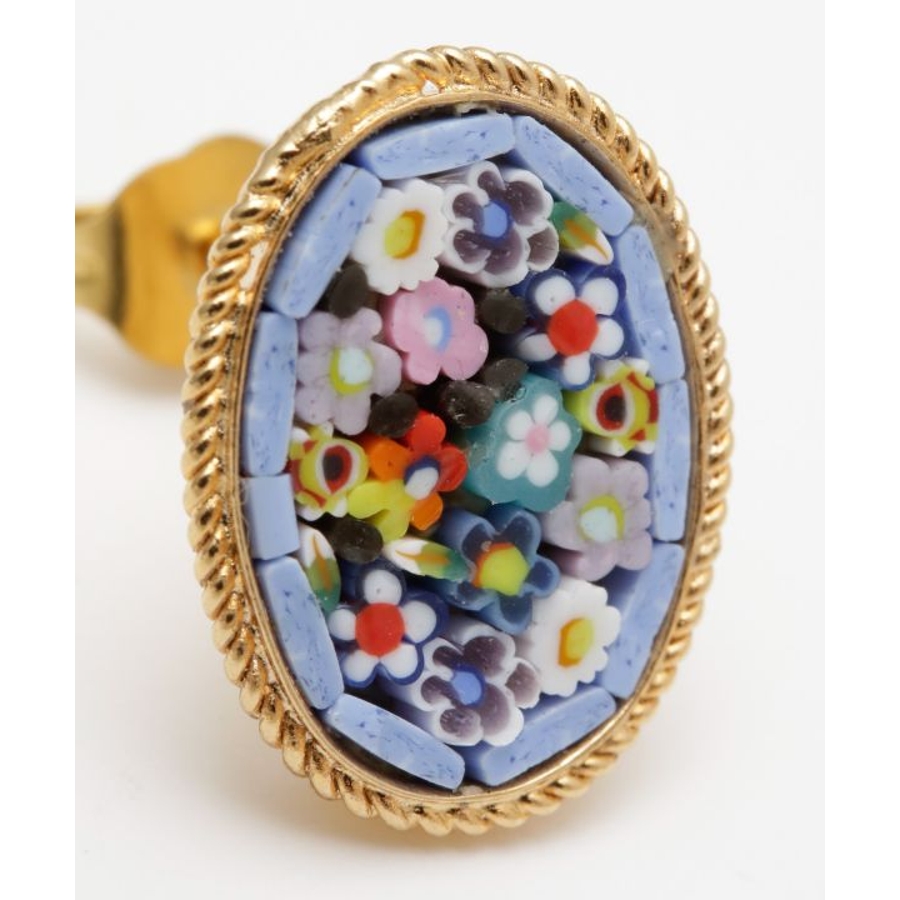 イタリア・フィレンツェの伝統技法「ガラスモザイク」で作られた、ポストタイプのピアス。1mmほどのベネチアンガラス(ムラーノガラス)をフレームにはめ込んで、お花などの模様を表現しています。昔ながらの職人の繊細な技が光ります。身に着けてちょっと嬉しくなるアイテムです。