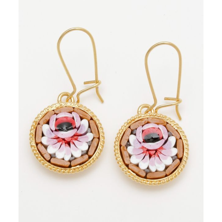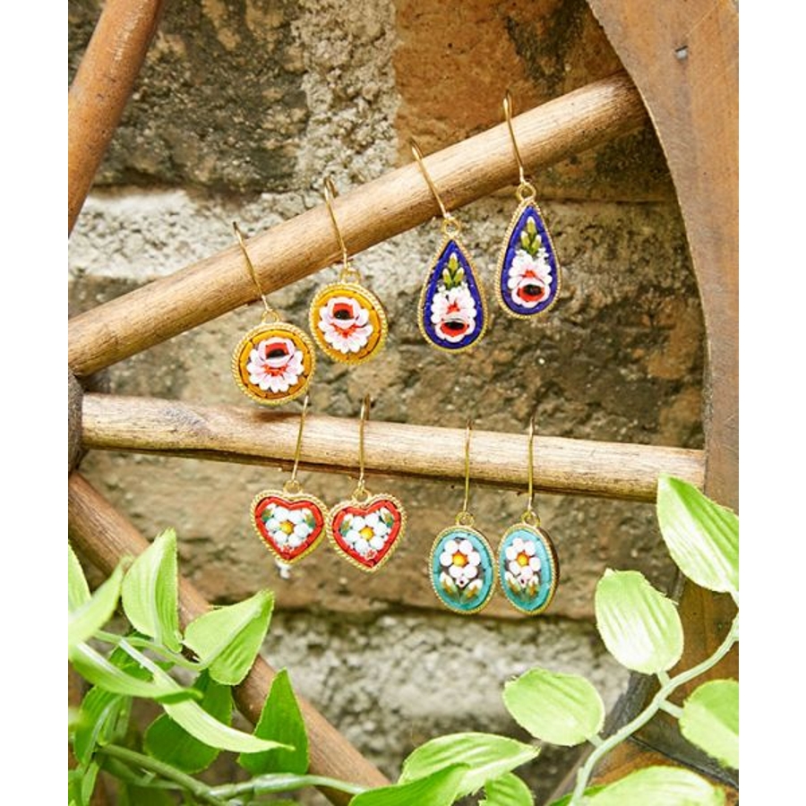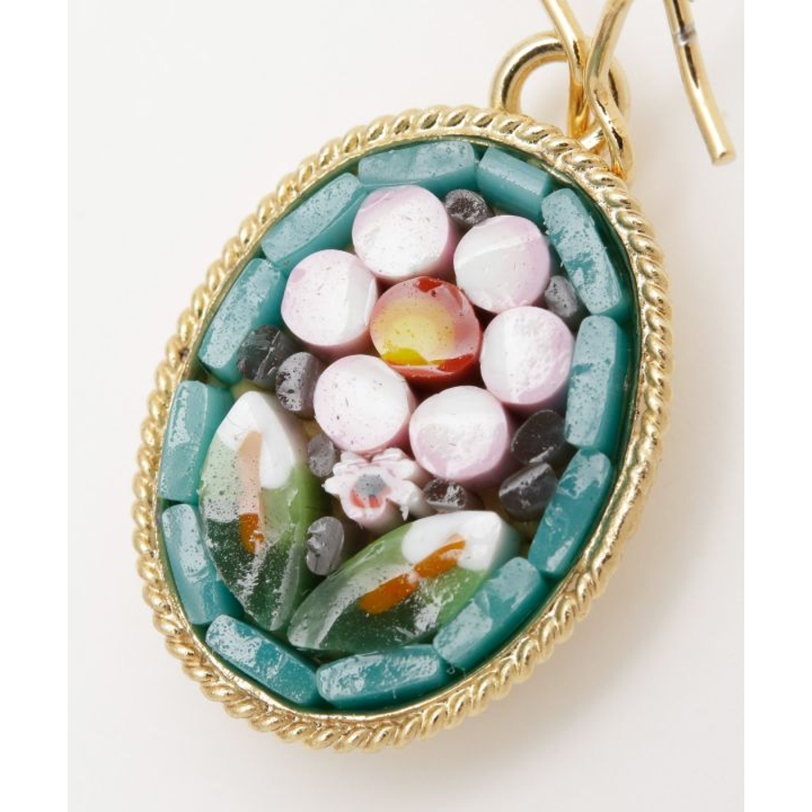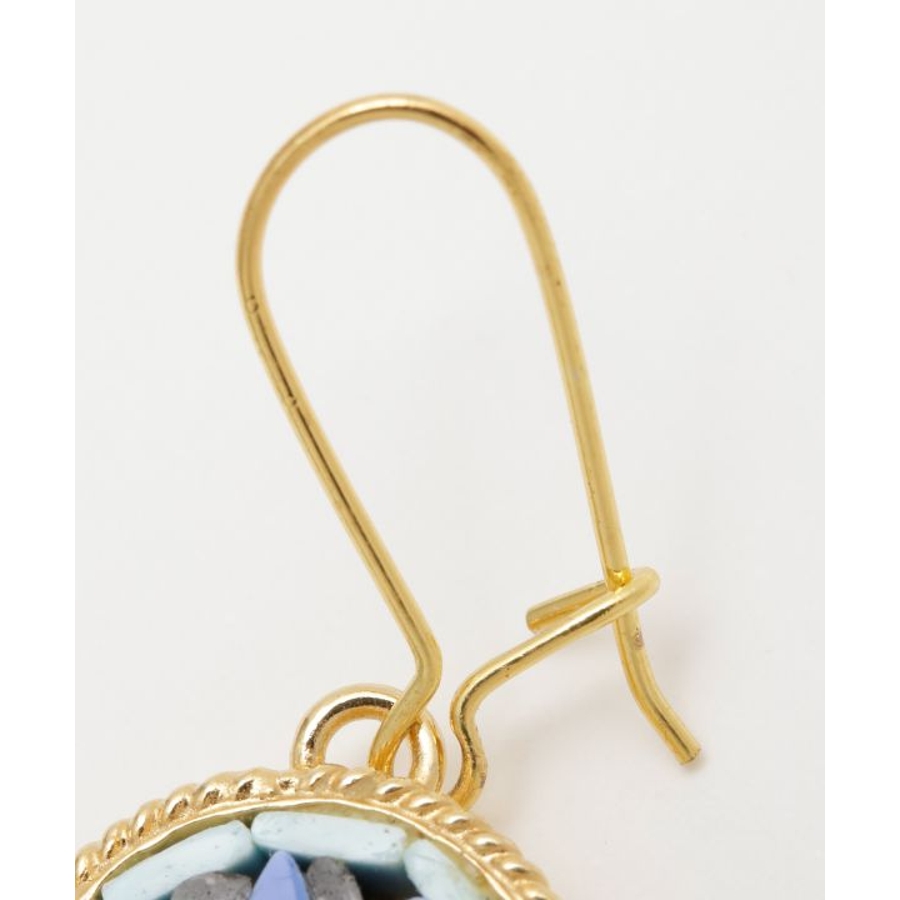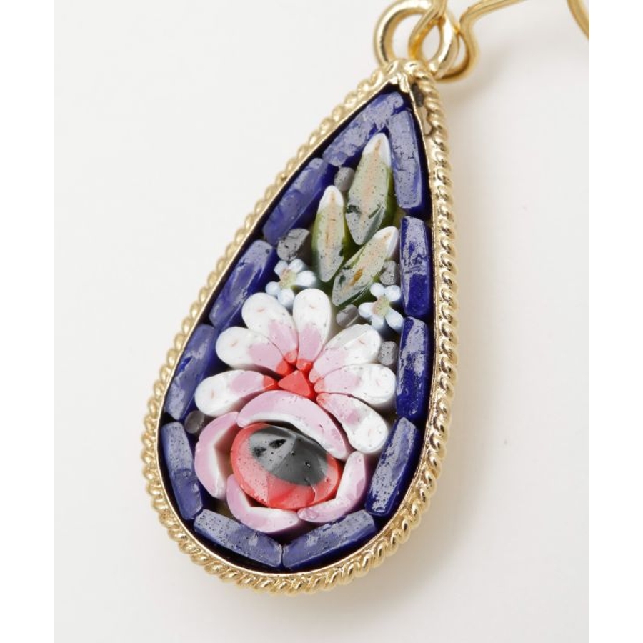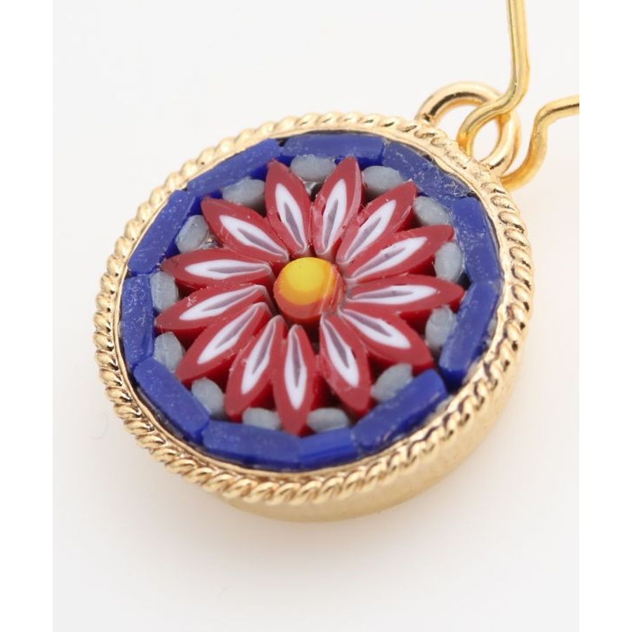 イタリア・フィレンツェの伝統技法「ガラスモザイク」で作られたフックピアス。1mmほどのベネチアンガラス(ムラーノガラス)をフレームにはめ込んで、お花などの模様を表現しています。昔ながらの職人の繊細な技が光ります。身に着けてちょっと嬉しくなるアイテムです。