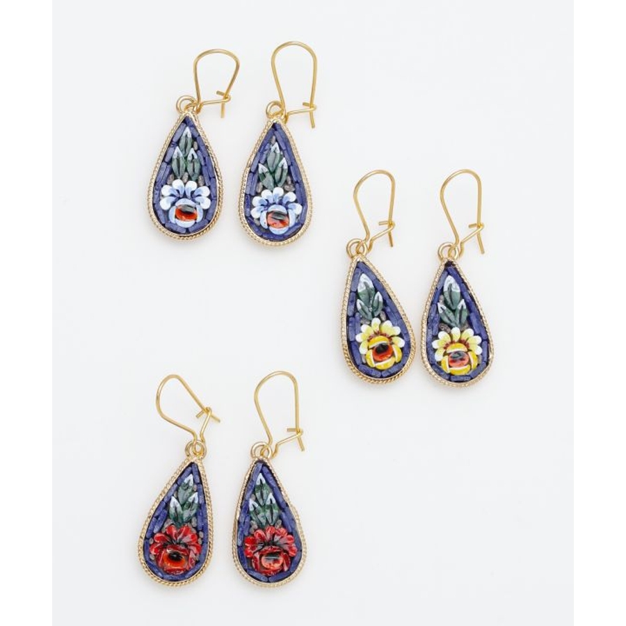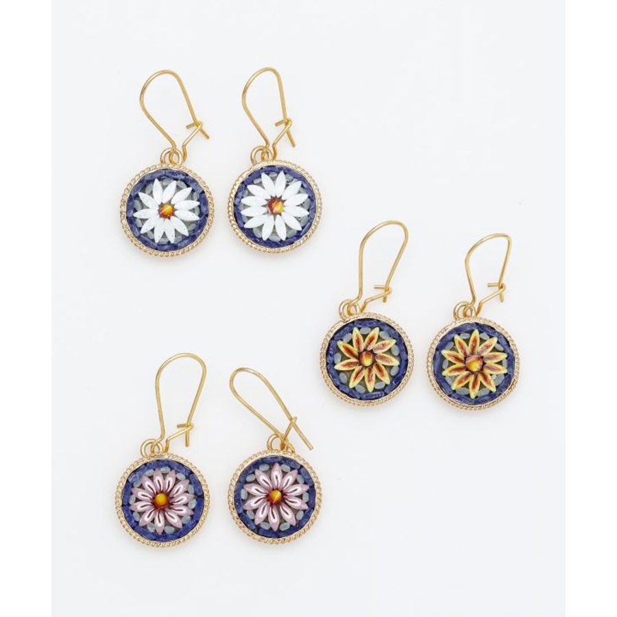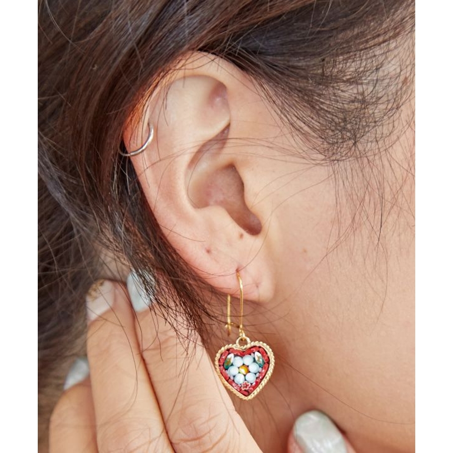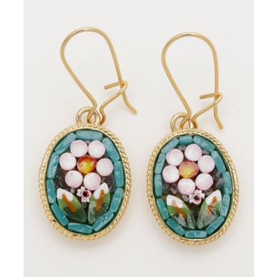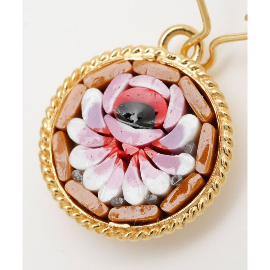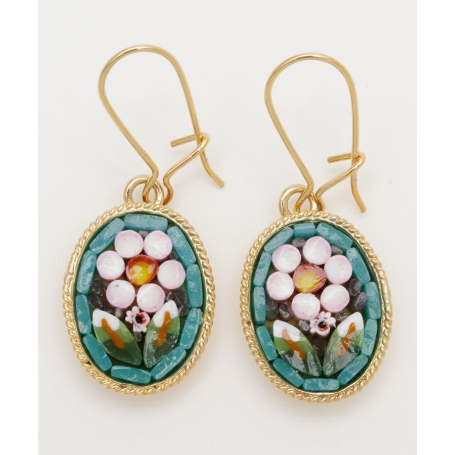 イタリア・フィレンツェの伝統技法「ガラスモザイク」で作られたフックピアス。1mmほどのベネチアンガラス(ムラーノガラス)をフレームにはめ込んで、お花などの模様を表現しています。昔ながらの職人の繊細な技が光ります。身に着けてちょっと嬉しくなるアイテムです。