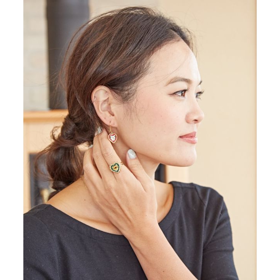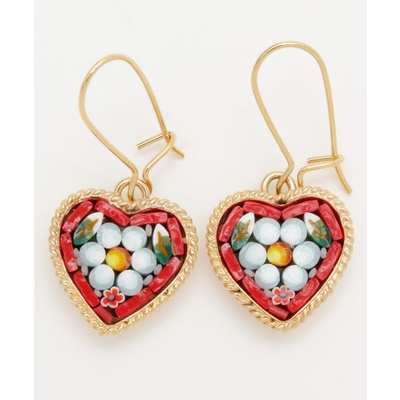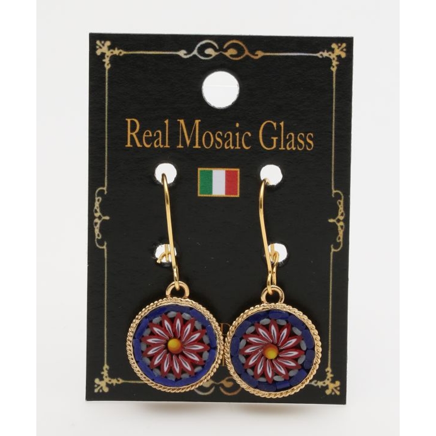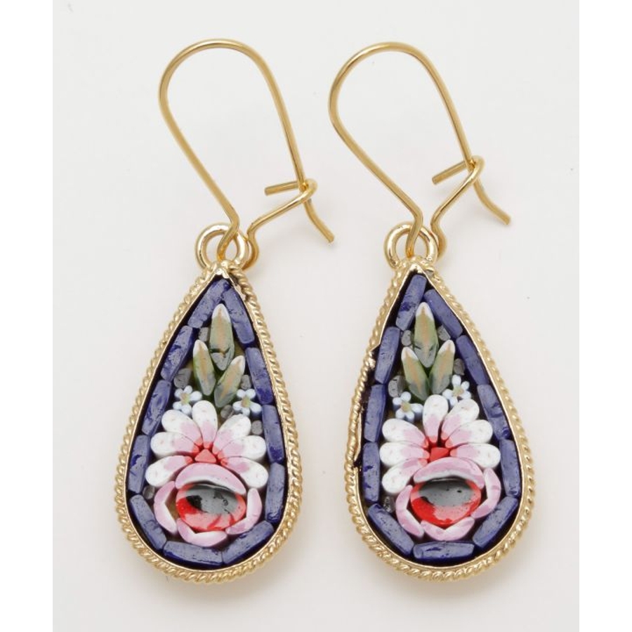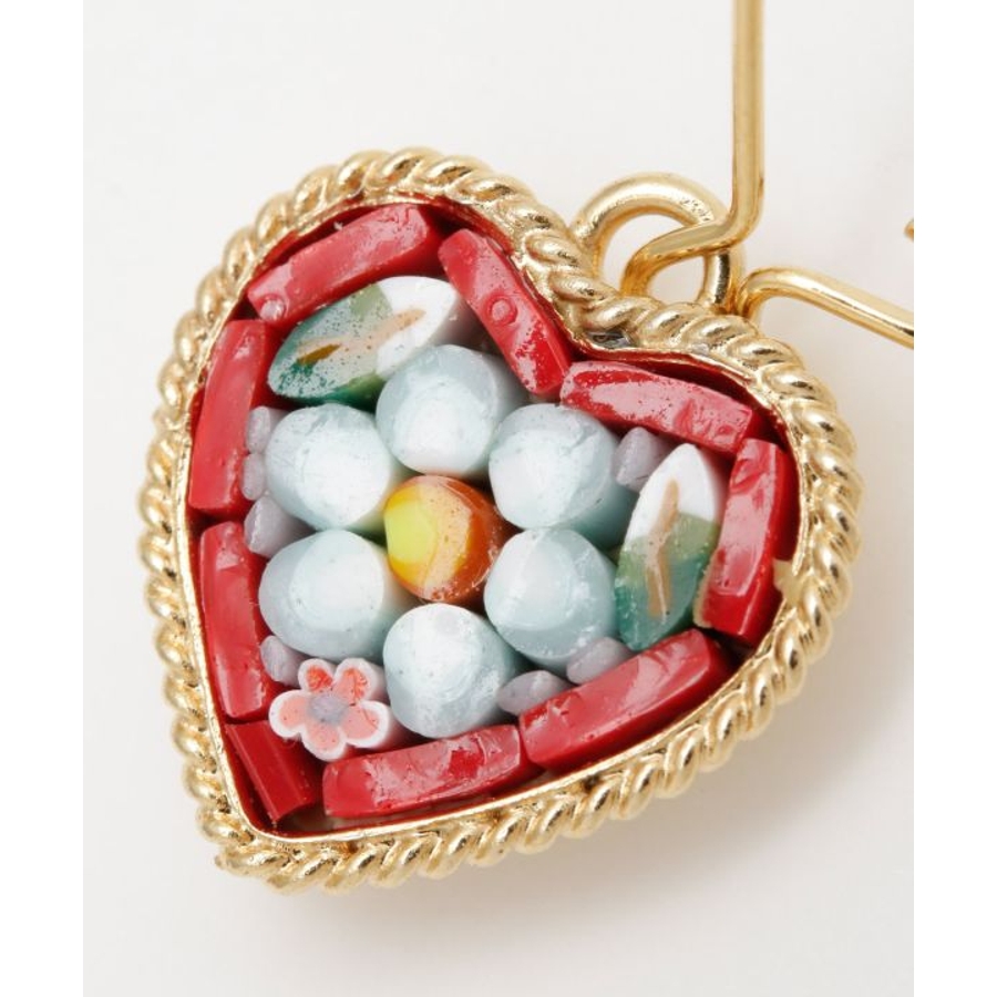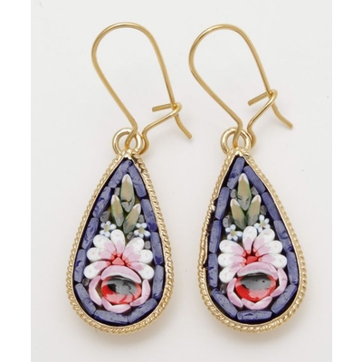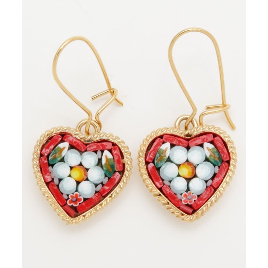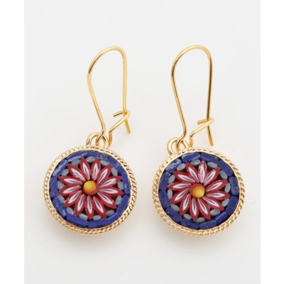 イタリア・フィレンツェの伝統技法「ガラスモザイク」で作られたフックピアス。1mmほどのベネチアンガラス(ムラーノガラス)をフレームにはめ込んで、お花などの模様を表現しています。昔ながらの職人の繊細な技が光ります。身に着けてちょっと嬉しくなるアイテムです。