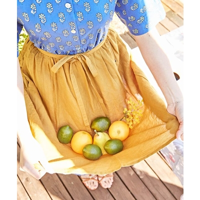 スカートのようにふわりとしたシルエットのギャザーギャルソンエプロンです。コットンリネンのナチュラルな素材感が魅力。取り外し可能なチェコビーズチャーム付き。お部屋でもお庭でも活躍してくれます。