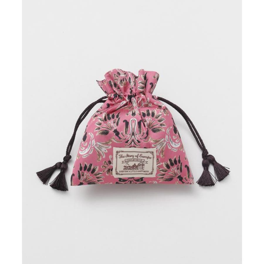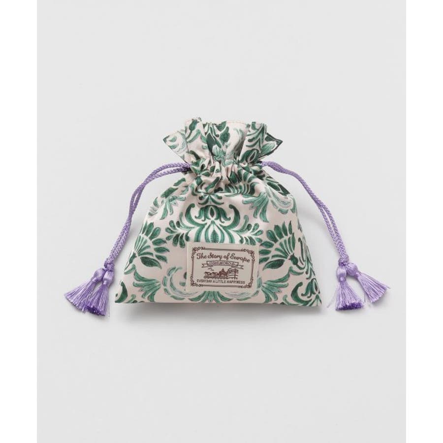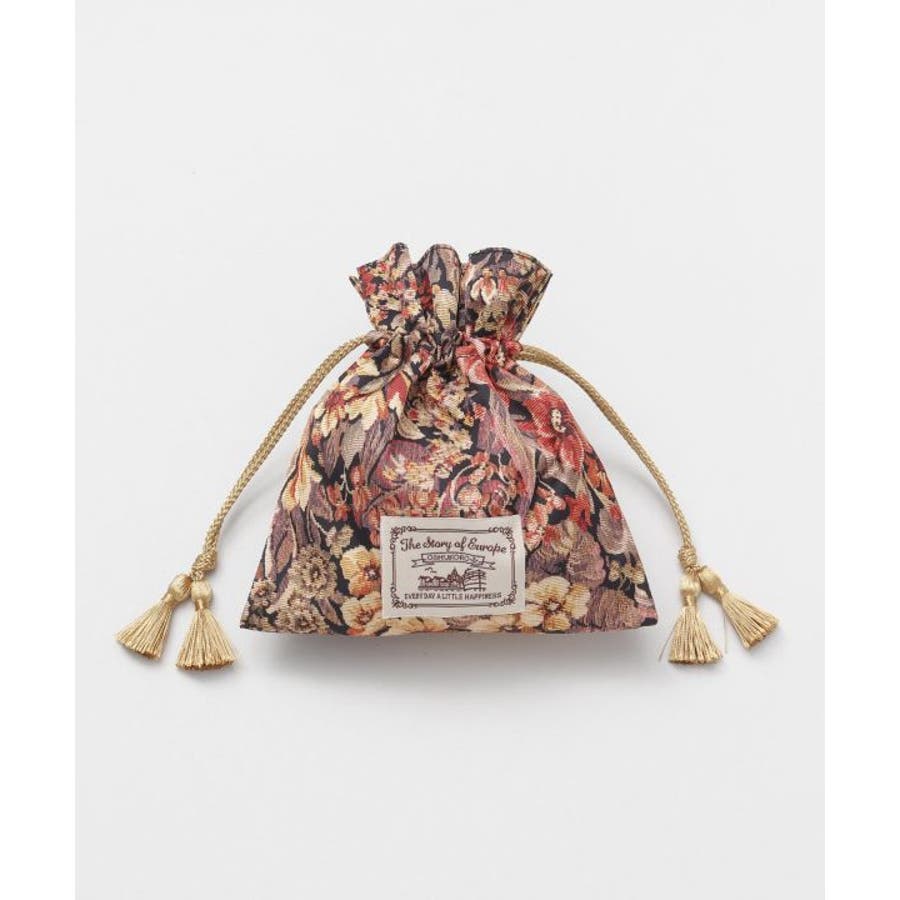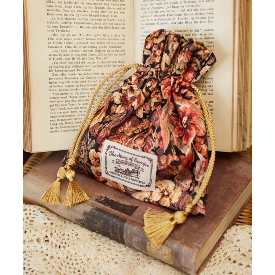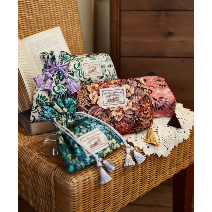 イタリア製のスカーフ生地を使用した巾着型ポーチ。まるで蚤の市で見つけたようなレトロ感のある柄が特徴的。ヒモに付いたフリンジがアクセントになっています。コスメやハンドクリームなど小物を入れるのにおすすめです。