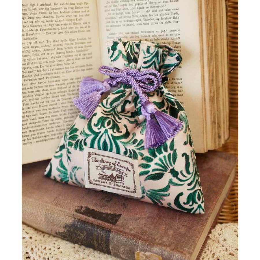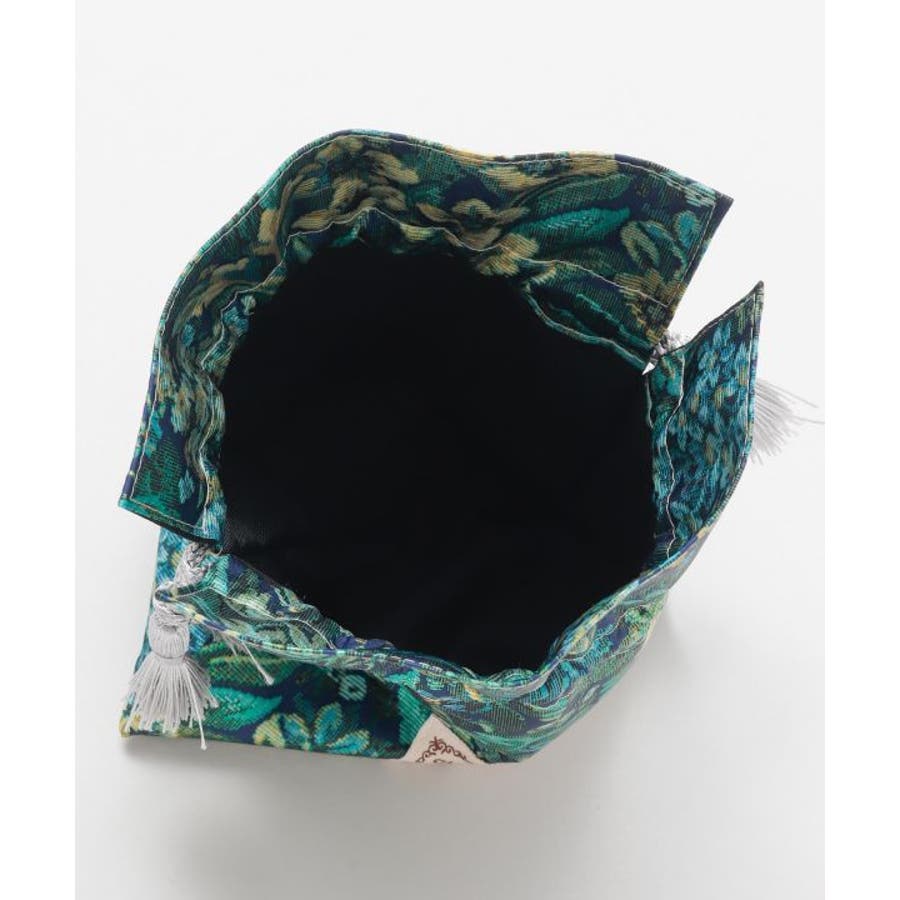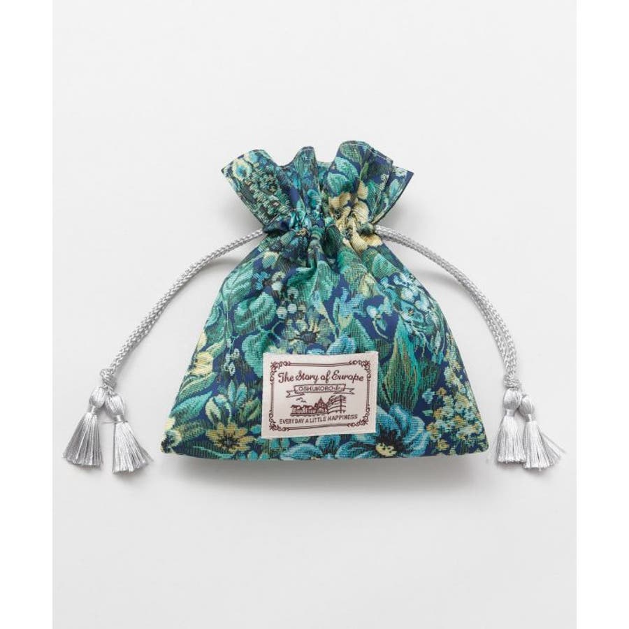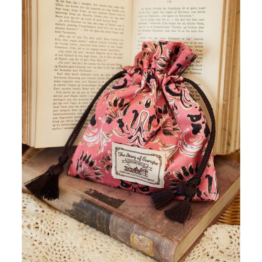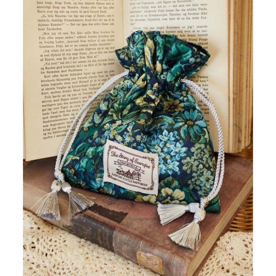 イタリア製のスカーフ生地を使用した巾着型ポーチ。まるで蚤の市で見つけたようなレトロ感のある柄が特徴的。ヒモに付いたフリンジがアクセントになっています。コスメやハンドクリームなど小物を入れるのにおすすめです。