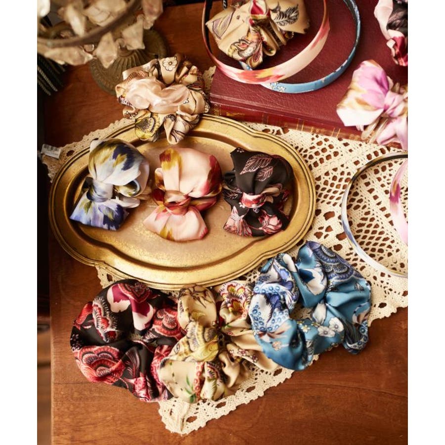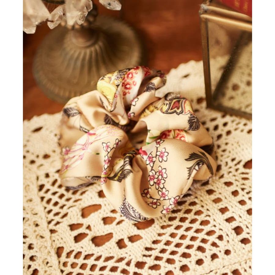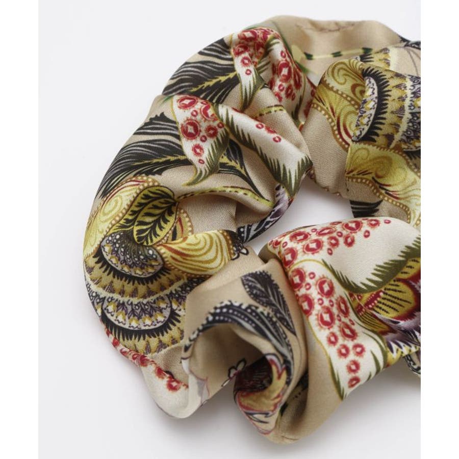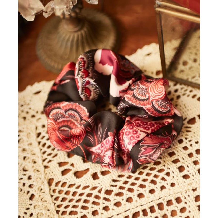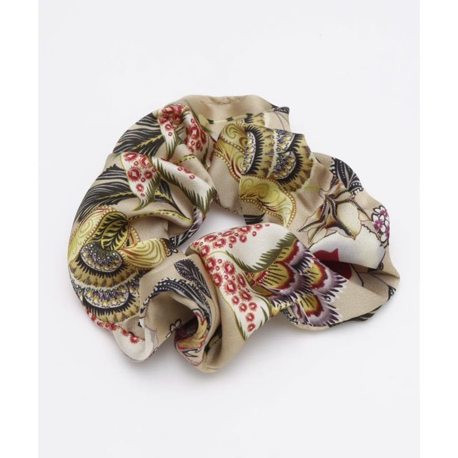さらっとなめらかな生地感のイタリア製スカーフで作られたシュシュ。腕に着けてもかわいく、手首を締め付けないサイズ感。落ち着いた色味でどんなファッションにも取れ入れやすい花柄です。