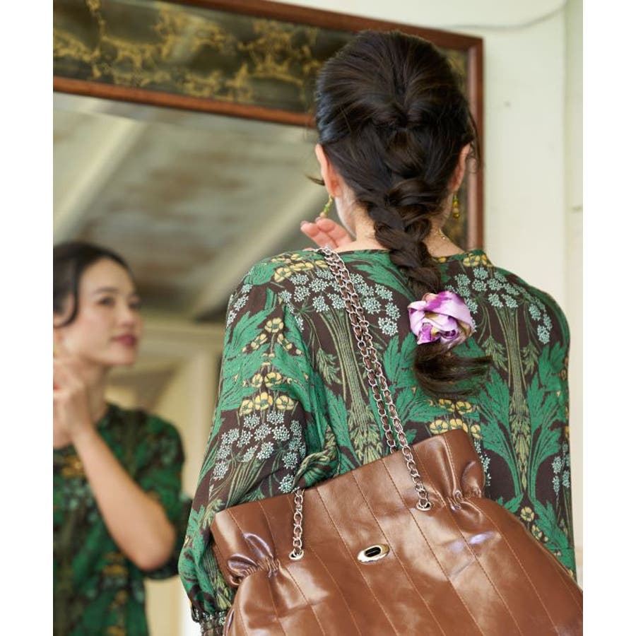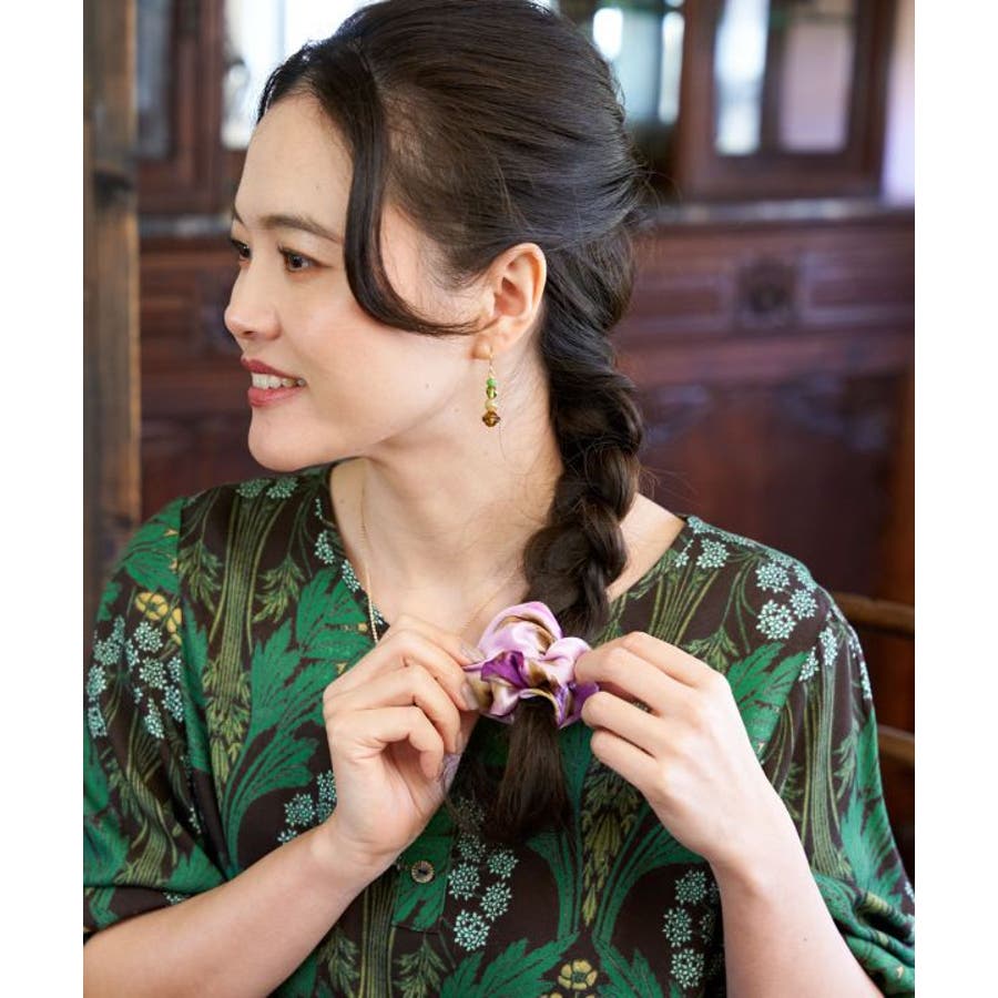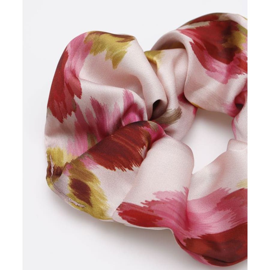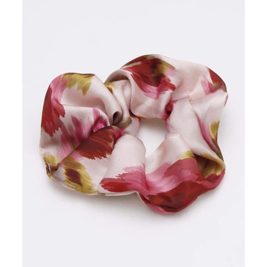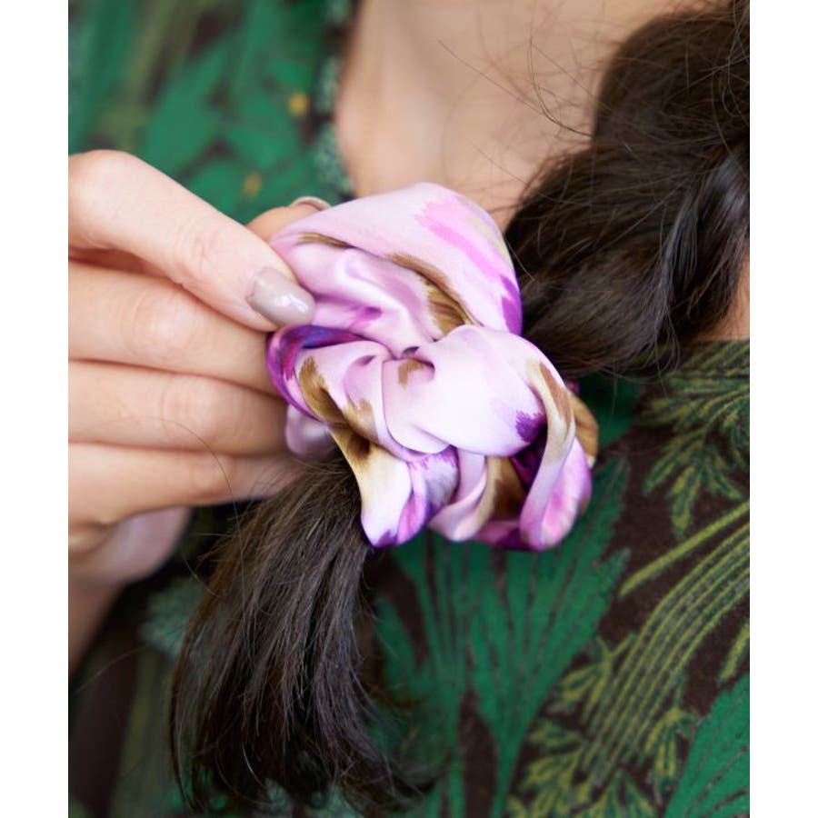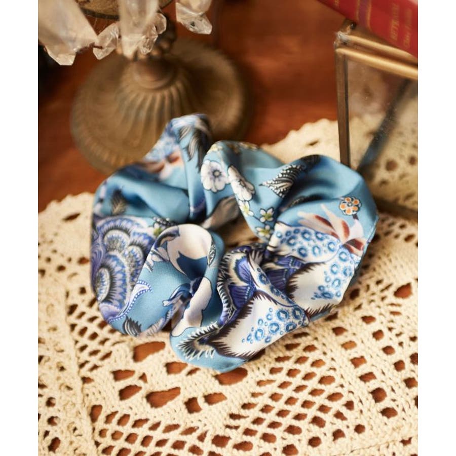 さらっとなめらかな生地感のイタリア製スカーフで作られたシュシュ。腕に着けてもかわいく、手首を締め付けないサイズ感。落ち着いた色味でどんなファッションにも取れ入れやすい花柄です。