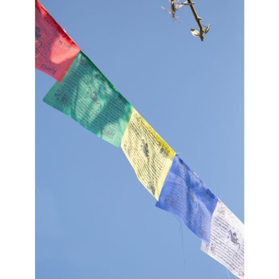 チベット伝統の祈祷旗であるタルチョ。五色の順番は青・白・赤・緑・黄の順に決まっており、それぞれが天・風・火・水・地すなわち五大を表現する。部屋やキャンプ・グランピングで飾れば、一気に雰囲気が演出される。 ※丸まった状態で梱包されております。