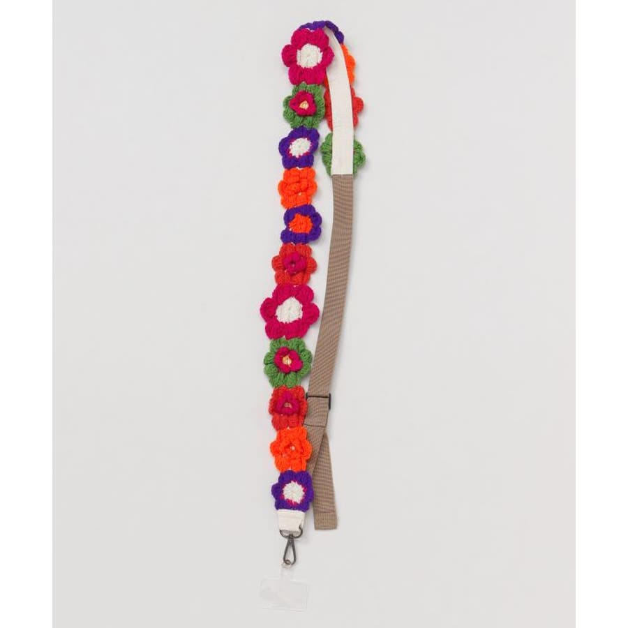 【FLOWER MARKET】ネパールの手編みのスマホショルダーストラップ。インド、ネパールの旅先で出会う花売りやフラワーマーケットをイメージしました。クリアストラップシート付き。長さ調整もできて、肩掛けも可能。