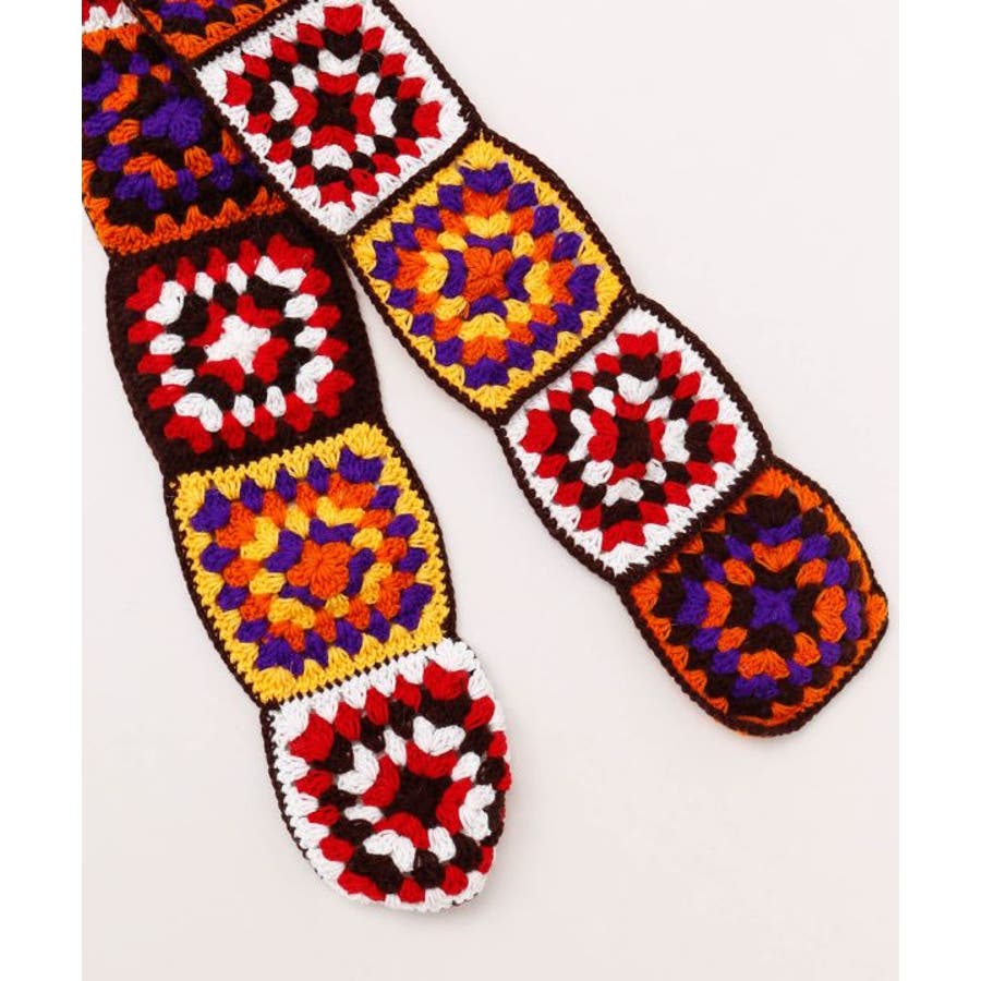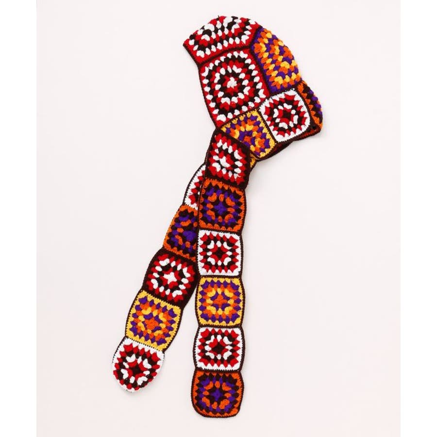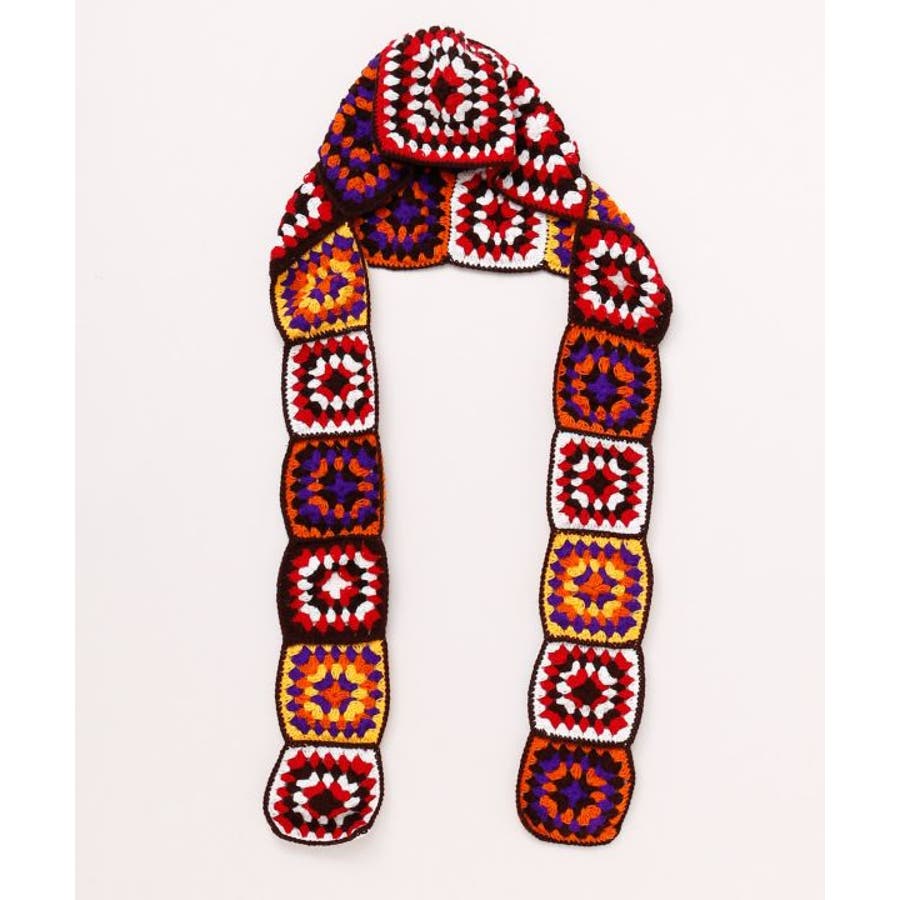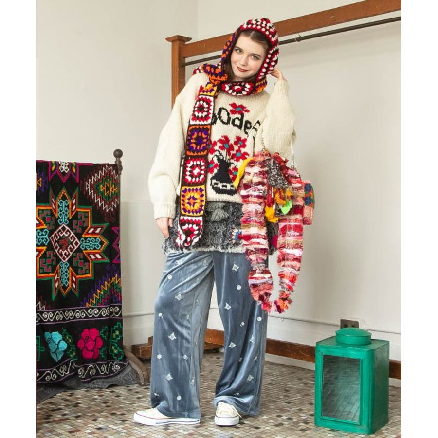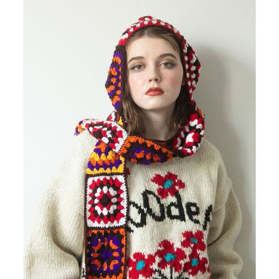 ネパールの手編みのフード付きマフラー。インド、ネパールの旅先で出会う花売りとフラワーマーケットをイメージ。首周りの防寒として、気温によってフードを被ったり脱いだり調整してコーディネートを楽しめる。