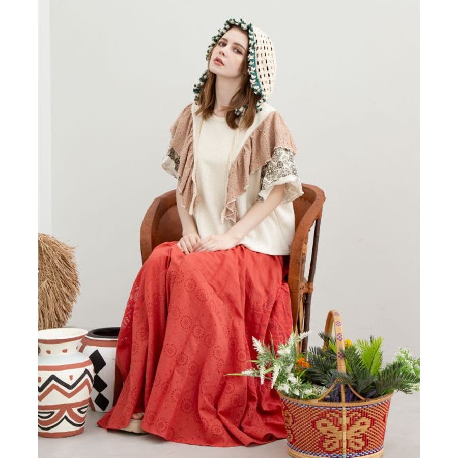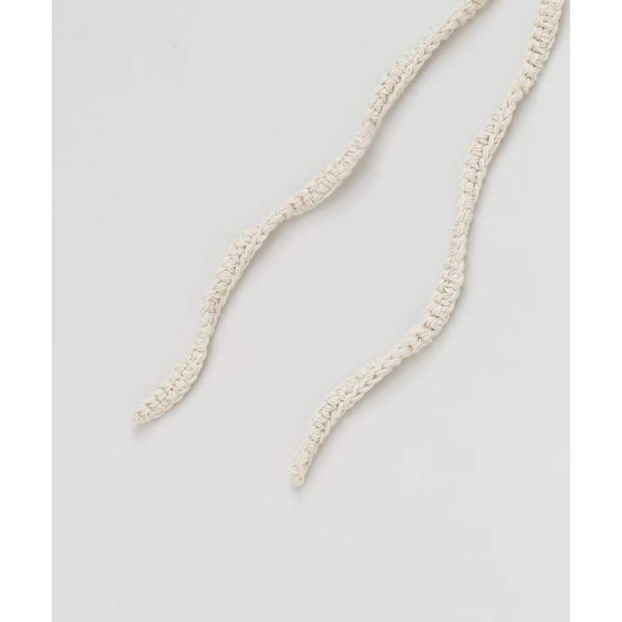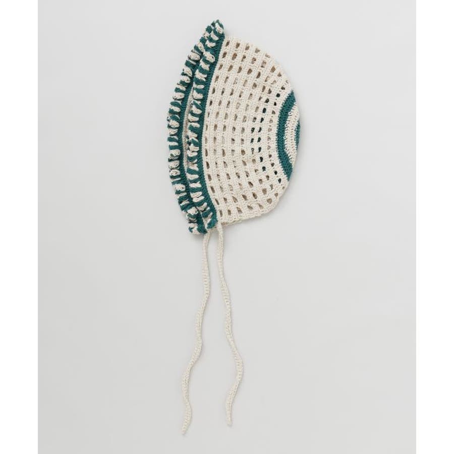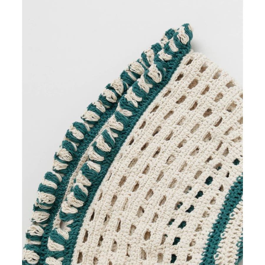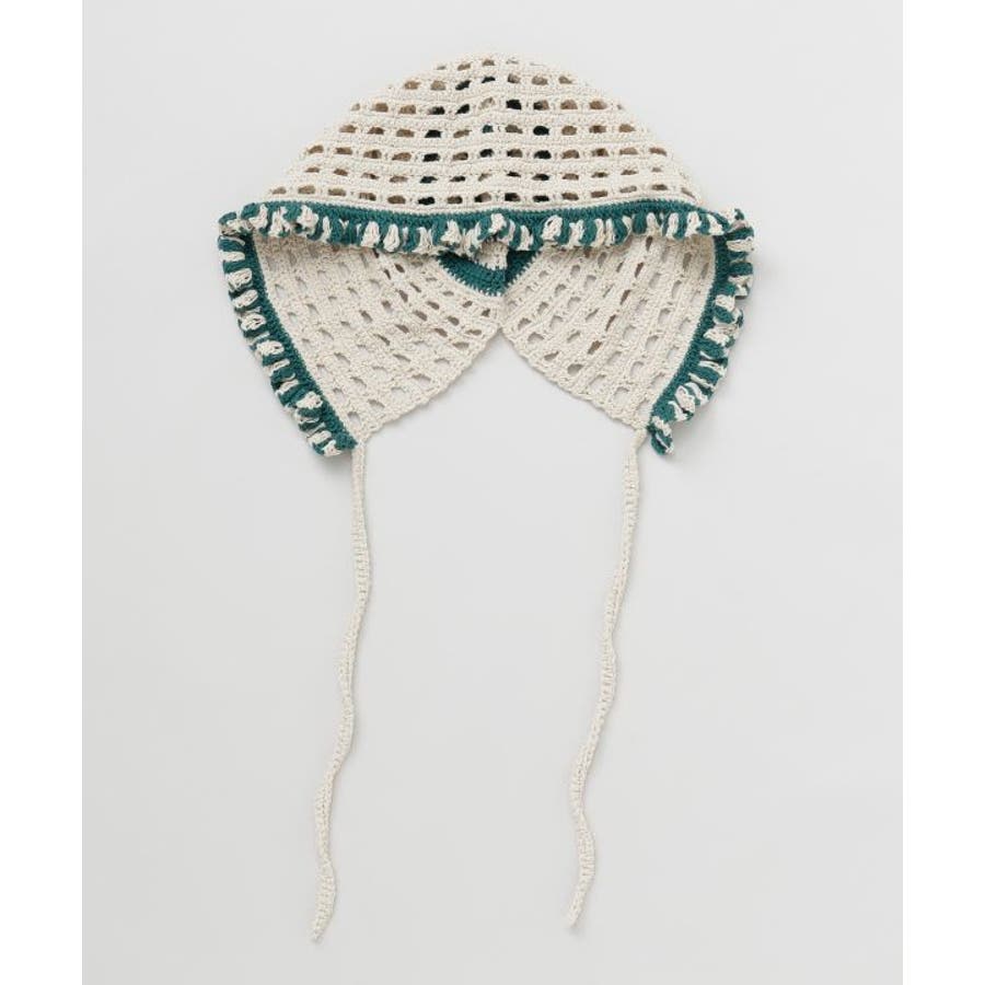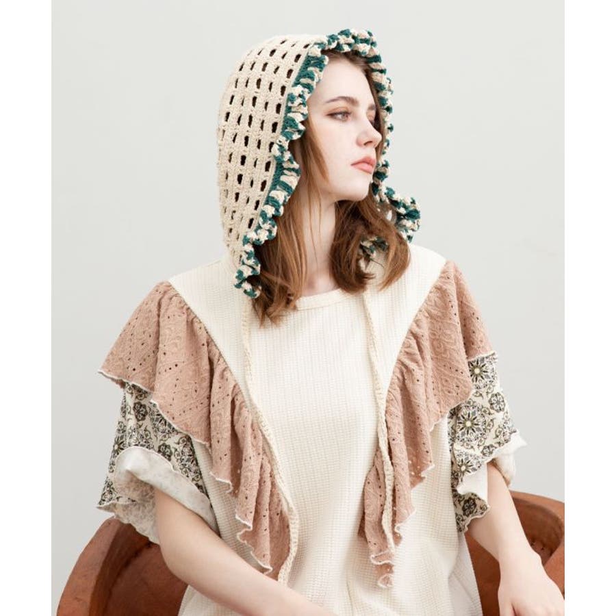 ひも付きの手編みキャップは、フードのようにアレンジしても楽しめる自由なデザイン。ゆったりサイズでリラックス感があり、ヒッピーやボヘミアンコーデにおすすめ。