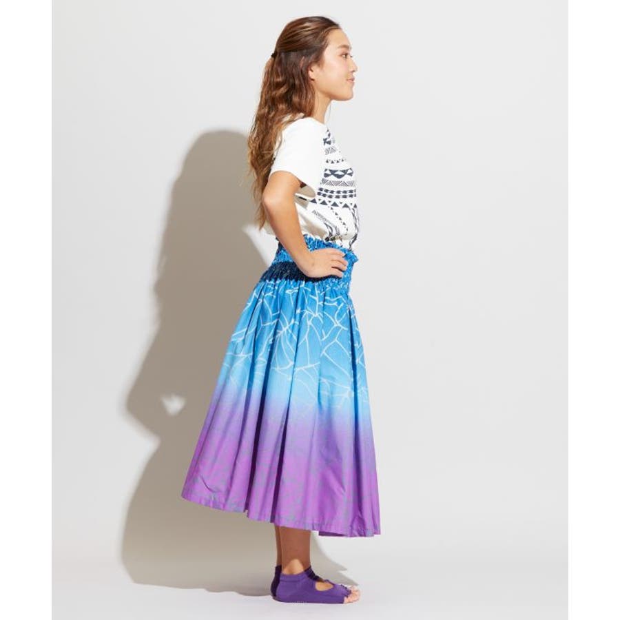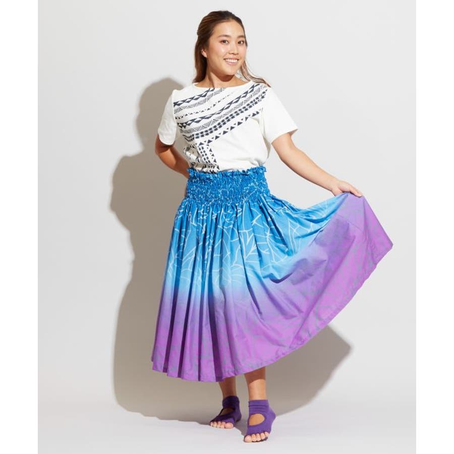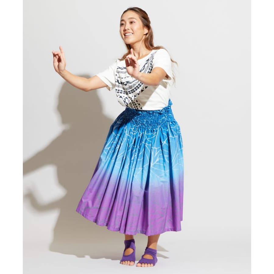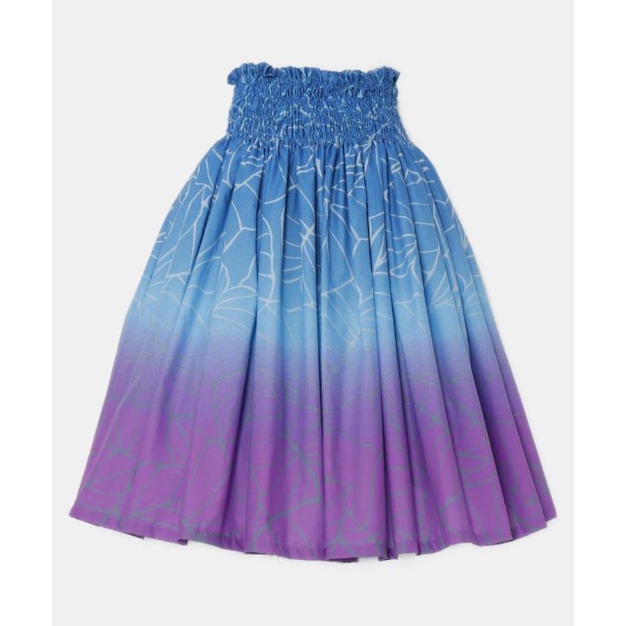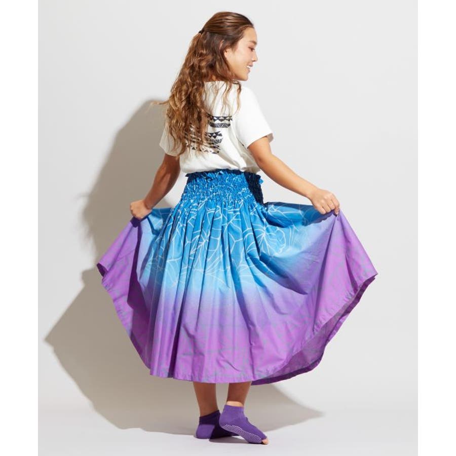 マウナロアオリジナルファブリックを使用した既製品シングルパウ。「Ohana(オハナ=家族)」の象徴とされ、ハワイの人々にとって大切な植物「タロ」。神話にも登場するこのタロの葉をポリネシアのムード溢れるビビッドカラーのグラデーションの中に描きました。4ヤード(約3.6m)のたっぷりギャザーに安定のウエスト4本ゴムを使用しています。ご自身で調整できるウエストゴム仕様。グラデーションが美しいデザインが魅力的です。サイズ:スカート丈73cm