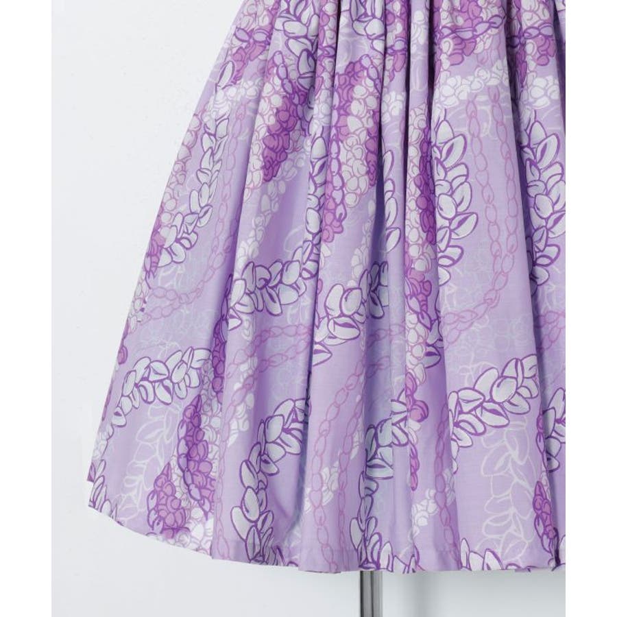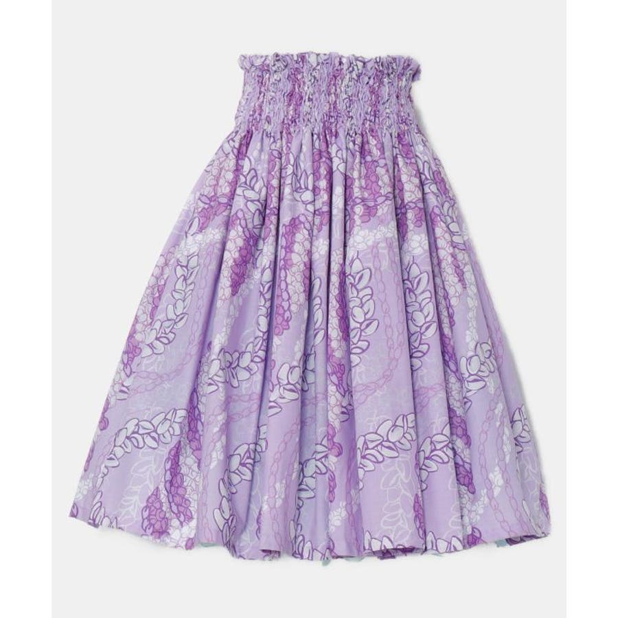 マウナロアオリジナルファブリックを使用した既製品シングルパウ。様々なメレにも登場するシェル(貝)を流れるようなレイに連ねたデザイン。優しく上品な印象のテキスタイルが優雅なステージを演出します。4ヤード(約3.6m)のたっぷりギャザーに安定のウエスト4本ゴムを使用しています。ご自身で調整できるウエストゴム仕様。連なる様々な色の花とシェルが可憐に描かれたデザインに魅力を感じます。サイズ:スカート丈73cm