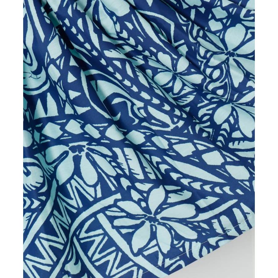 【使用生地:ZK000487 ポリネシアンタパ/ブルー系 ハワイアンファブリック】マウナロアオリジナルファブリックを使用した、73cm丈の既製品シングルパウ。人気のティアレの花と流れるようなタトウ柄の躍動感あるデザイン。4ヤード(約3.6m)のたっぷりギャザーに安定のウエスト4本ゴムを使用しています。ご自身で調整できるウエストゴム仕様。