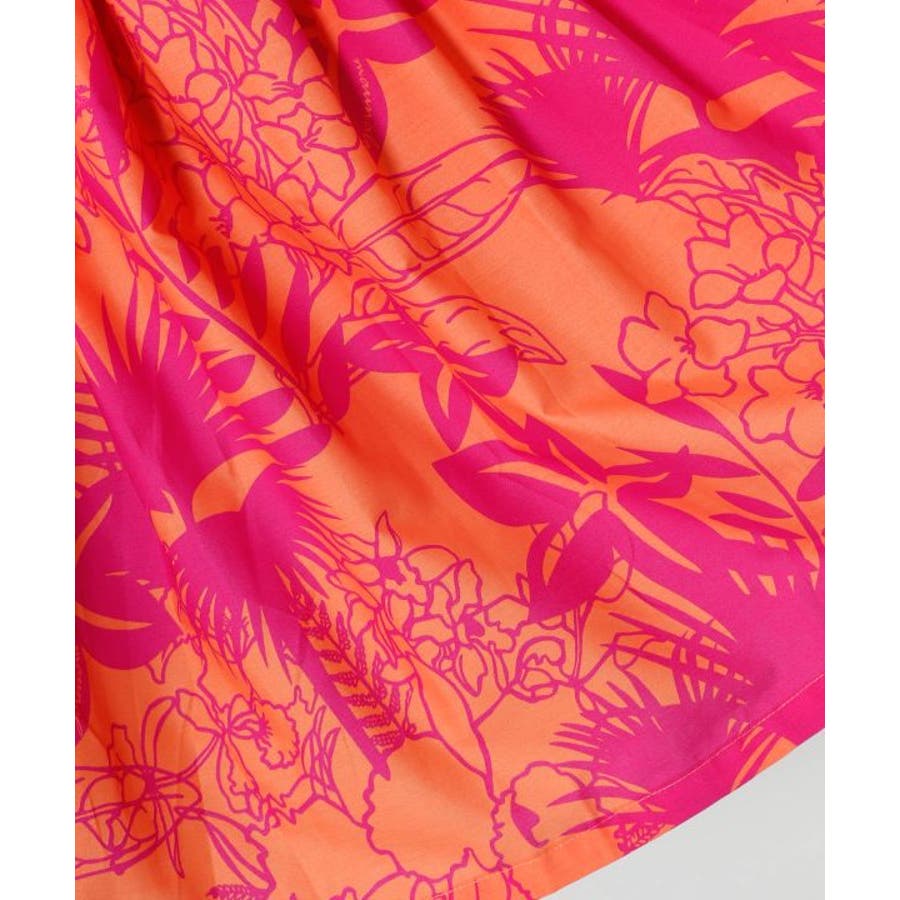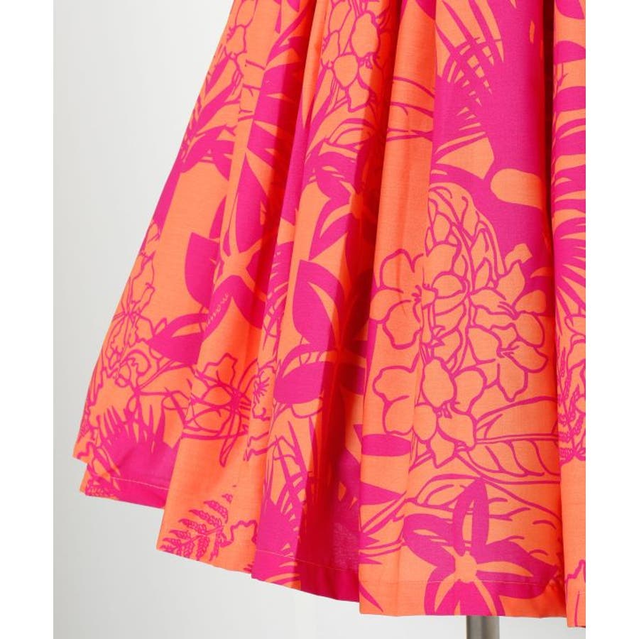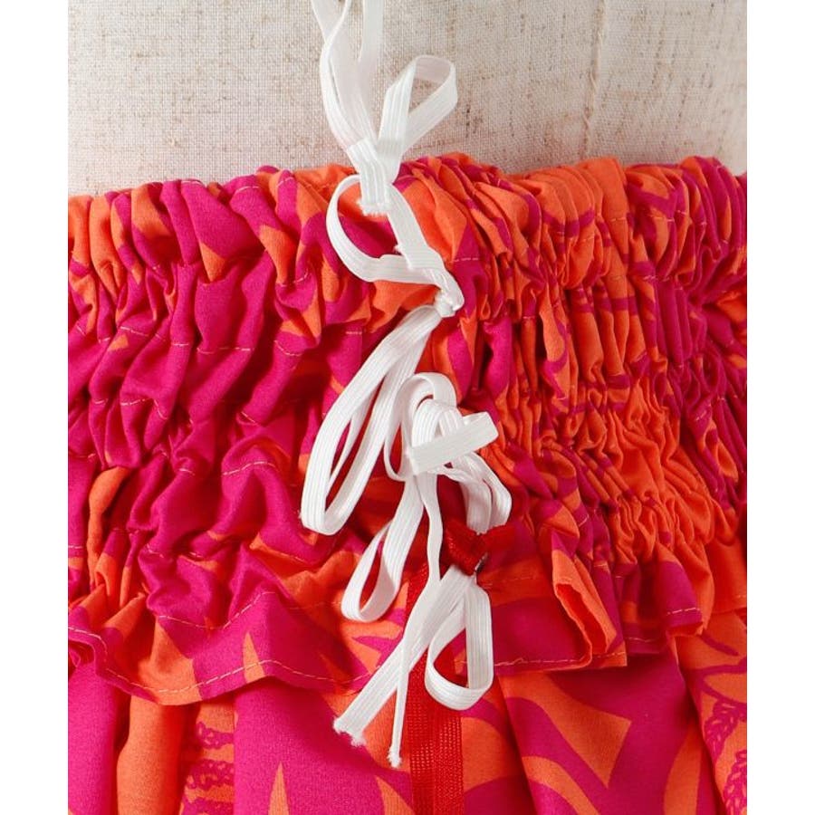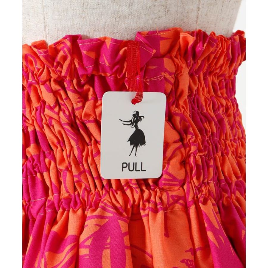 【使用生地:ZK000033 トロピカル/オレンジ系 ハワイアンファブリック】マウナロアオリジナルファブリックを使用した、73cm丈の既製品シングルパウ。人気のティアレの花と流れるようなタトウ柄の躍動感あるデザイン。4ヤード(約3.6m)のたっぷりギャザーに安定のウエスト4本ゴムを使用しています。ご自身で調整できるウエストゴム仕様。