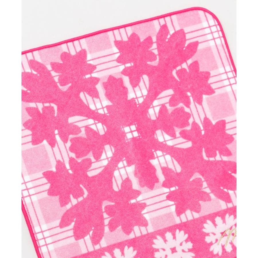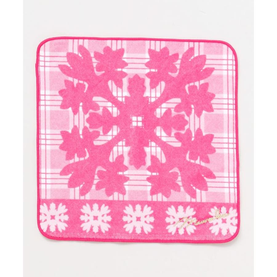 メロー刺繍でふちどられ、パラカチェックとキルトがプリントされたタオルハンカチ。表地は柔らかな肌触り、裏面はパイル地で吸水性の良い一枚。ゴールド刺繍のマウナロアロゴがアクセント。