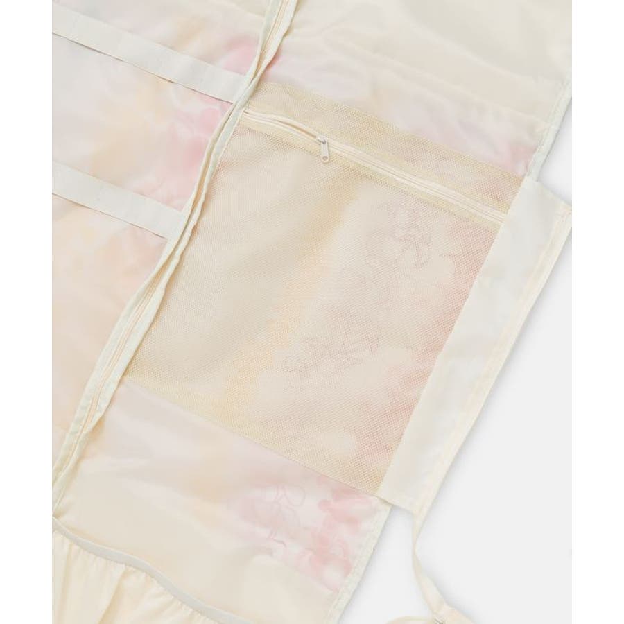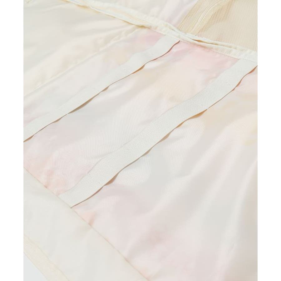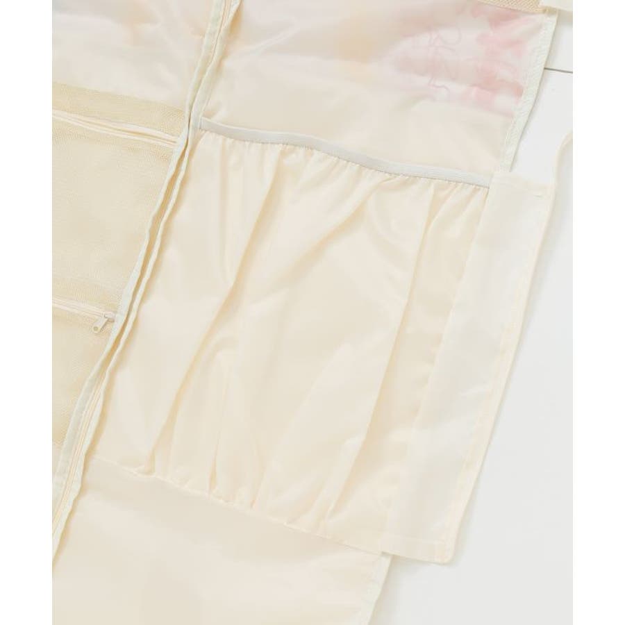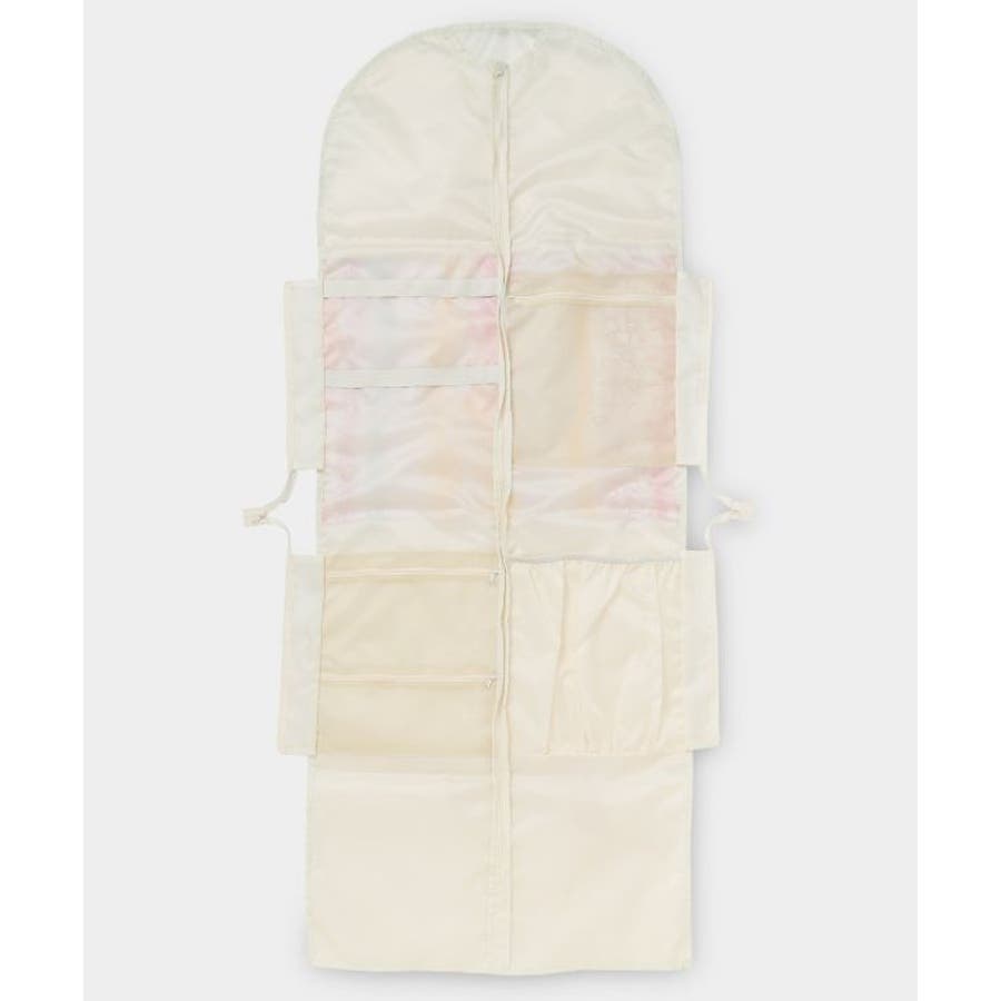 プアケニケニ柄が描かれた、ポリエステル素材のガーメントバッグ。ドレスを最大5着運べるダンサーのマストアイテムです。内側にヘアクリップを付けられるバンドが2本、大小のメッシュポケット、大きめ袋ポケット、ハンガーの通し穴もついた機能性の高いバッグ。