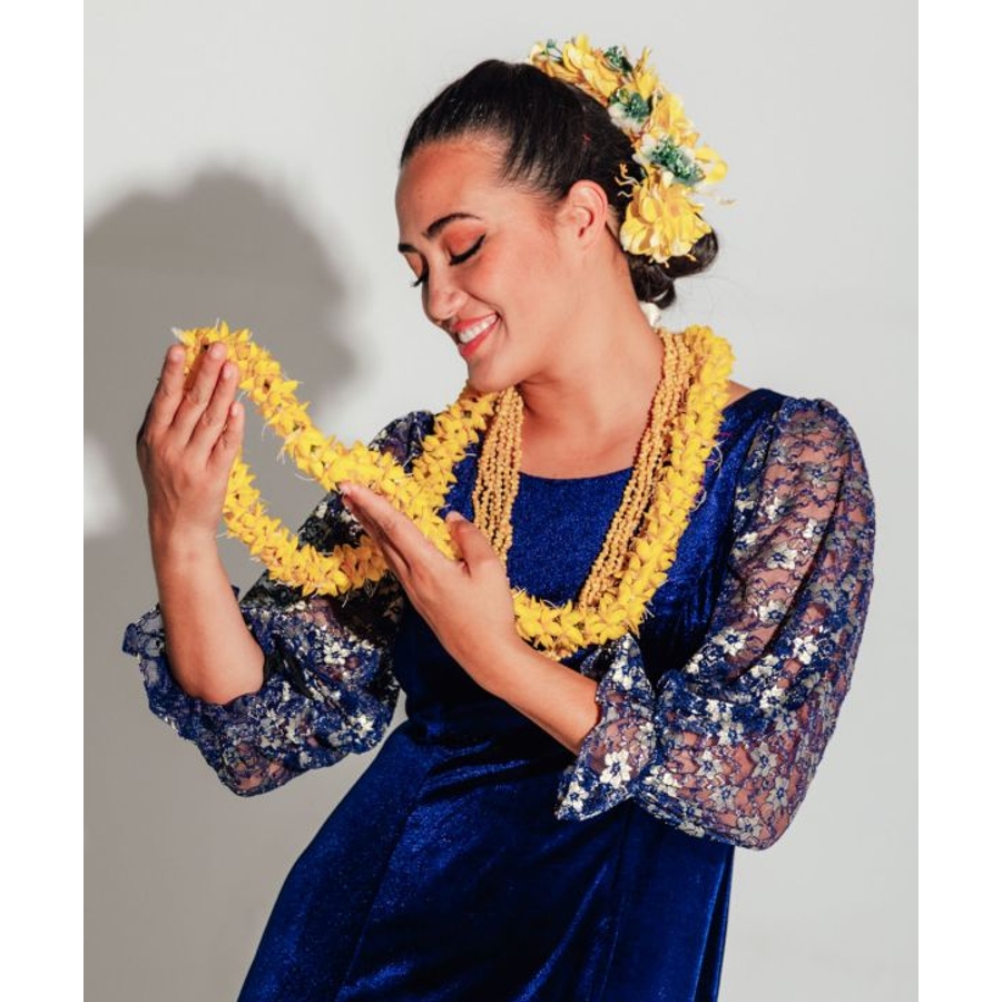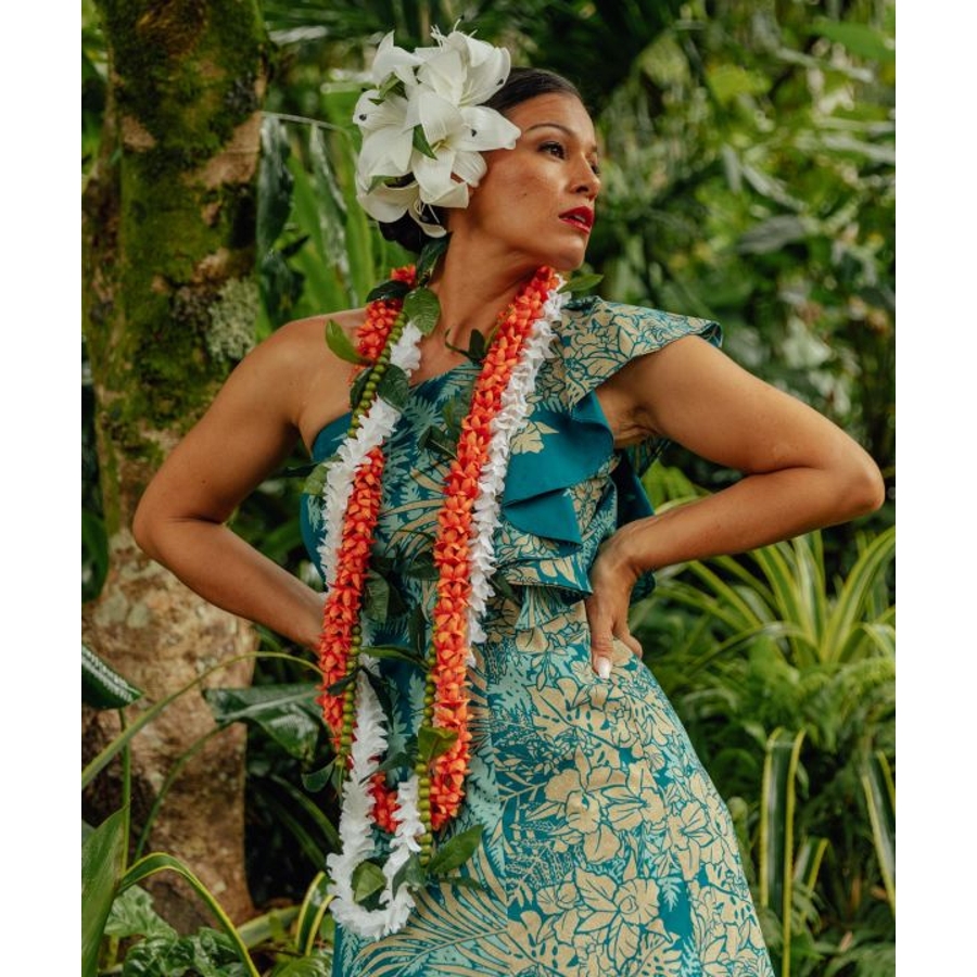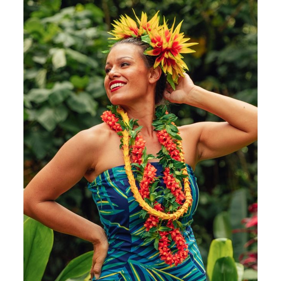 ハワイの人々に愛される、情熱的なカラーのオハイアリィをモチーフにしたロングレイ。王族が身に着ける赤や黄色の高貴なカラーは、煌くステージを華やかに彩ります。