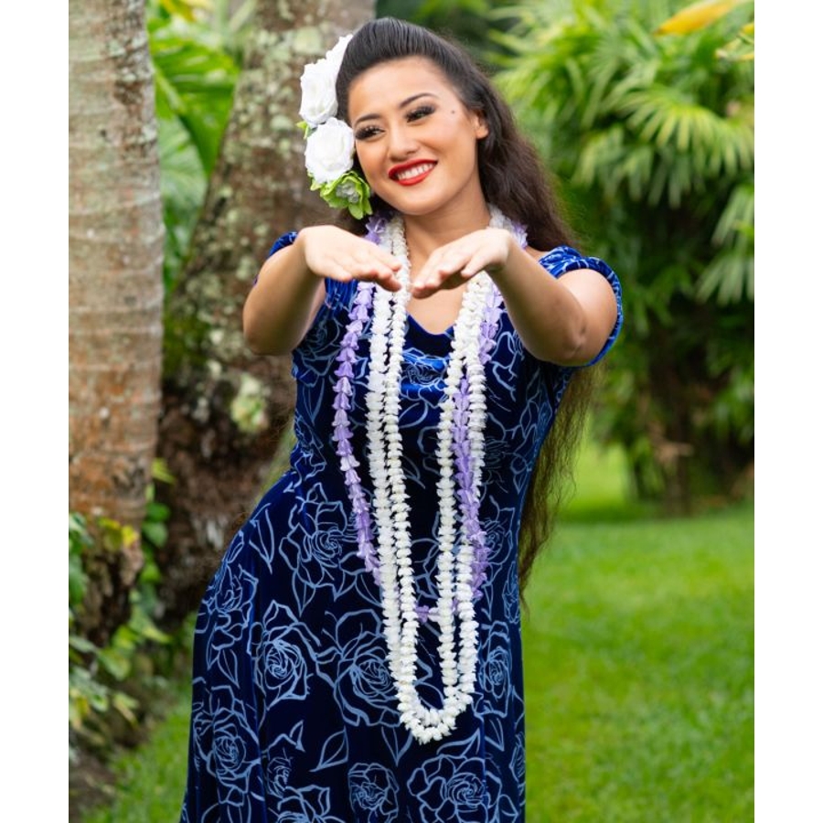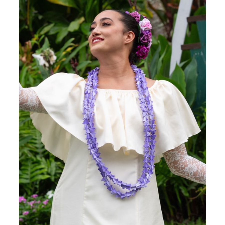 ハワイ王朝最後の王リリウオカラニ女王が愛したとされるクラウンフラワーのレイ。樹脂素材で軽くぷっくりとした本物に近いお花を表現しました。上品で高貴な雰囲気を漂わせてくれます。