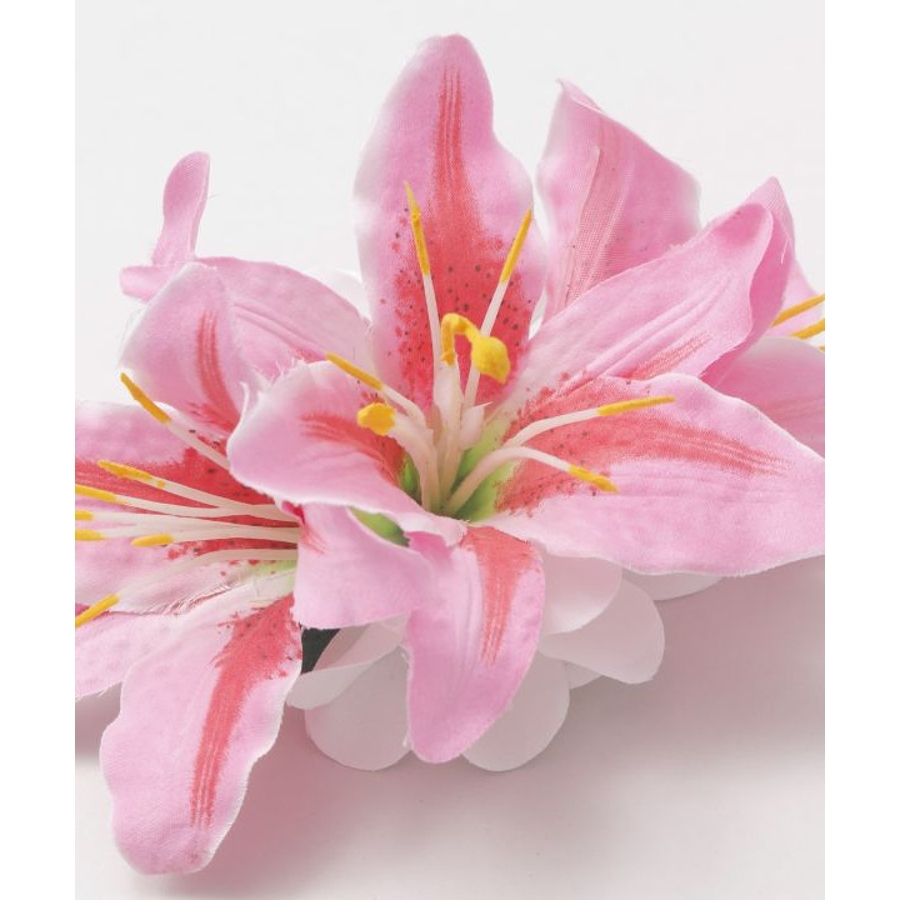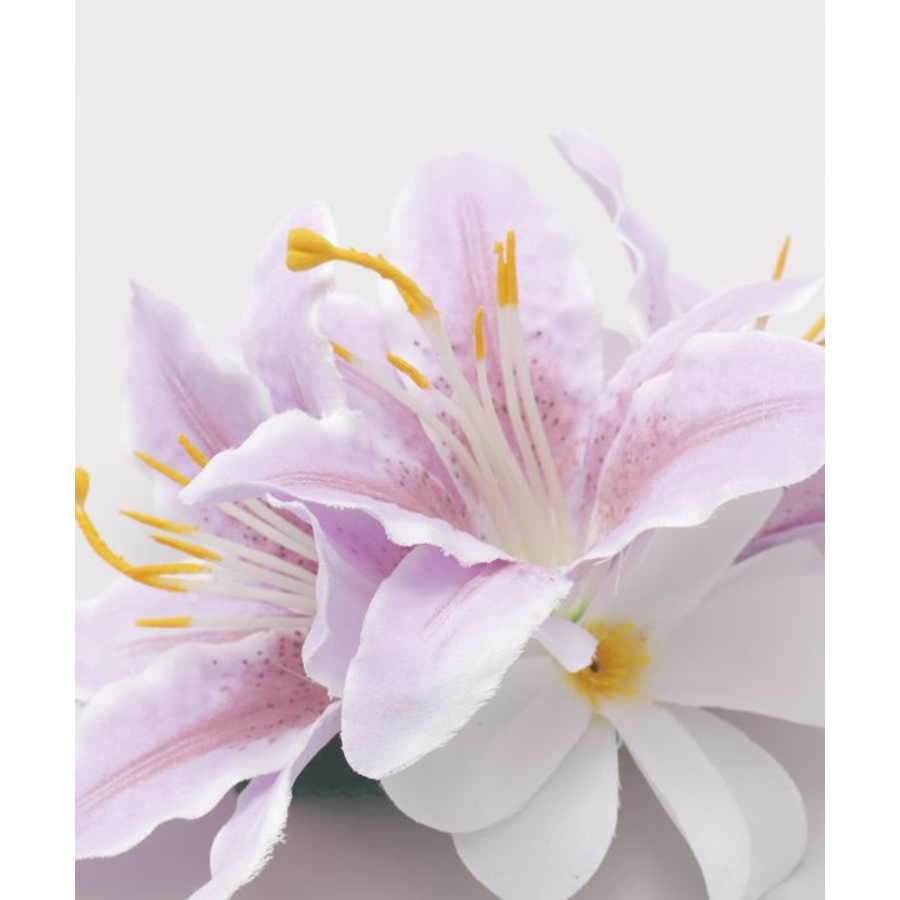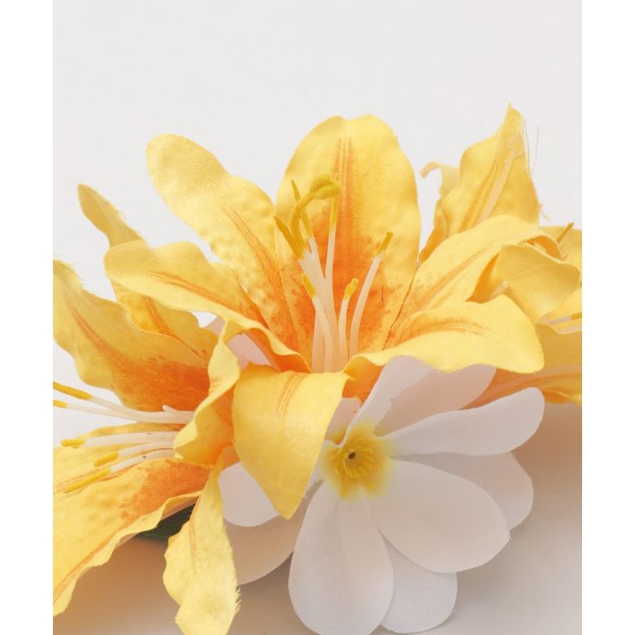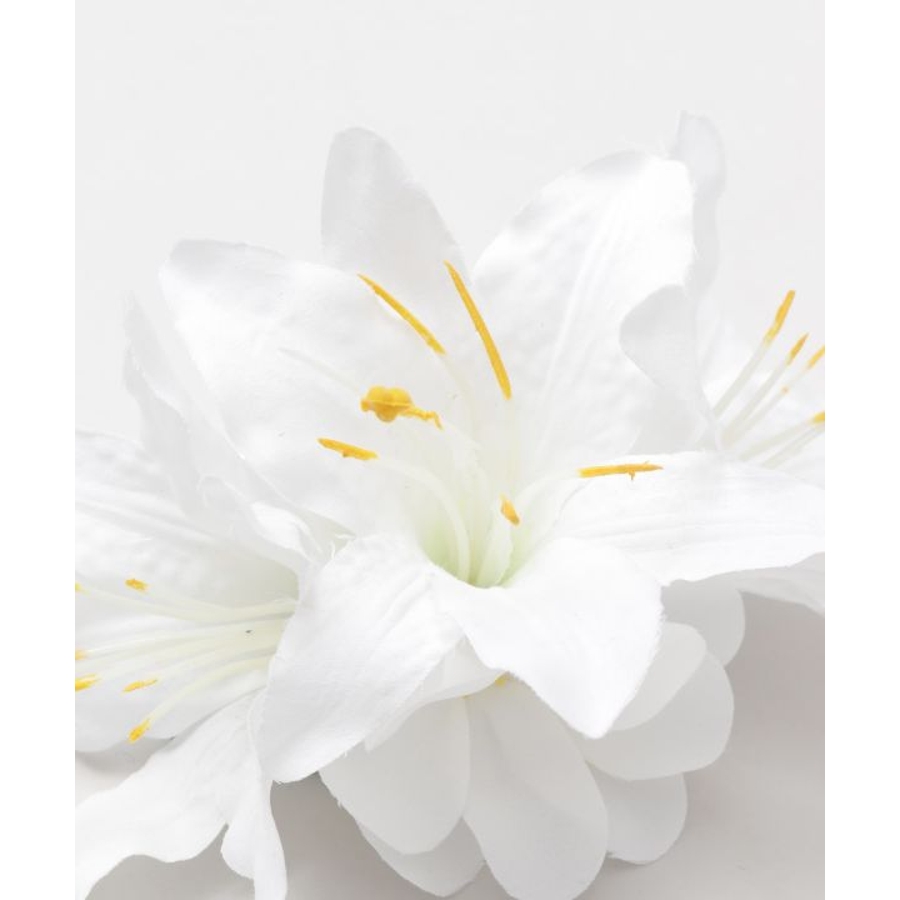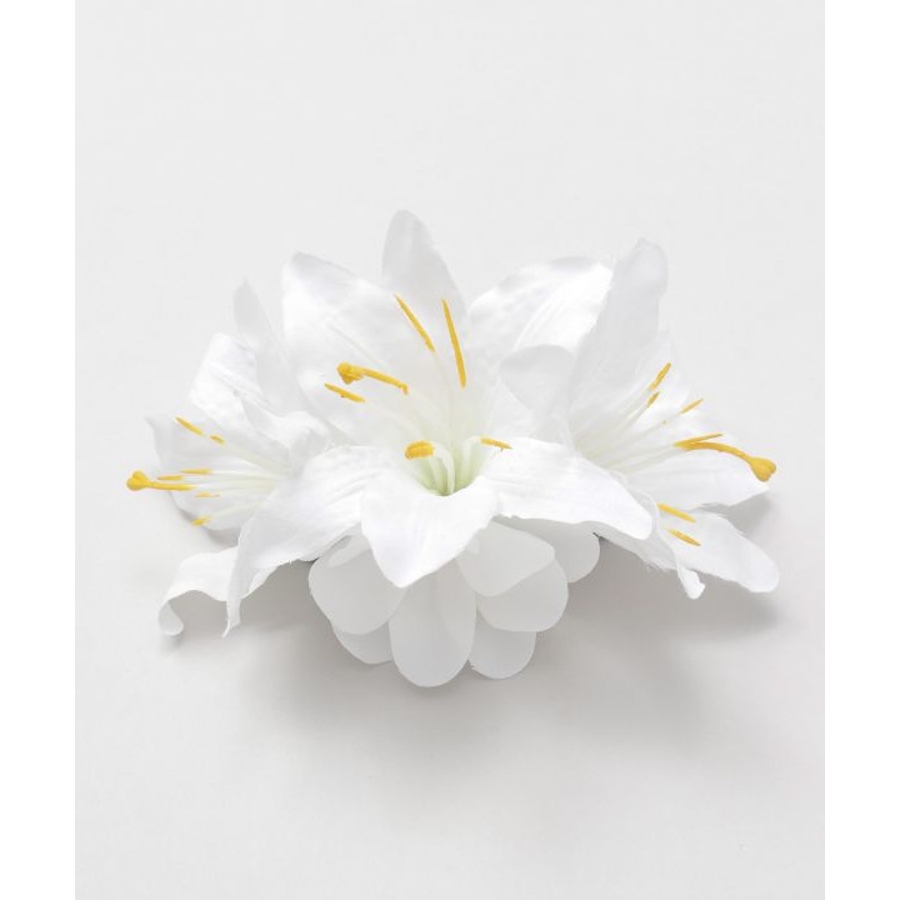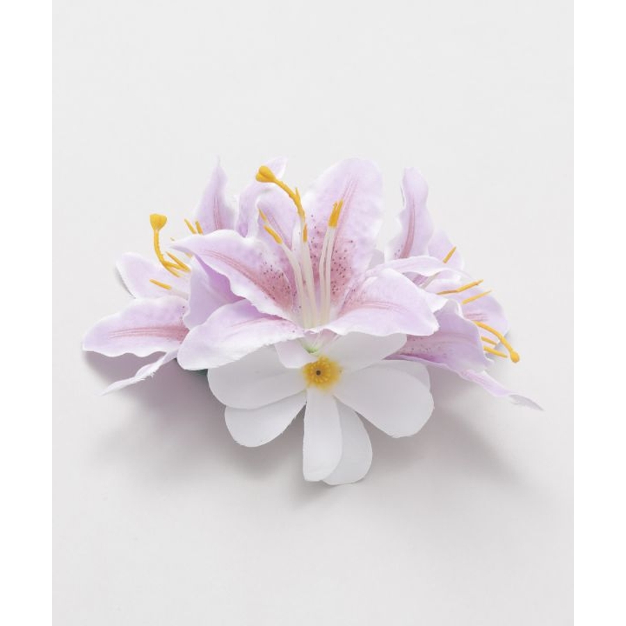 3輪のリリーに、2つの白いプルメリアをあしらった華やかなヘアクリップ。