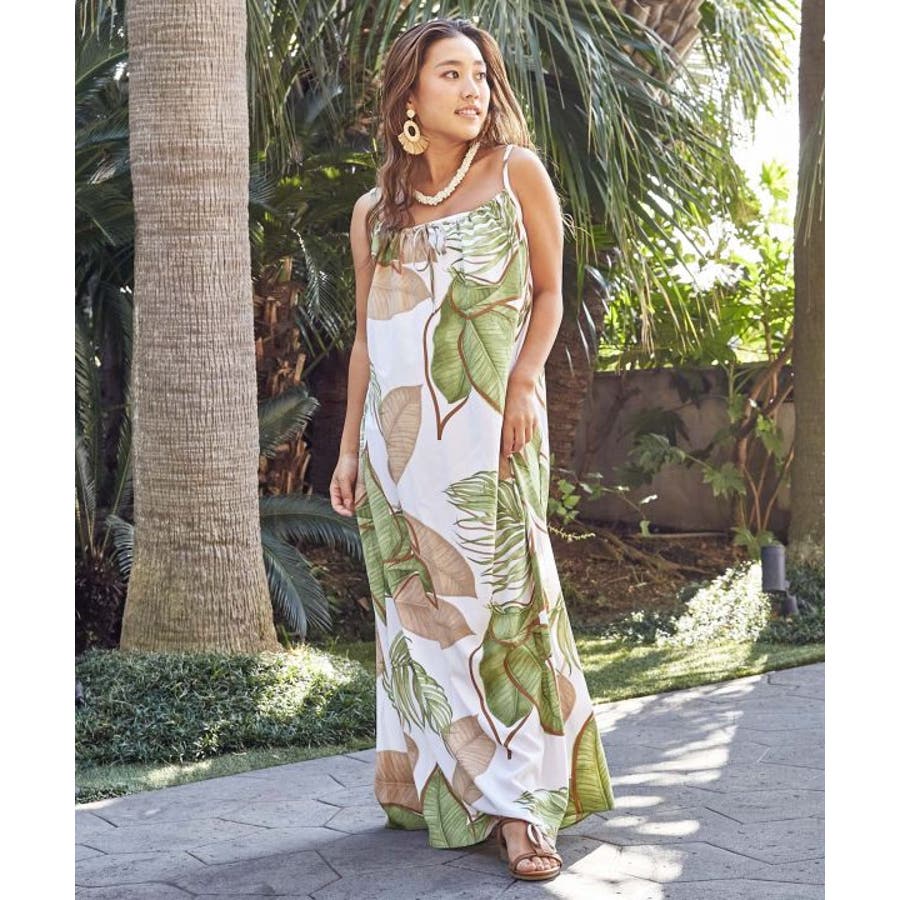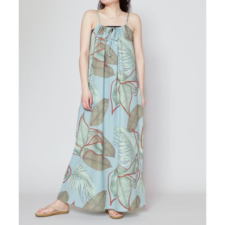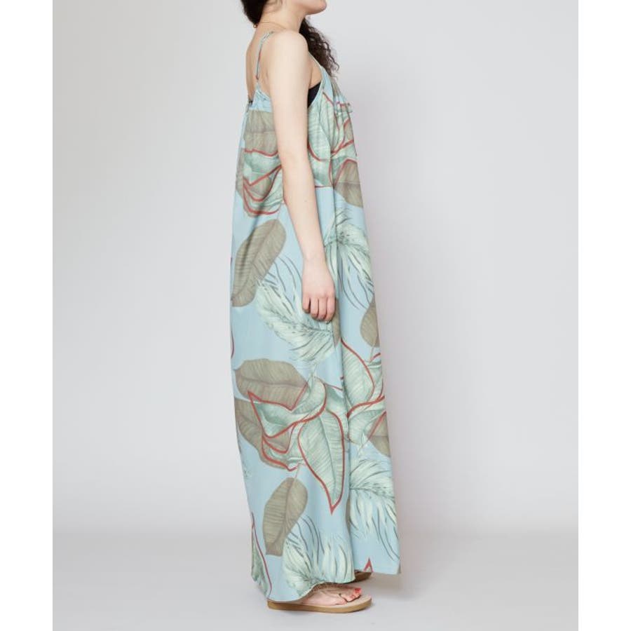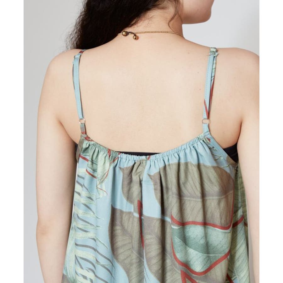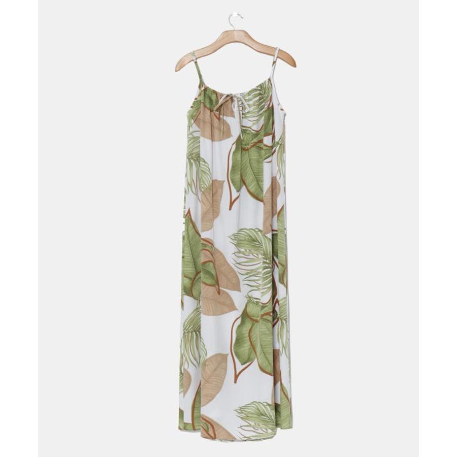 立体的に描かれたリーフが魅力的なキャミワンピース。優しい色合いのリーフ柄は柔らかな印象を与えてくれます。ポリエステル素材でさらっとした着心地。ウエスト回りもゆったりとしたサイズ感で、デイリー使いはもちろん、フラステージの移動着などにもおすすめです。