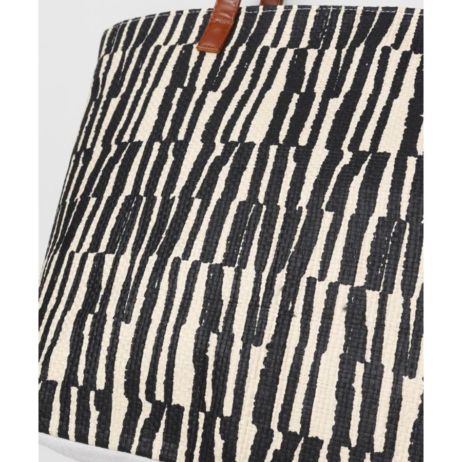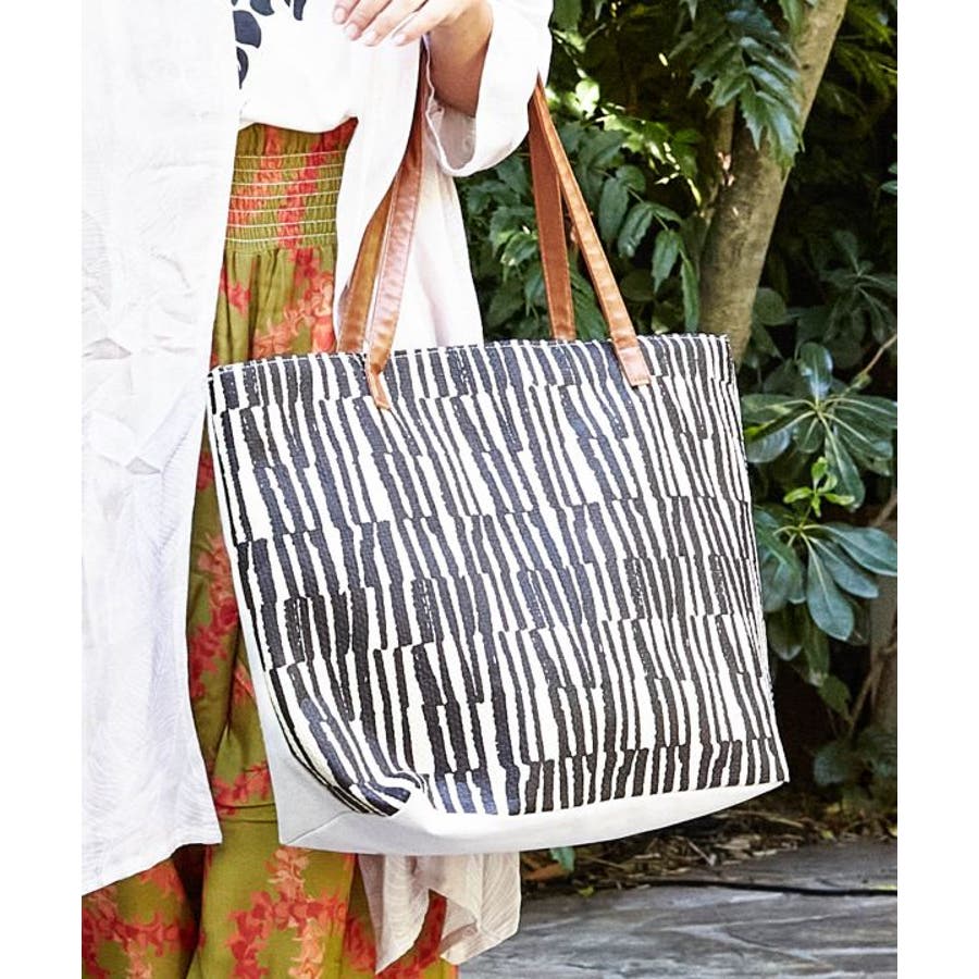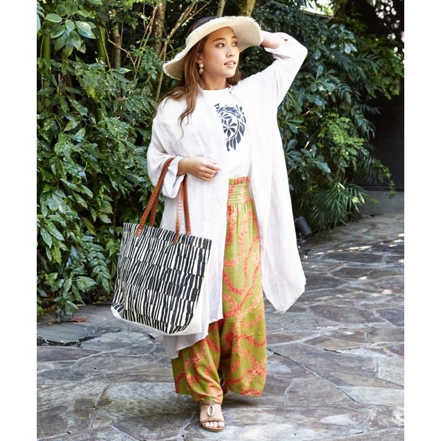 竹で作るスタンプを意味する「オヘカパラ」が描かれた大きめのバッグ。幾何学模様にハワイの伝統を感じます。マチが広く大容量のバッグは、軽量素材で軽く、ファスナー・内ポケット付き。フラステージやレッスン、デイリー使いにおすすめ。取っ手との組み合わせが上品なデザインが魅力的です。