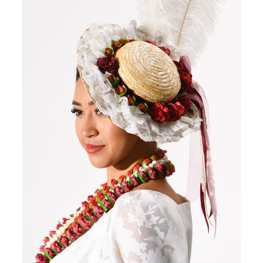 華やかなローズと繊細なレースで装飾されたクラシカルなハット。クリップ付きで着脱も簡単、しっかり固定できるのも嬉しいポイント。麦わら素材のナチュラル感とリボンのアクセントが、フラやイベント衣装に上品な可憐さを添えます。