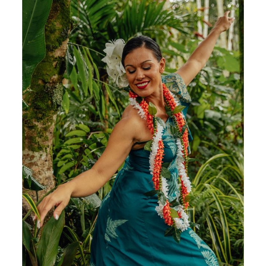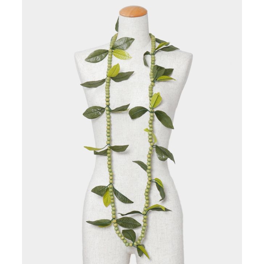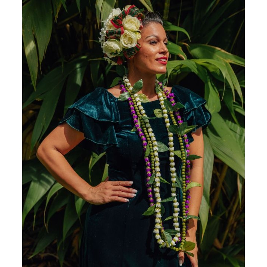 カウアイ島のシンボル花、モキハナ。モキハナにアクセントのマイレをあしらったロングレイ。他のレイとのコーディネートもおすすめです。