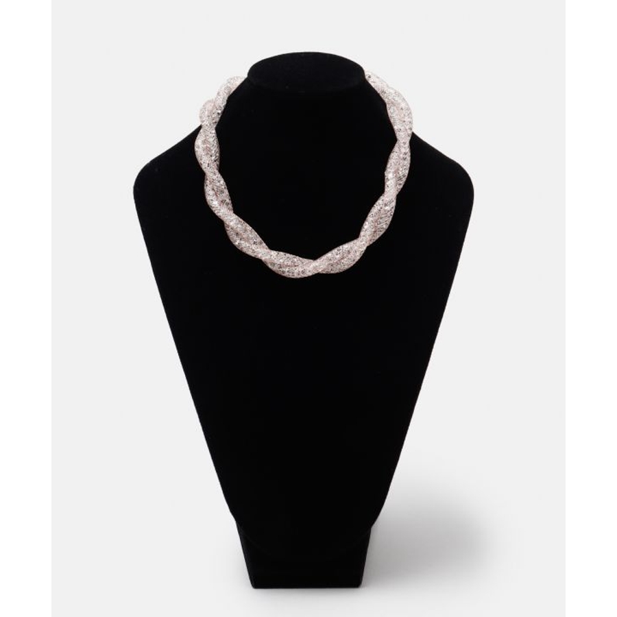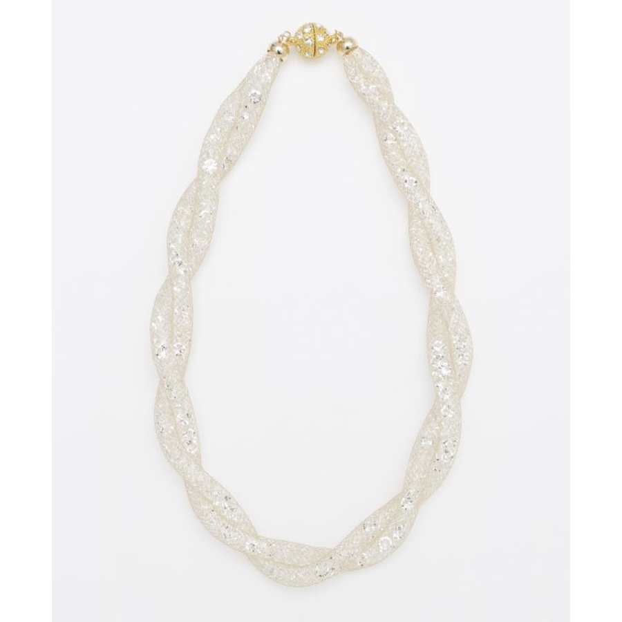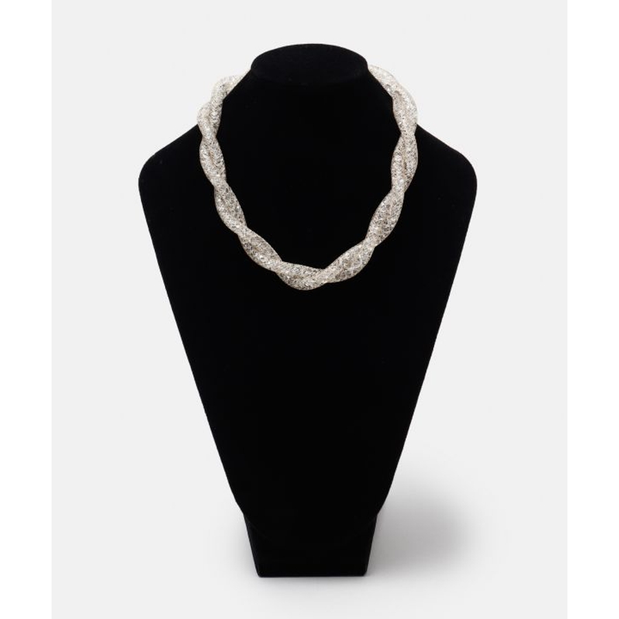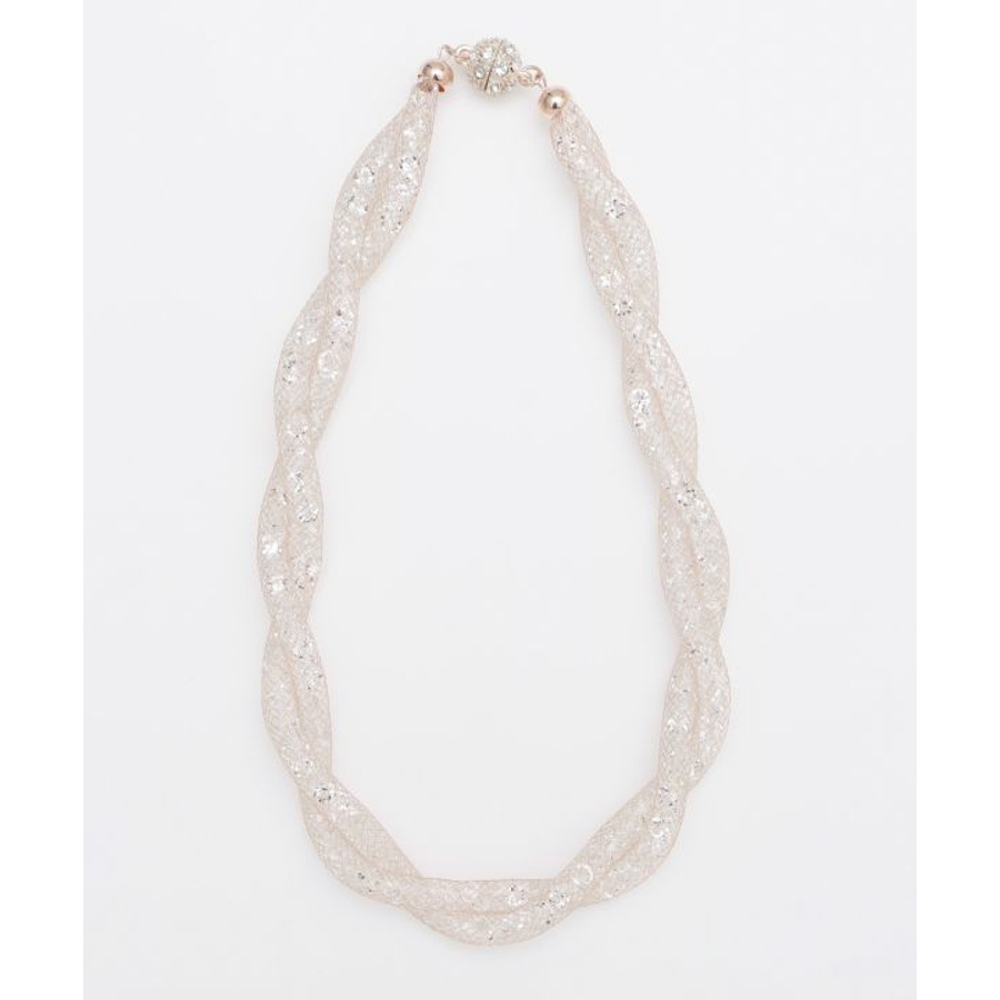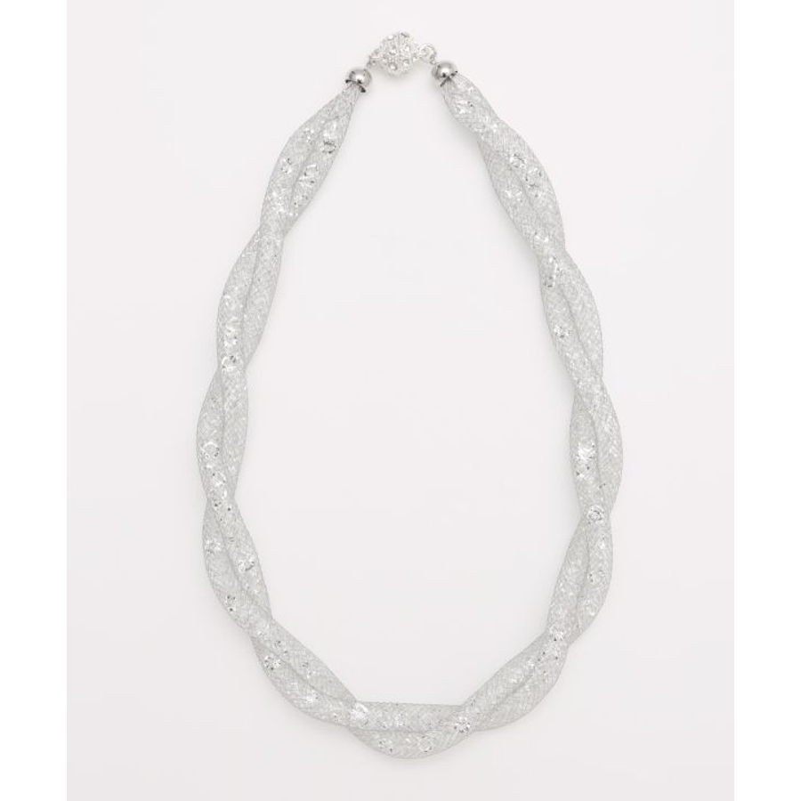 編み込んだワイヤーの中に煌めくビジューを閉じ込めたネックレス。2本をねじったようなデザインで、煌めくビジューが存在感を放ちます。光の角度によって変化する輝きは、まるでダイアモンドを纏っているかのよう。華やかで輝きのあるステージを演出します。