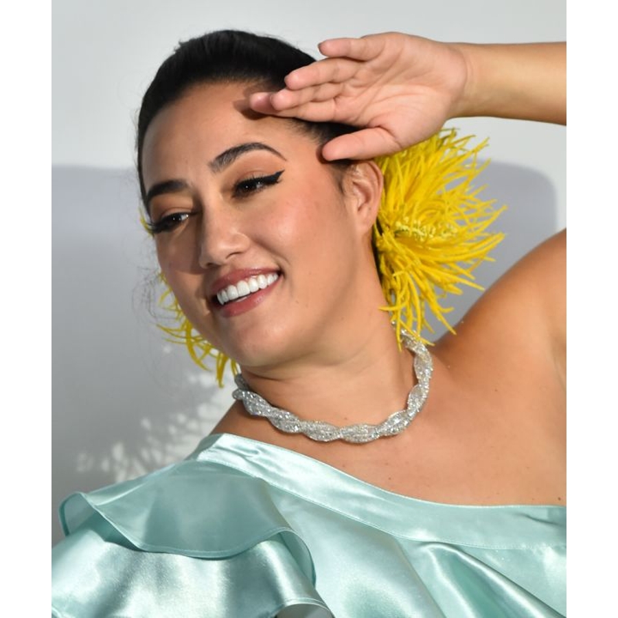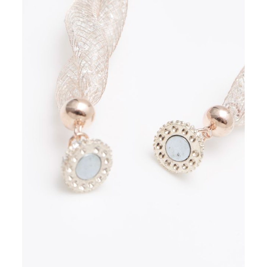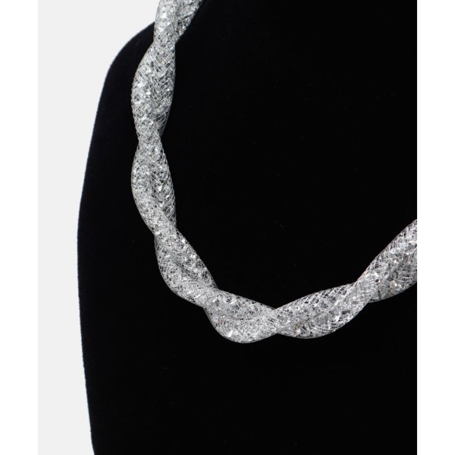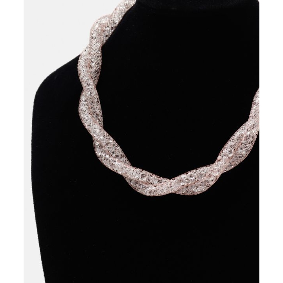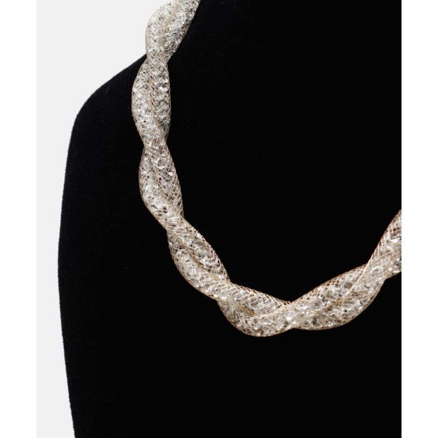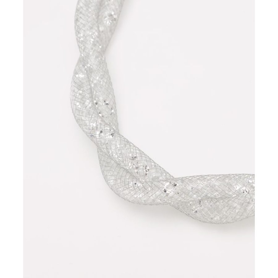編み込んだワイヤーの中に煌めくビジューを閉じ込めたネックレス。2本をねじったようなデザインで、煌めくビジューが存在感を放ちます。光の角度によって変化する輝きは、まるでダイアモンドを纏っているかのよう。華やかで輝きのあるステージを演出します。