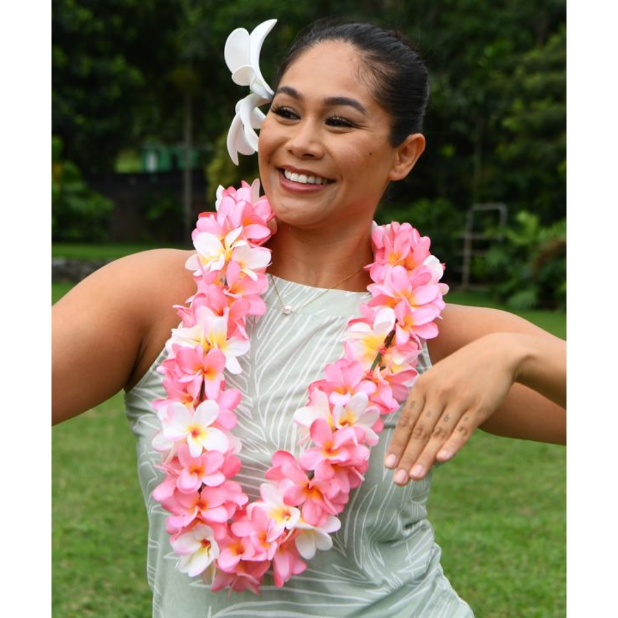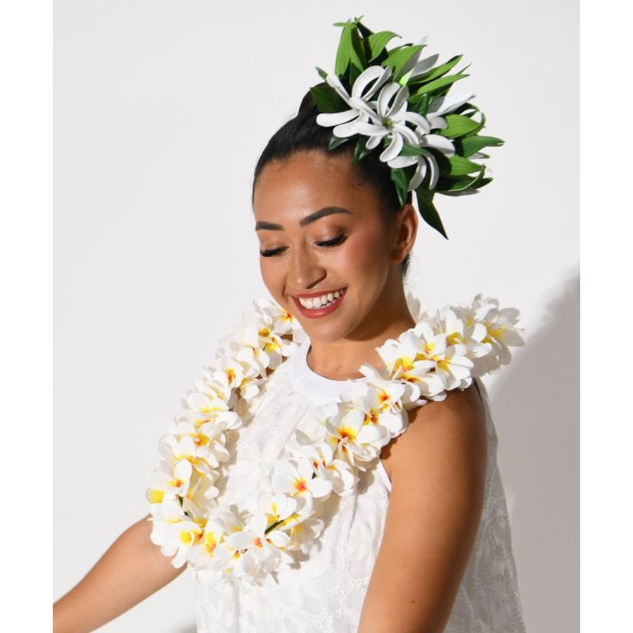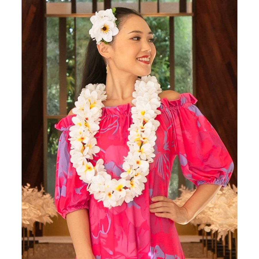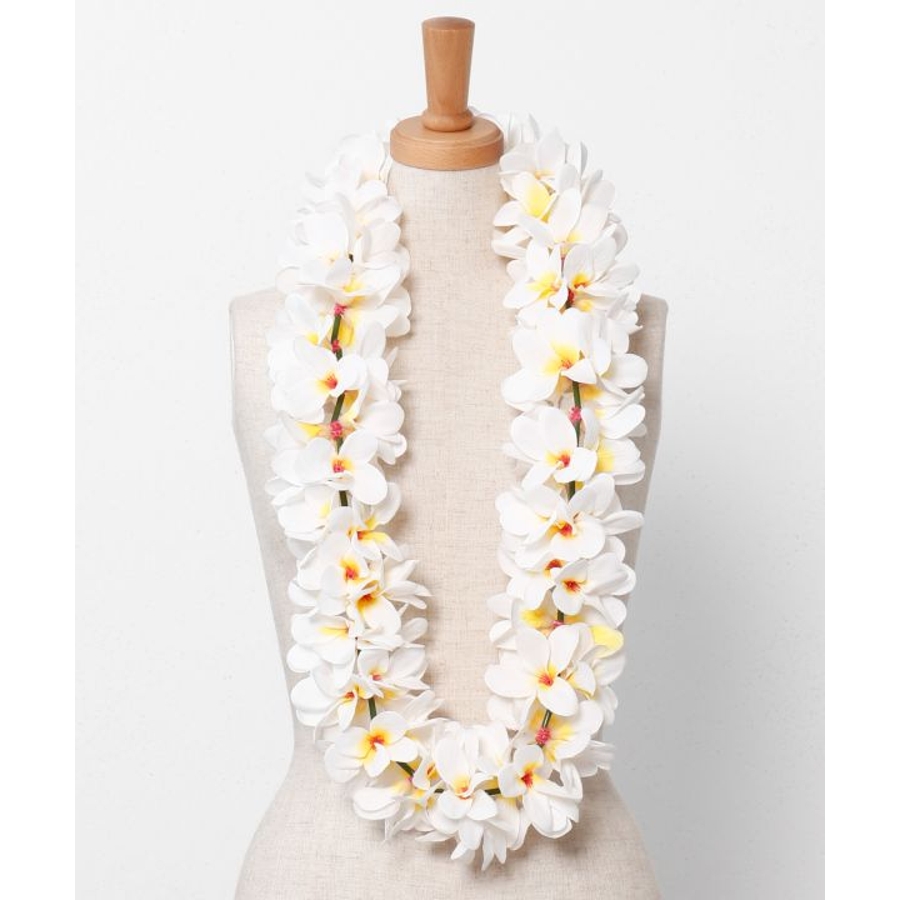 立体感のあるプルメリアをふんだんにあしらったボリュームレイ。遠くからでも目を惹く華やかさで、ステージの表情を一層豊かに演出します。