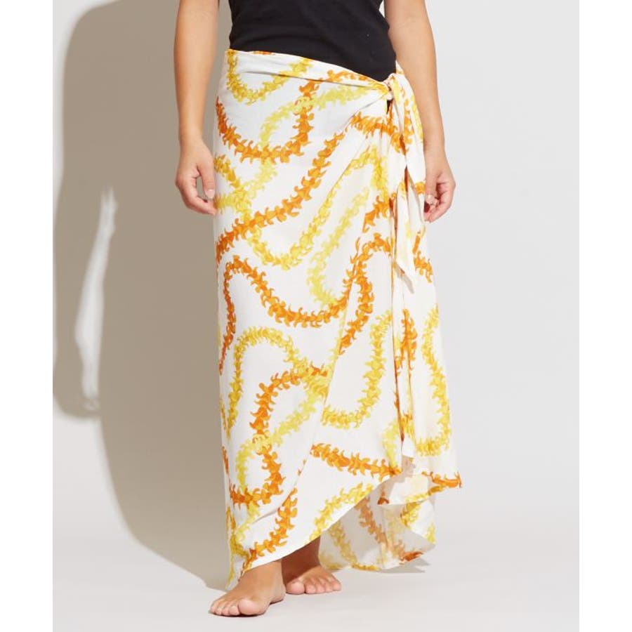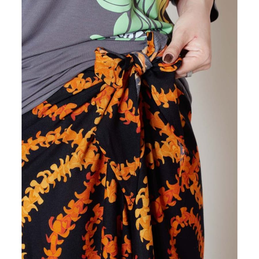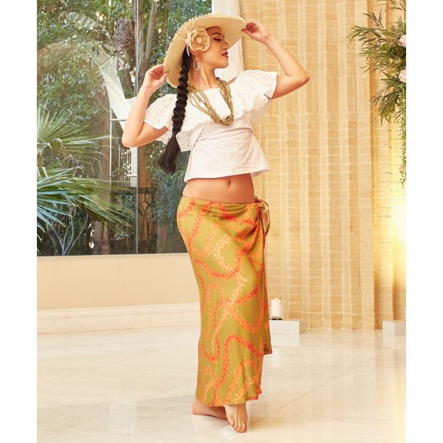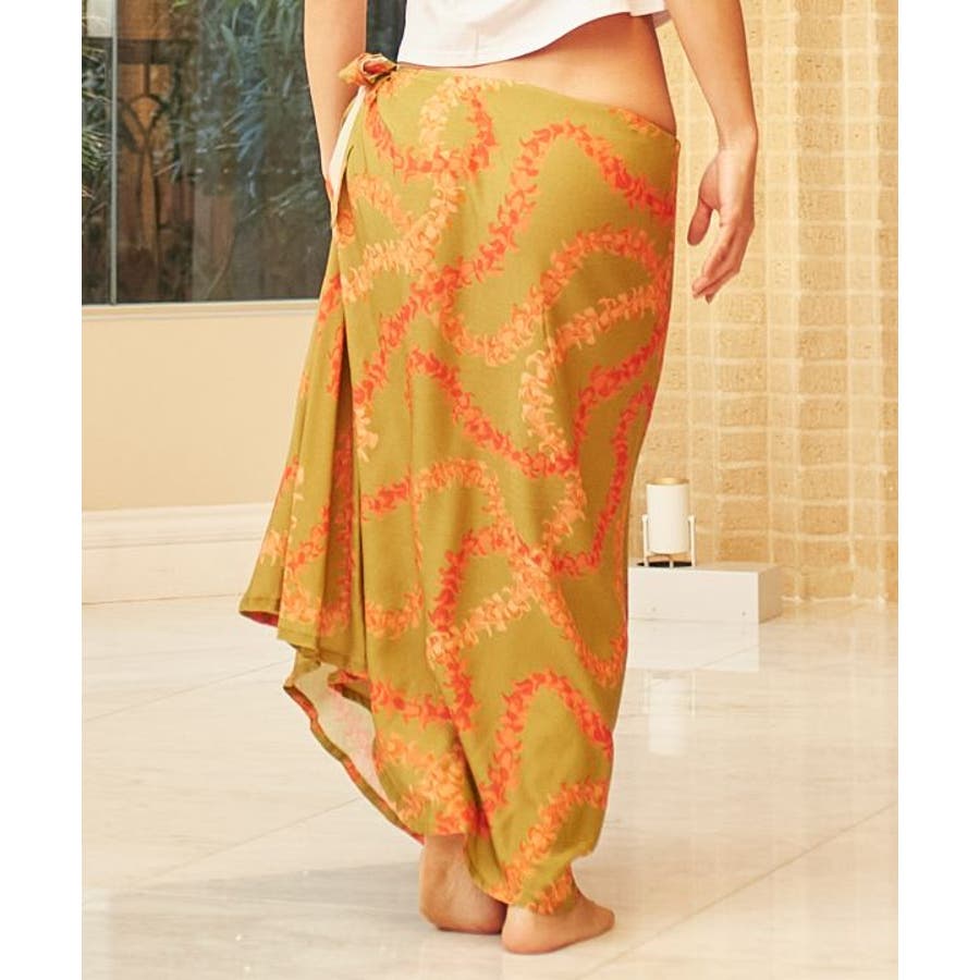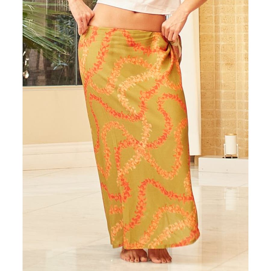 神聖な花ケニケニのレイが色彩豊かに、立体的に表現された美しいデザインのパレオ。スカートの形になっているので、結ぶだけで綺麗に着こなすことができます。ウエスト部分をロールアップしてスカート丈の調整も可能です。スカートとしてはもちろん、胸元まで上げてホルターネックやベアトップのワンピースにもアレンジできます。ステージの早着替えにも大活躍し、レッスンや移動着にもお使いいただけます。