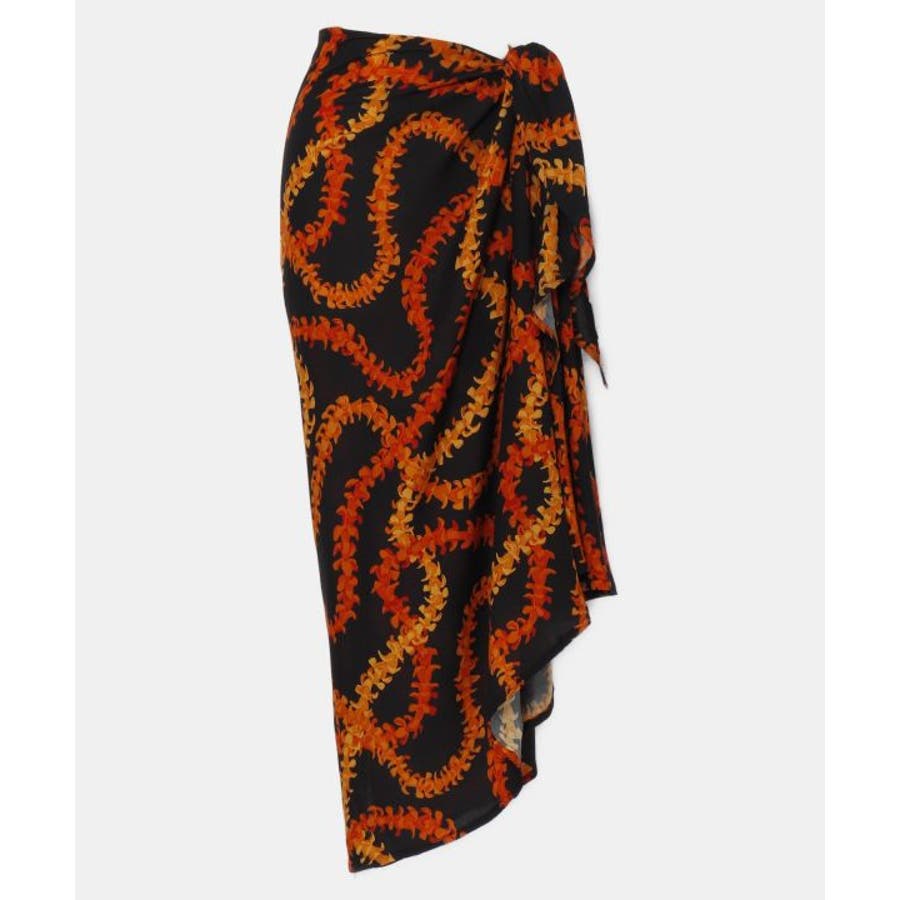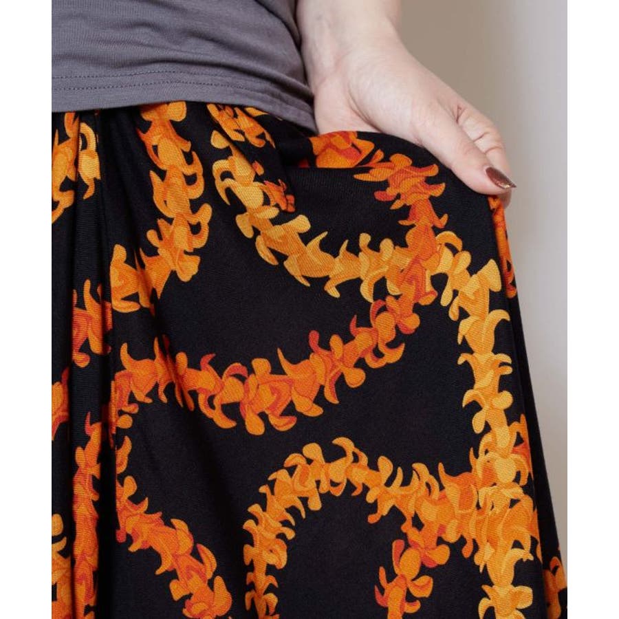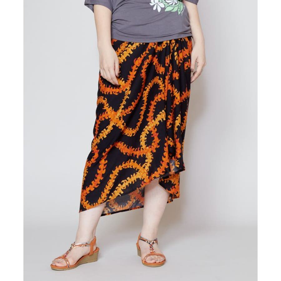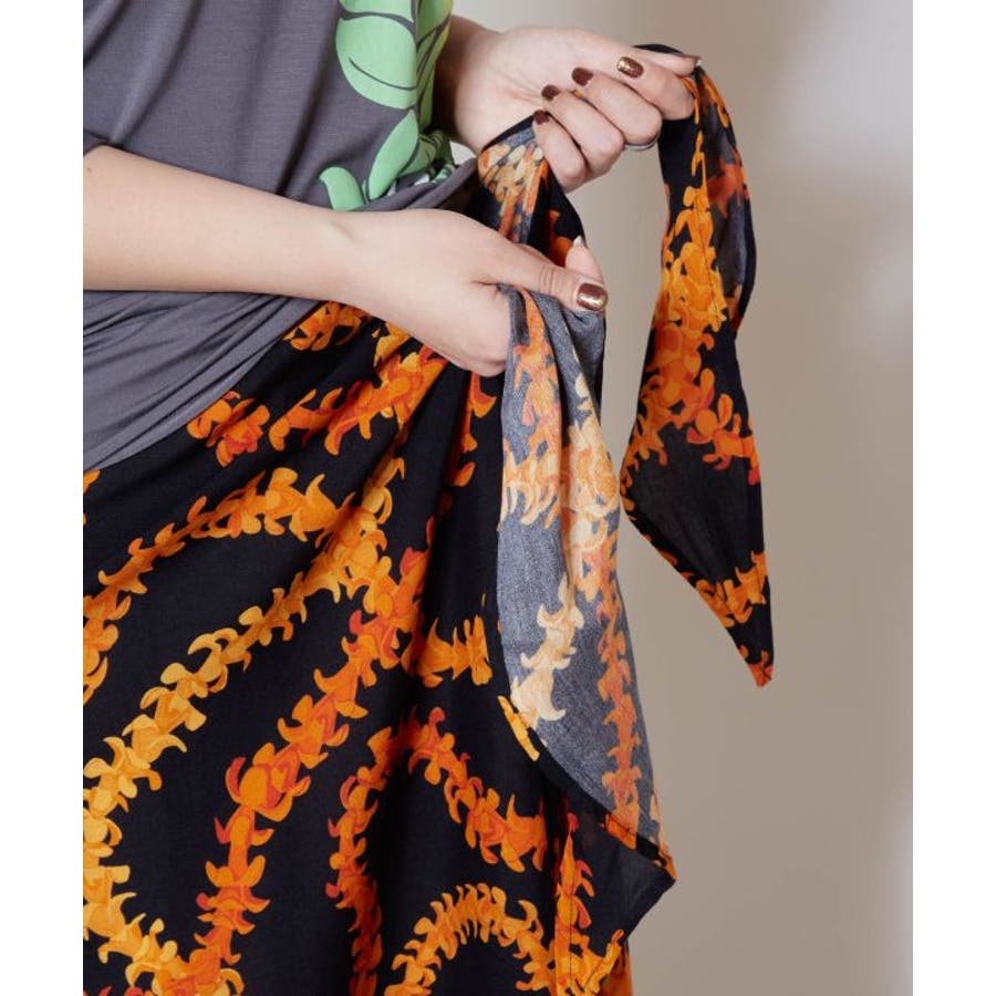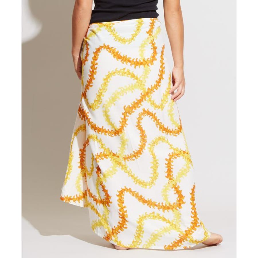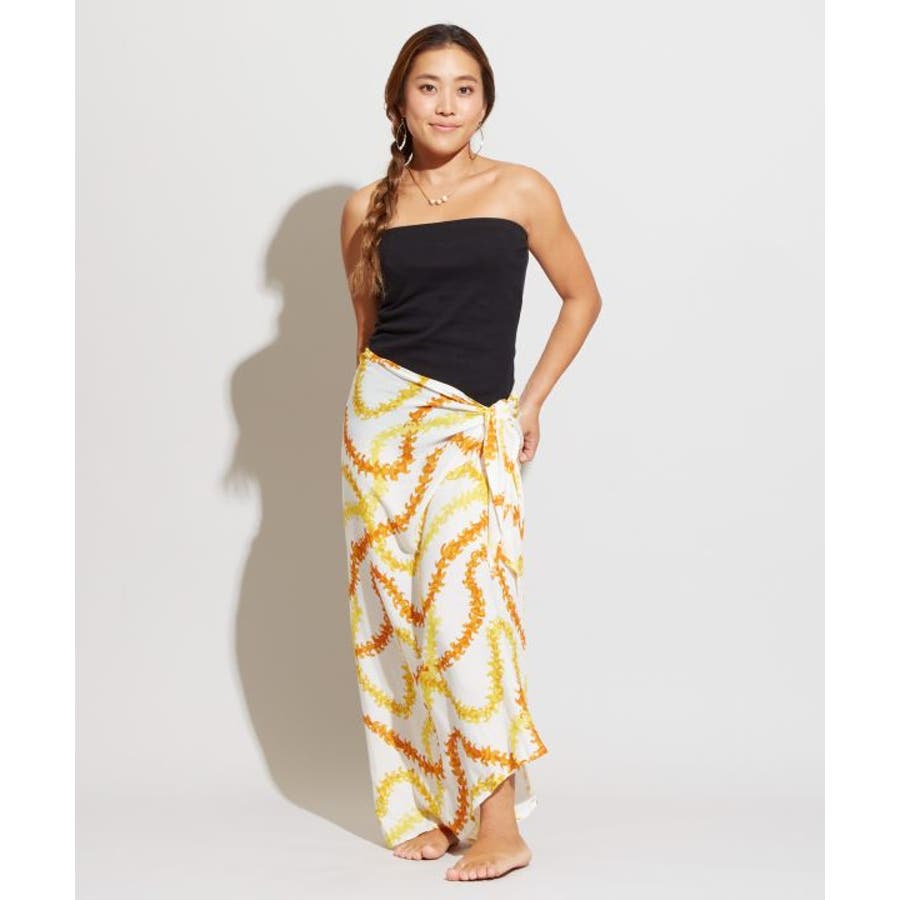 神聖な花ケニケニのレイが色彩豊かに、立体的に表現された美しいデザインのパレオ。スカートの形になっているので、結ぶだけで綺麗に着こなすことができます。ウエスト部分をロールアップしてスカート丈の調整も可能です。スカートとしてはもちろん、胸元まで上げてホルターネックやベアトップのワンピースにもアレンジできます。ステージの早着替えにも大活躍し、レッスンや移動着にもお使いいただけます。