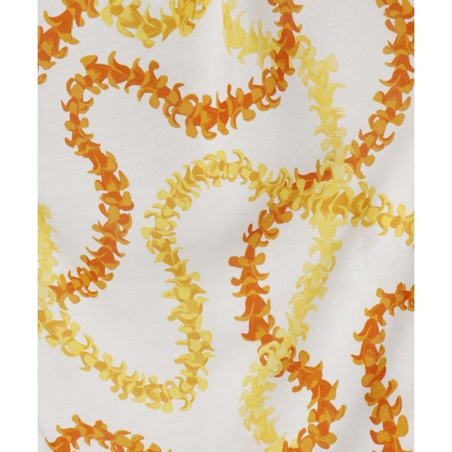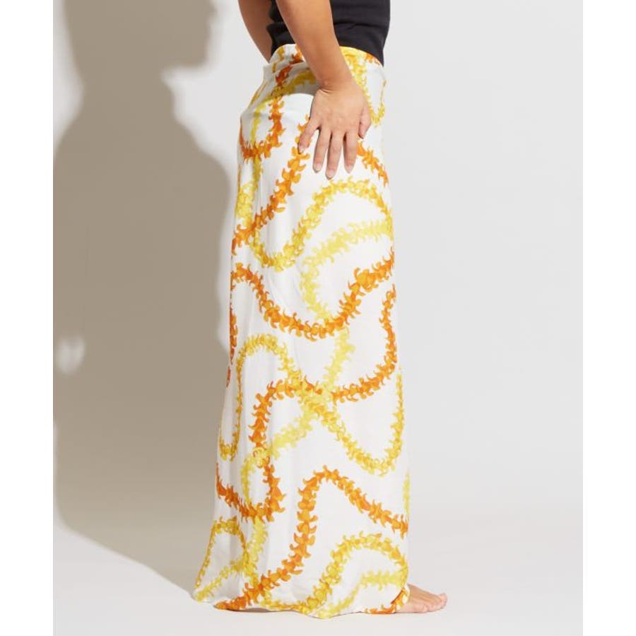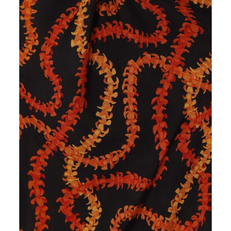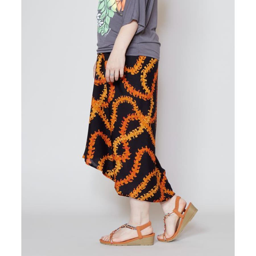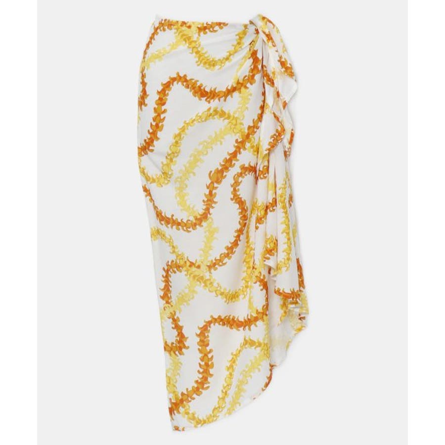 神聖な花ケニケニのレイが色彩豊かに、立体的に表現された美しいデザインのパレオ。スカートの形になっているので、結ぶだけで綺麗に着こなすことができます。ウエスト部分をロールアップしてスカート丈の調整も可能です。スカートとしてはもちろん、胸元まで上げてホルターネックやベアトップのワンピースにもアレンジできます。ステージの早着替えにも大活躍し、レッスンや移動着にもお使いいただけます。