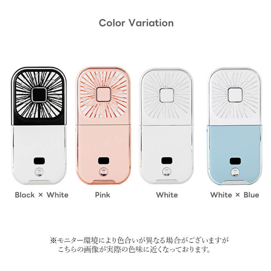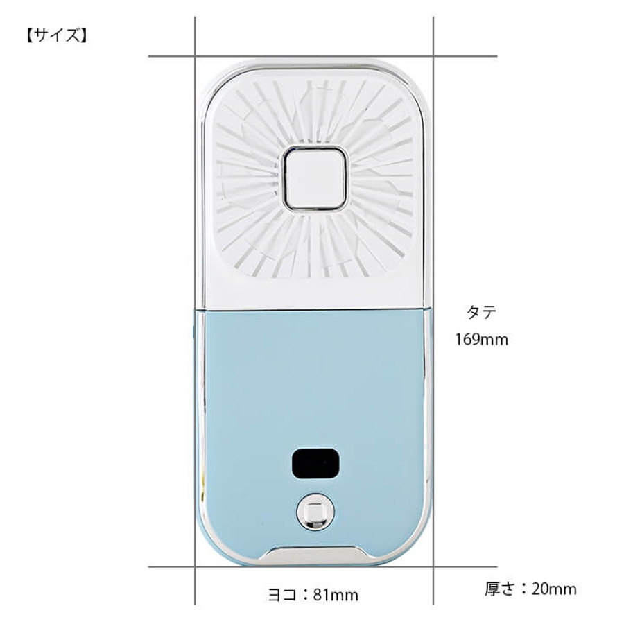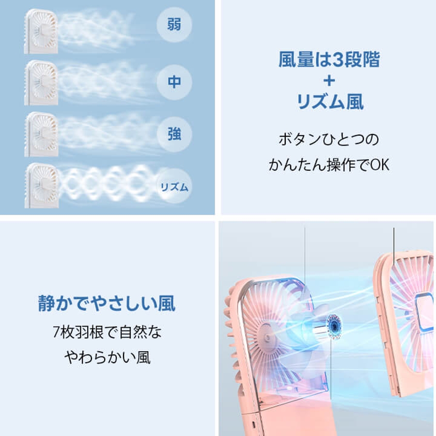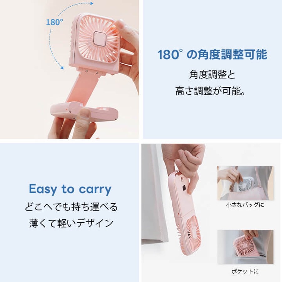 手持ち扇風機、首掛け扇風機、卓上扇風機、スマホスタンド、モバイルバッテリーとして使える5way仕様。