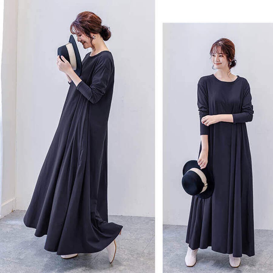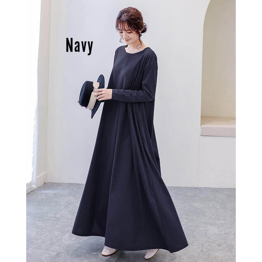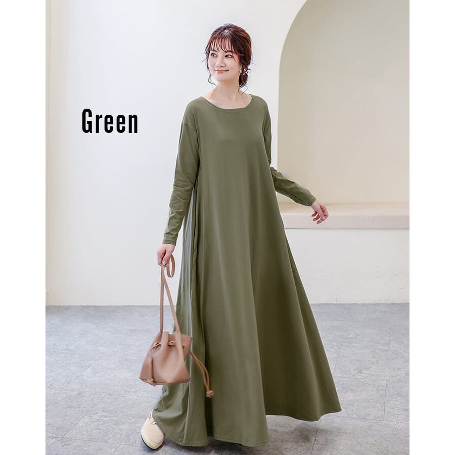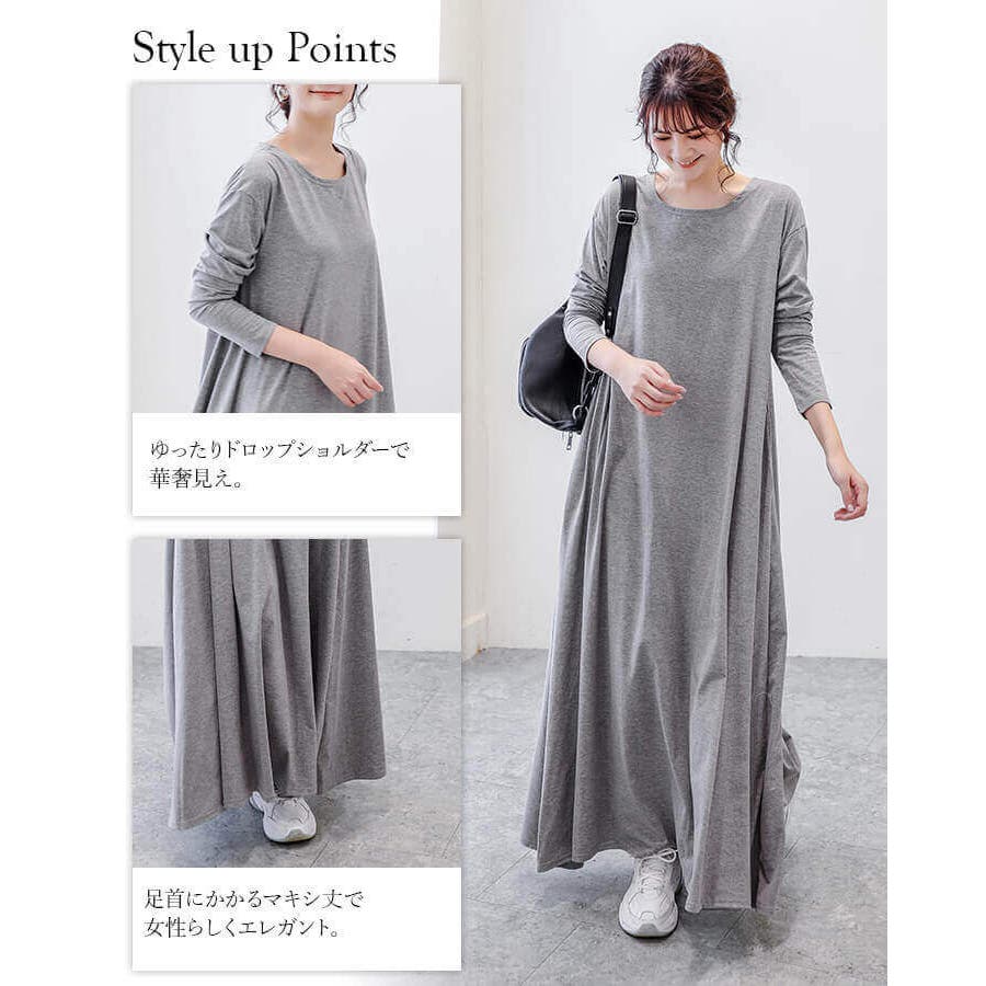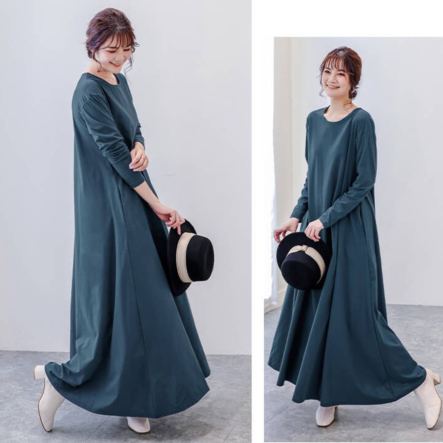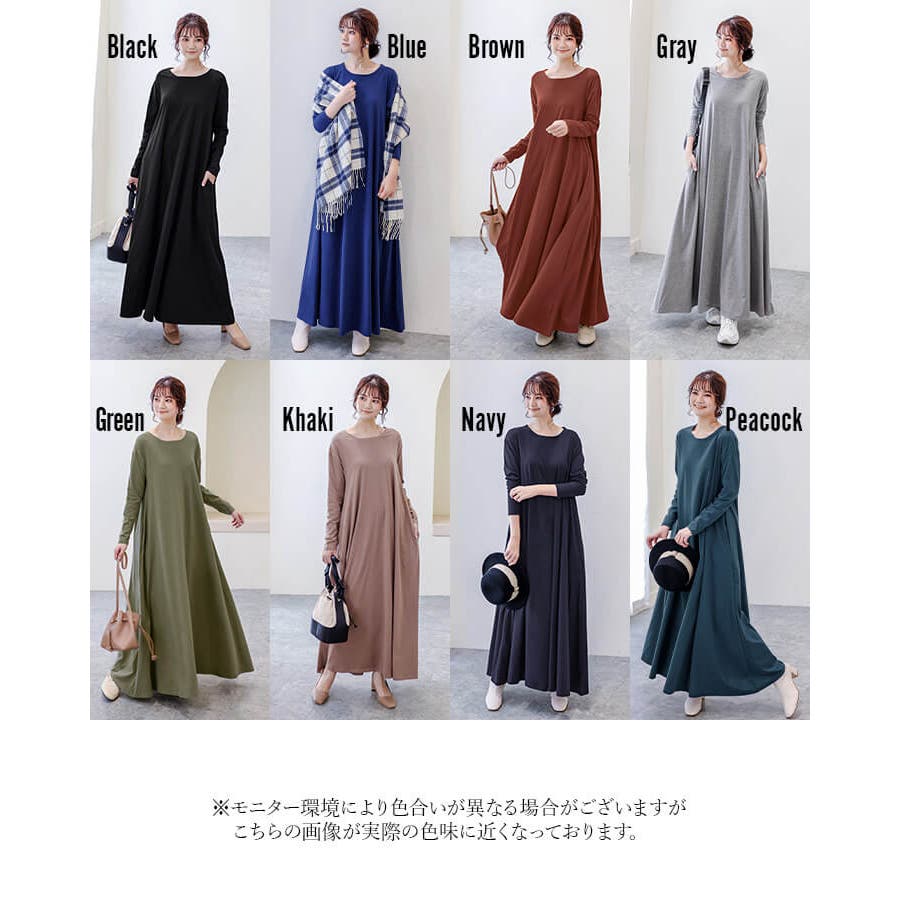 マキシ丈ワンピ Tシャツ ロング 長袖 ロンT 大人カジュアル ヌケ感 ワンピース 無地 シンプル マキシワンピース ドロップショルダー ビッグT ロングT Tee クルーネック 細見え 二の腕カバー 長め丈 ゆるワンピ フレア 抜け感 くすみカラー ブラック ブルー ブラウン グレー グリーン カーキ ネイビー ピーコック