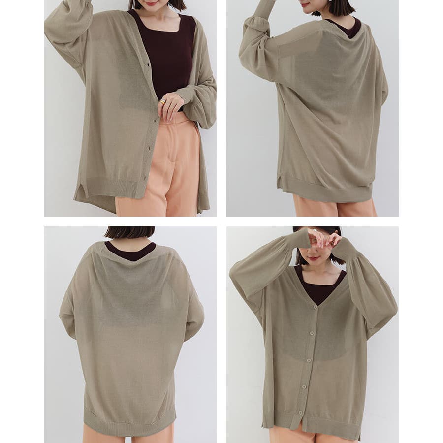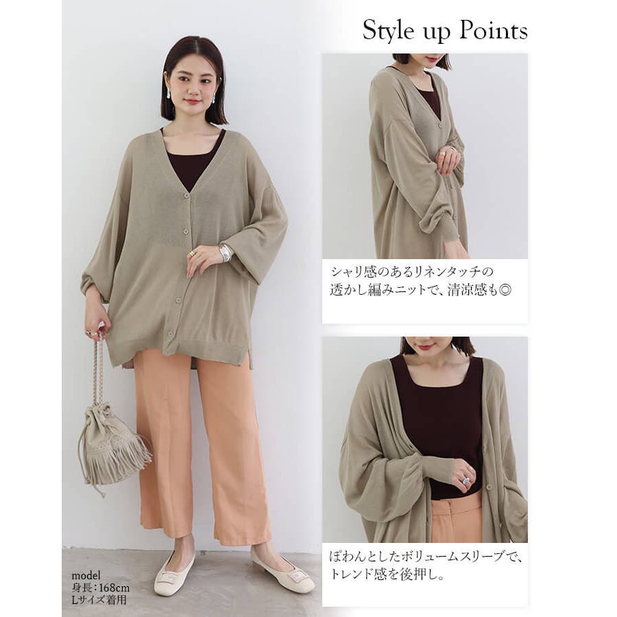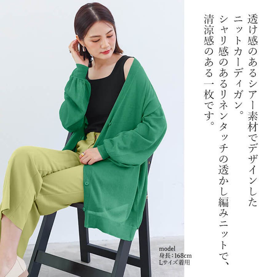 ニットカーディガン ニット カーディガン 20代 30代 40代 透け感 シアー素材 シャリ感 リネンタッチ 透かし編み 涼しい 清涼感 ぽわん ボリュームスリーブ トレンド ゆったり シンプル ロングシーズン 着回し スリット 抜け感 さりげない 大人 ママ カジュアル レディース ベージュ 肌色 ブラック 黒 ブラウン 茶 グレー 灰 グリーン 緑 ライトグリーン ライトパープル 紫 ネイビー 紺 藍 青 水色 黄色 焦げ茶 深緑 灰色 袖あり 長袖 tops29 M L
