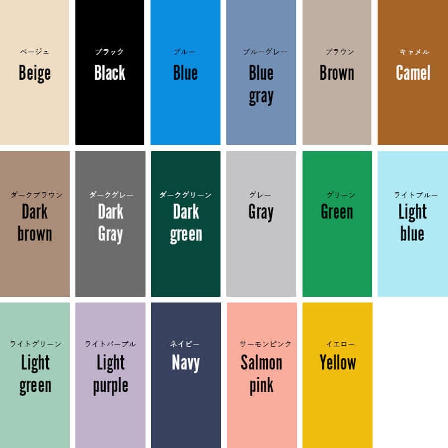 | カラー | ベージュ / ブラック / ブラウン / グレー / グリーン / ライトグリーン / ライトパープル / ネイビー / ブルー / ブルーグレー / キャメル / ダークブラウン / ダークグリーン / ライトブルー / サーモンピンク / イエロー / ダークグレー |