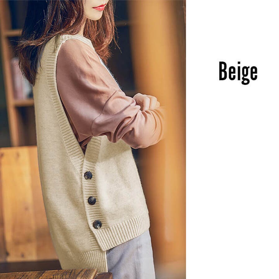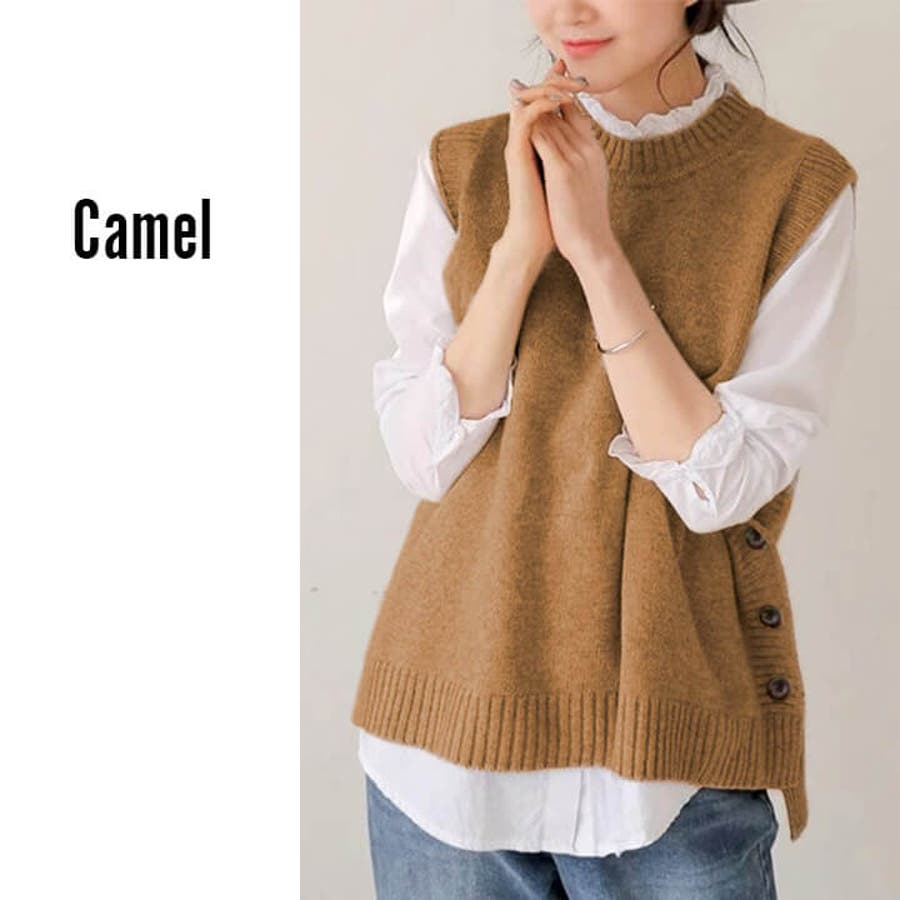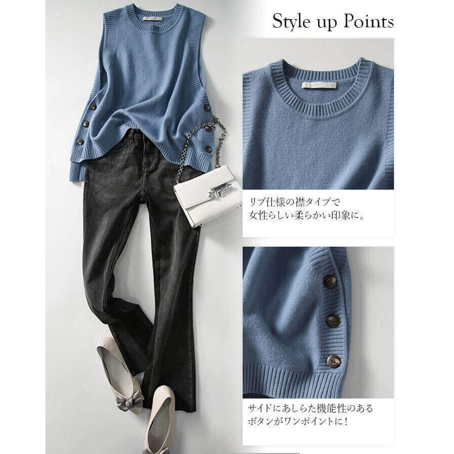 ニットベスト Uネック Vネック 2タイプ サイドボタン 温かい あったかい お洒落 柔らかい アシンメトリー ヒップカバー 体型カバー シンプル 厚手 秋 冬 ゆったり 20代 30代 40代 大人 落ち着き ママ レディース ブラック 黒 ブルー 青 コーヒー 茶 グレー 灰 ライトブラウン 肌色 ネイビー 紺 藍 ベージュ キャメル ダークグリーン 緑 深緑 ライトグレー オリーブグリーン yctops32 M L XL