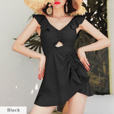 商品説明 | バストと裾部分の紐をドロストすることで違った見せ方が楽しめるワンピースタイプの水着です。スカート部分の中は一体型のボトムになっているのでウォータースライダーなどでも安心。肩のフリルが体型カバーにも一役かってくれます。 |