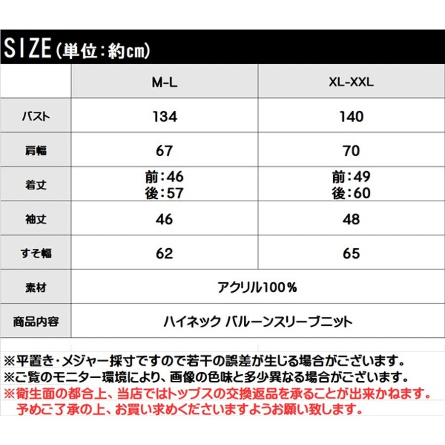 【M-L】バスト:134cm/肩幅:67cm/着丈:前身ごろ:46cm、後ろ身ごろ:57cm/袖丈:46cm/裾幅:62cm