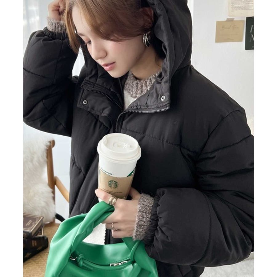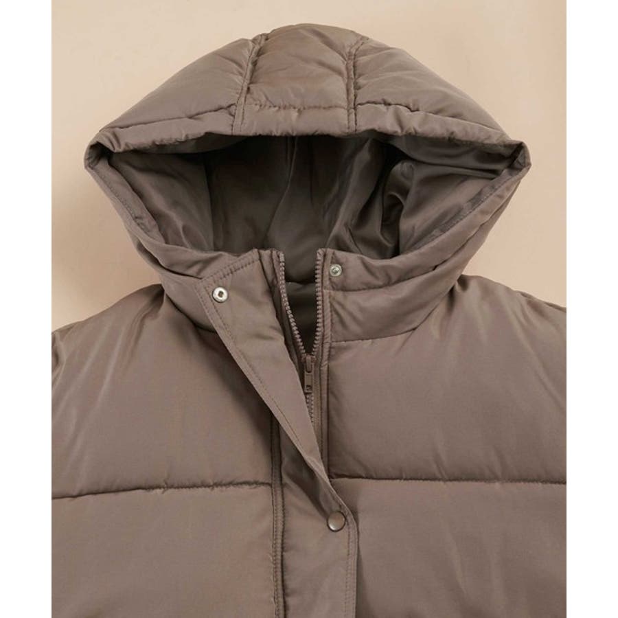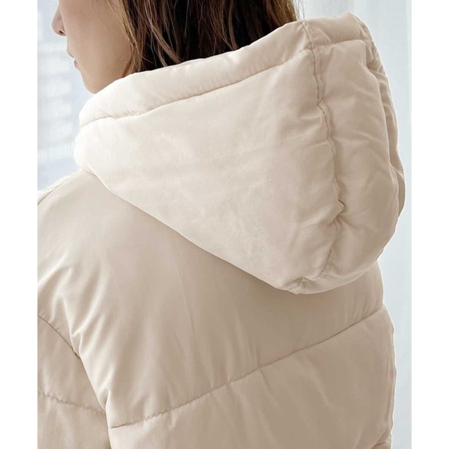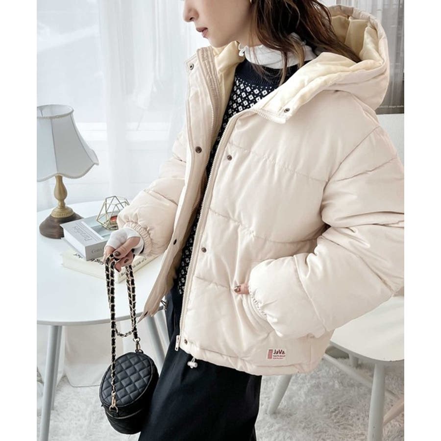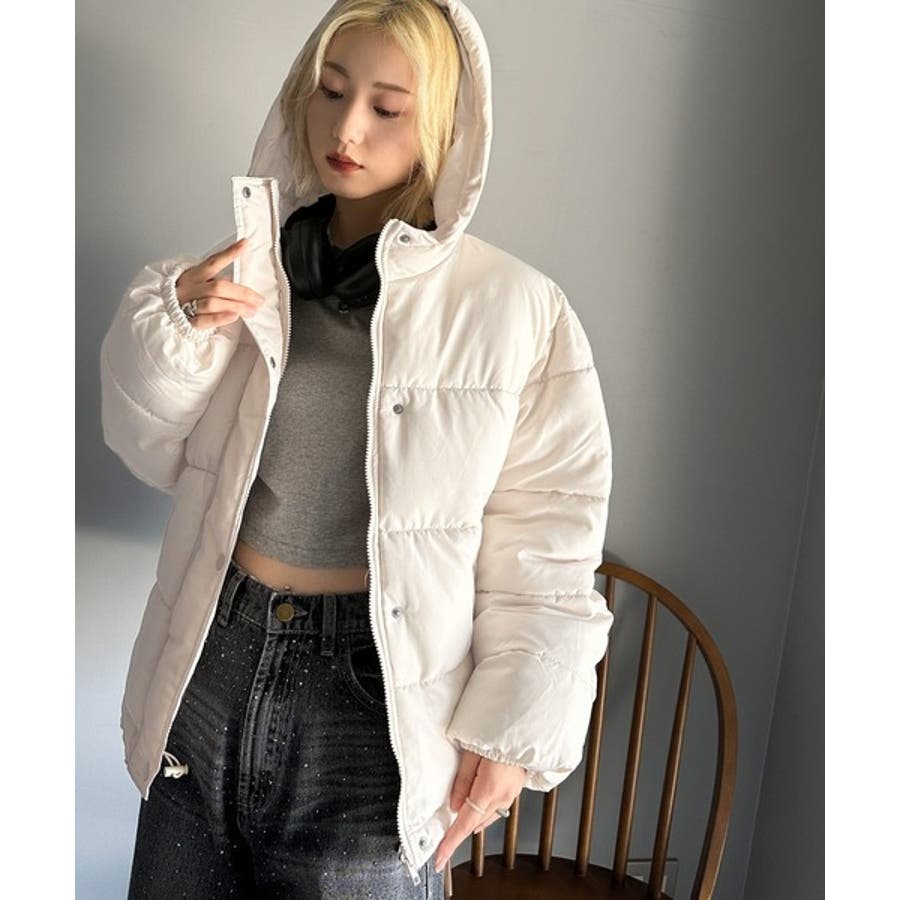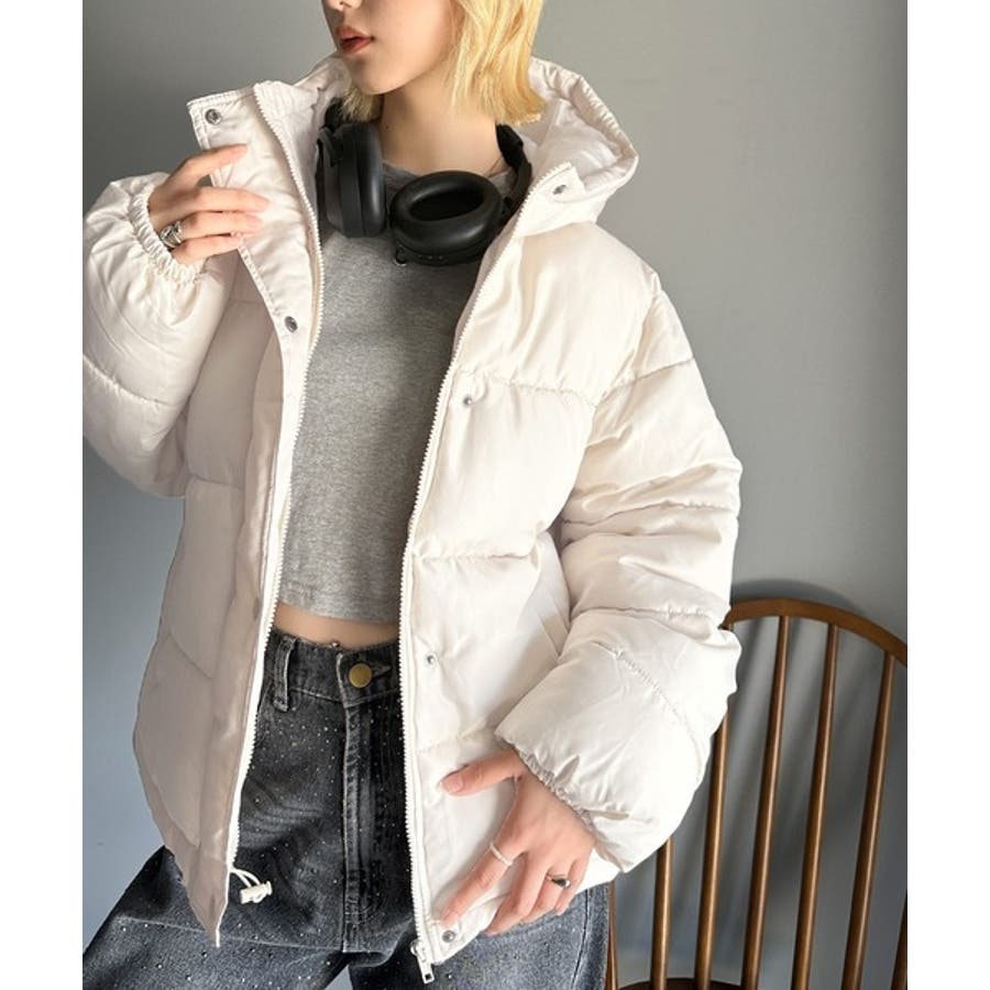 フード付きフェイクダウンコート。