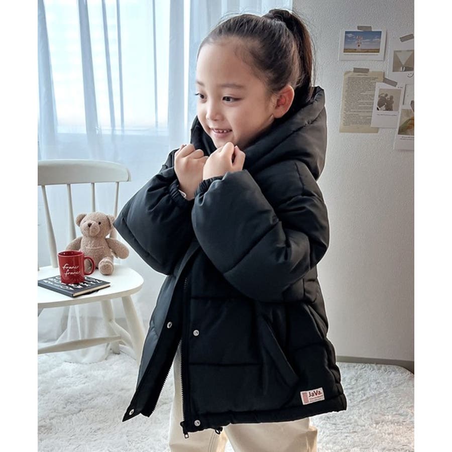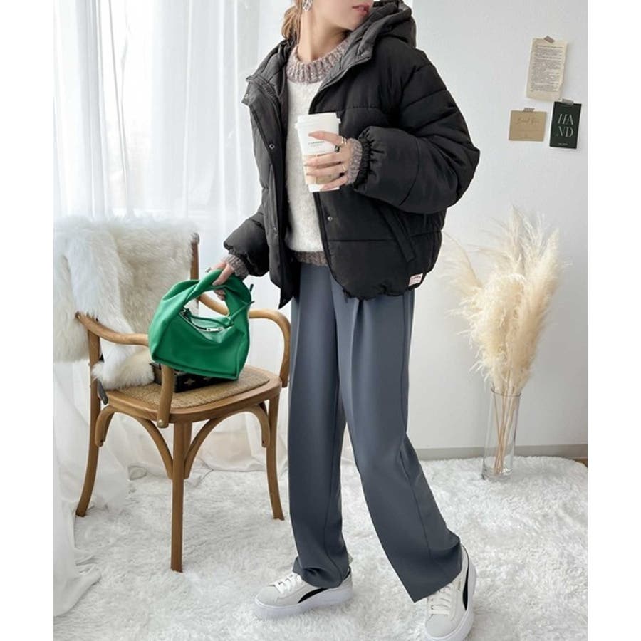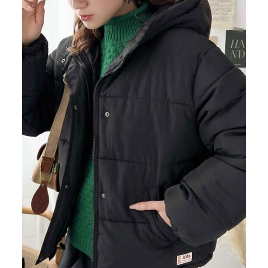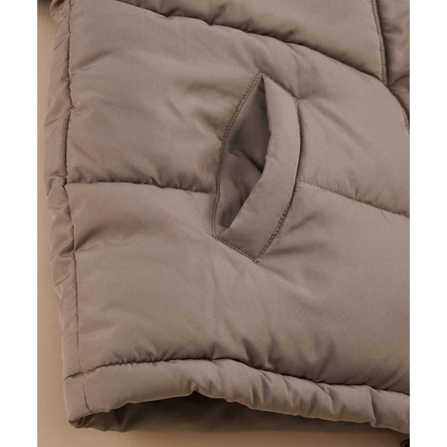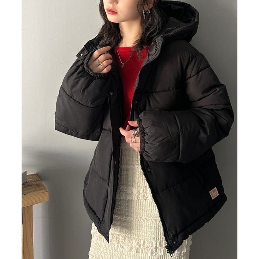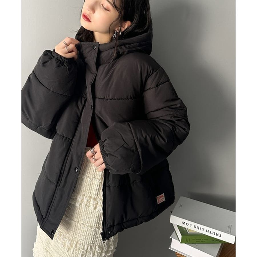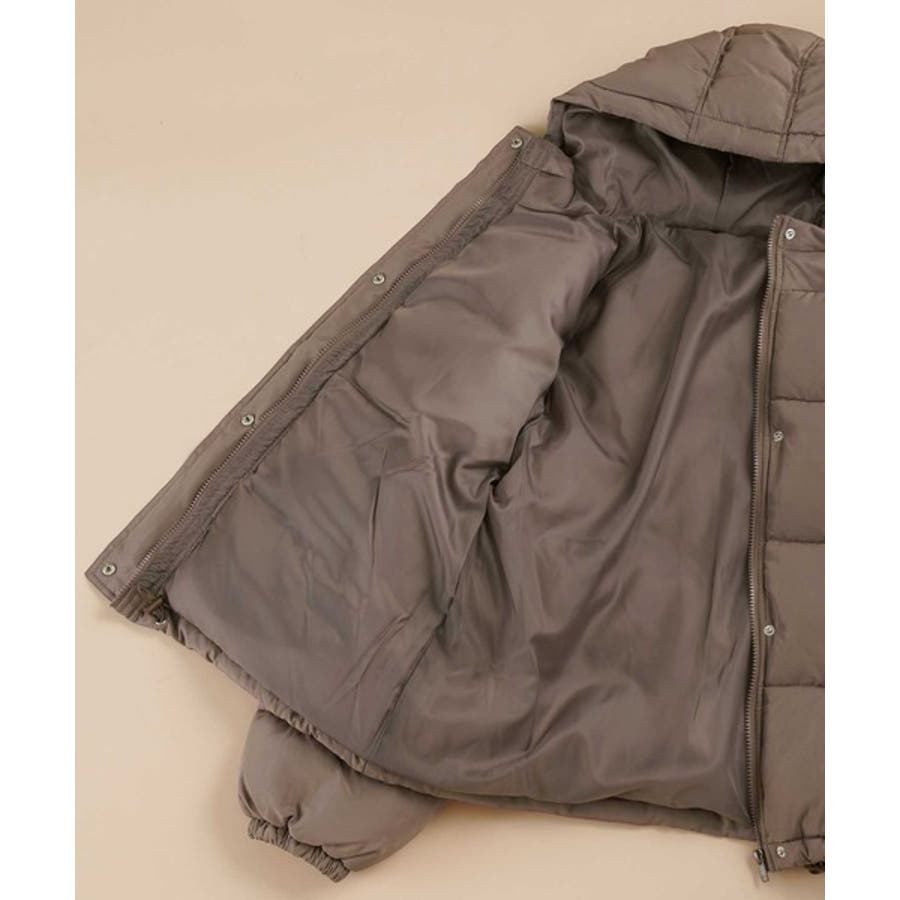 フード付きフェイクダウンコート。