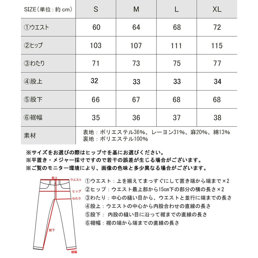 [Lサイズ]ウエスト:68cm/ヒップ:111cm/わたり:75cm/股上:33cm/股下:68cm/裾幅:37cm