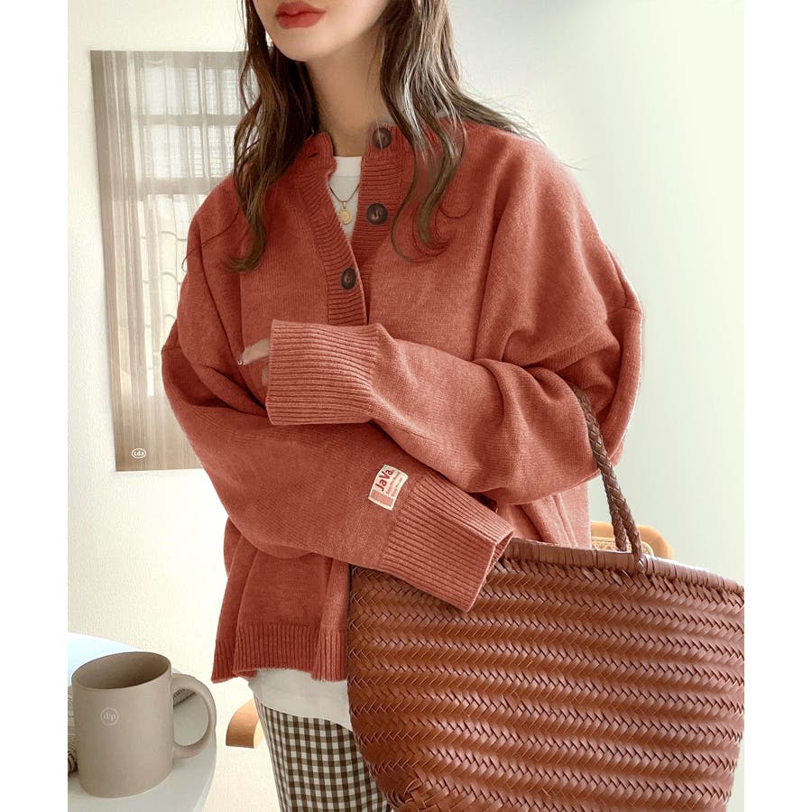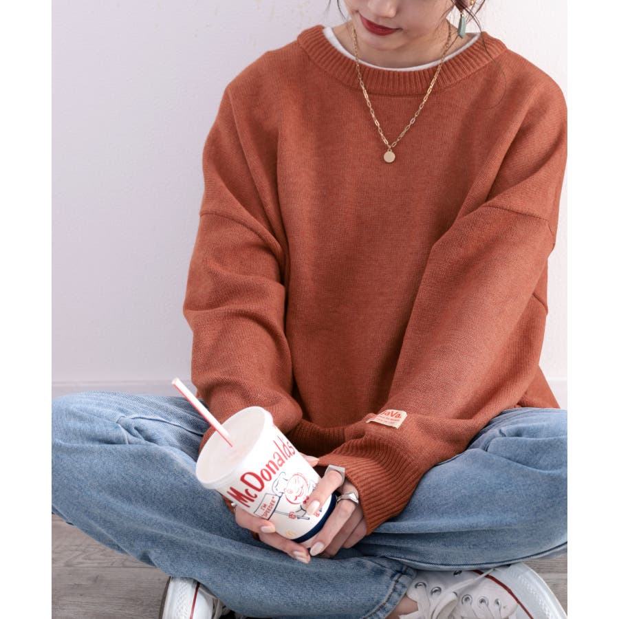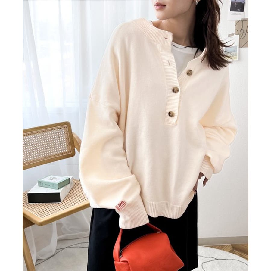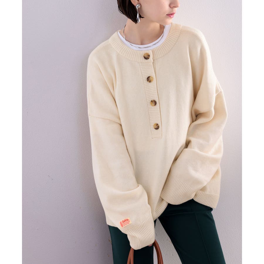 袖のJaVaタグがさり気ない、お洒落なバックヘンリーの2wayニットプルオーバー。