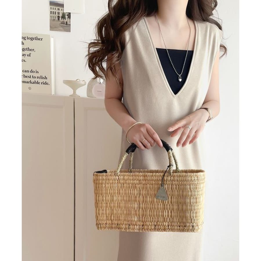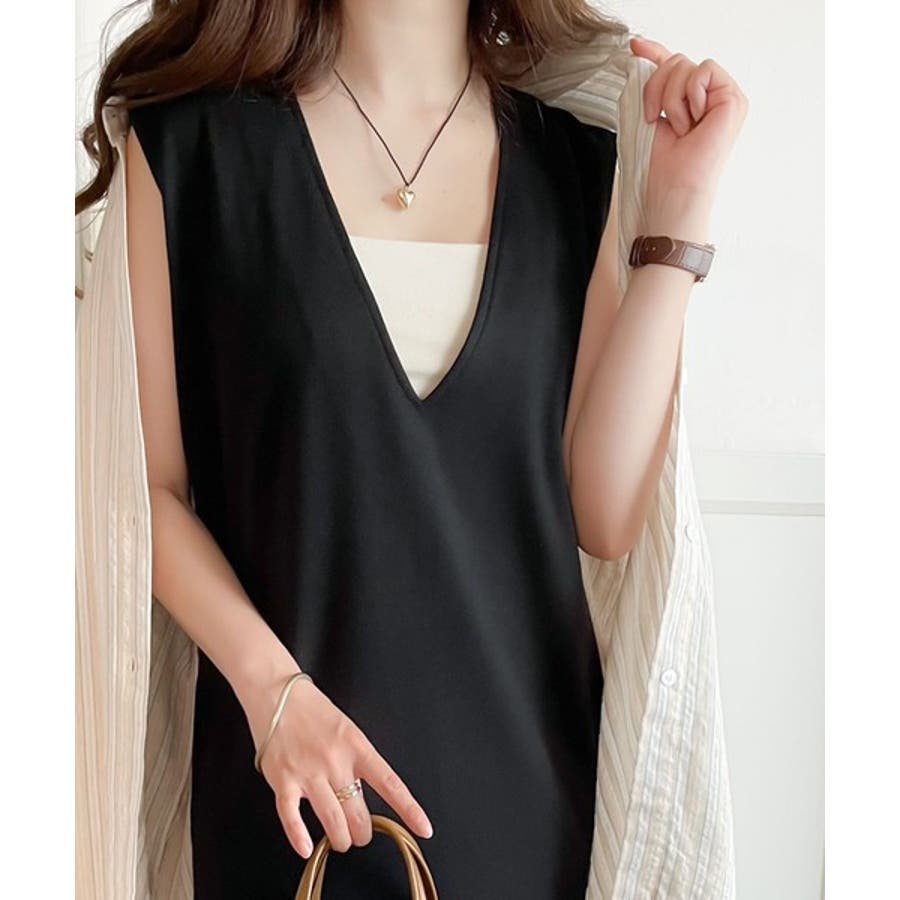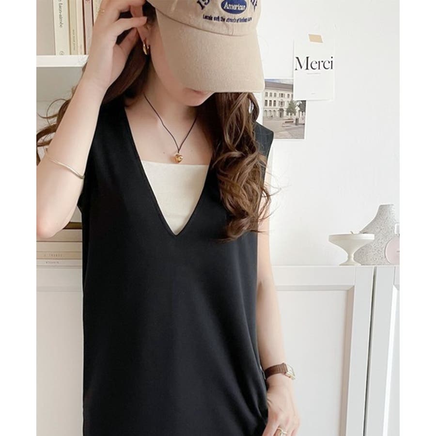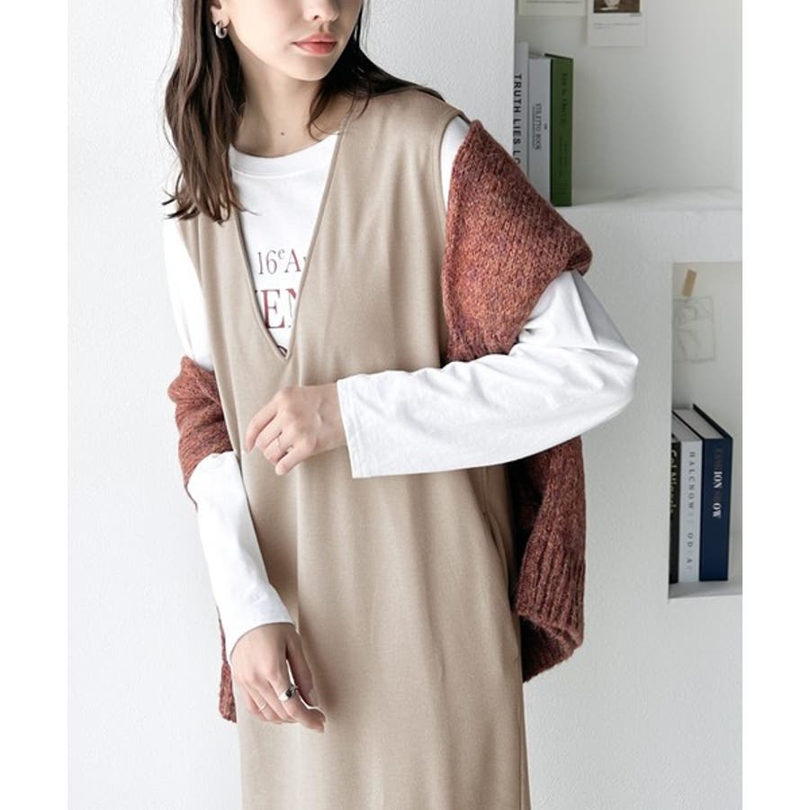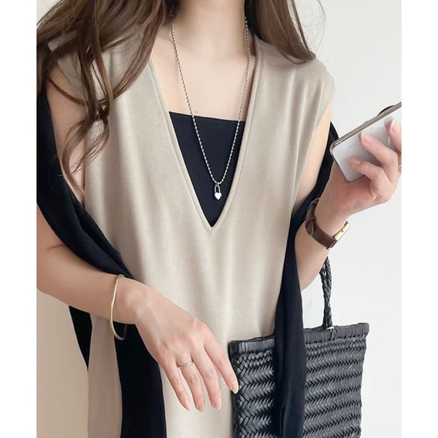 Vネックがカジュアルな中にもすっきりとした女性らしさをプラス。