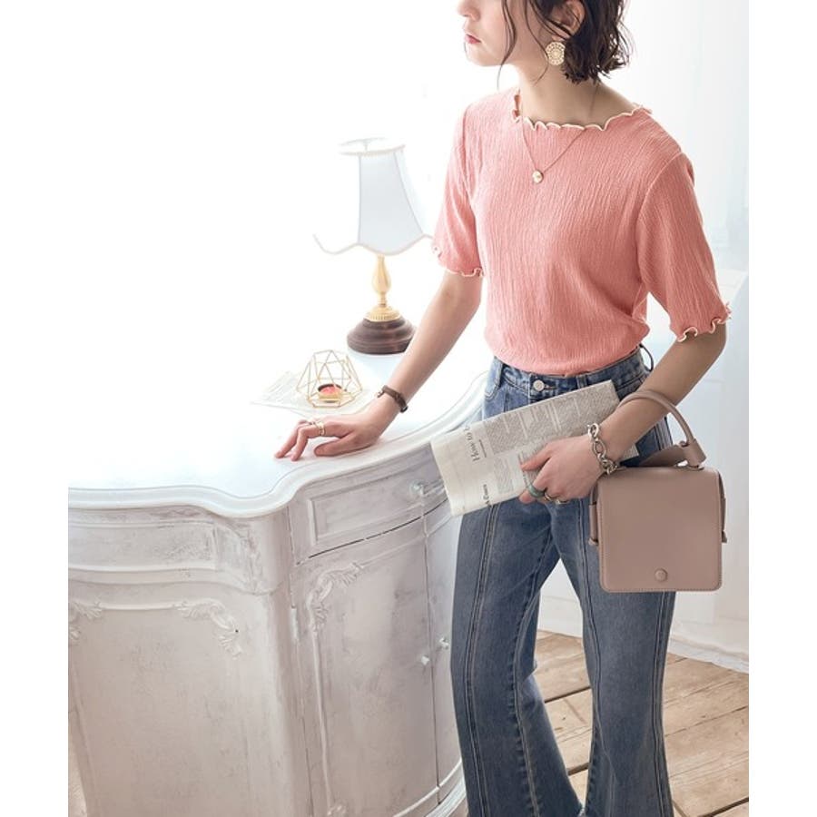 胸きゅん、褒められトップス。配色メロウ5分袖シャーリングトップス